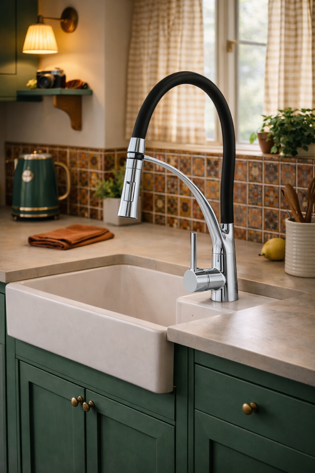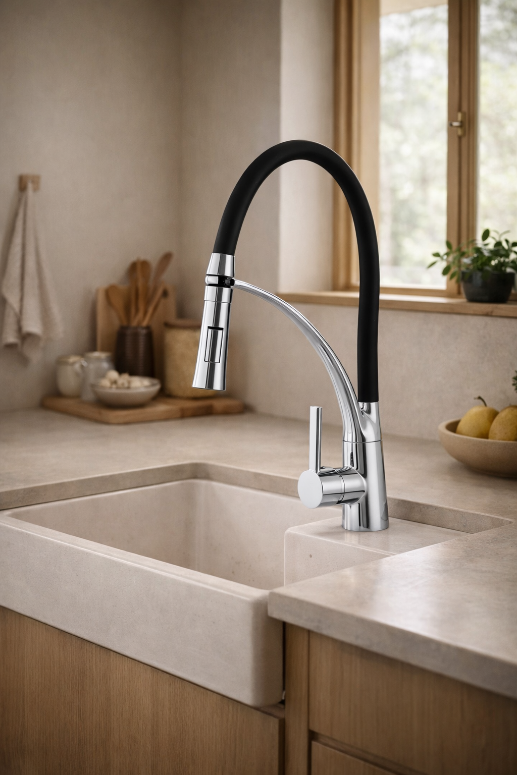 Elastyczna, wyciągana wylewka pozwala na swobodne kierowanie strumieniem wody, co znacząco ułatwia mycie naczyń, płukanie warzyw oraz napełnianie dużych garnków, a dwufunkcyjna słuchawka umożliwia szybkie przełączanie między strumieniem klasycznym a prysznicowym. Srebrny kolor nadaje baterii luksusowy, nowoczesny charakter i doskonale komponuje się z kuchniami w stylu loftowym, nowoczesnym oraz premium. Obrót wylewki 360°, ceramiczna głowica zapewniająca płynną regulację, a także wysoka odporność na przebarwienia i temperaturę sprawiają, że bateria jest nie tylko efektowna wizualnie, ale również trwała i wygodna w codziennym użytkowaniu.
