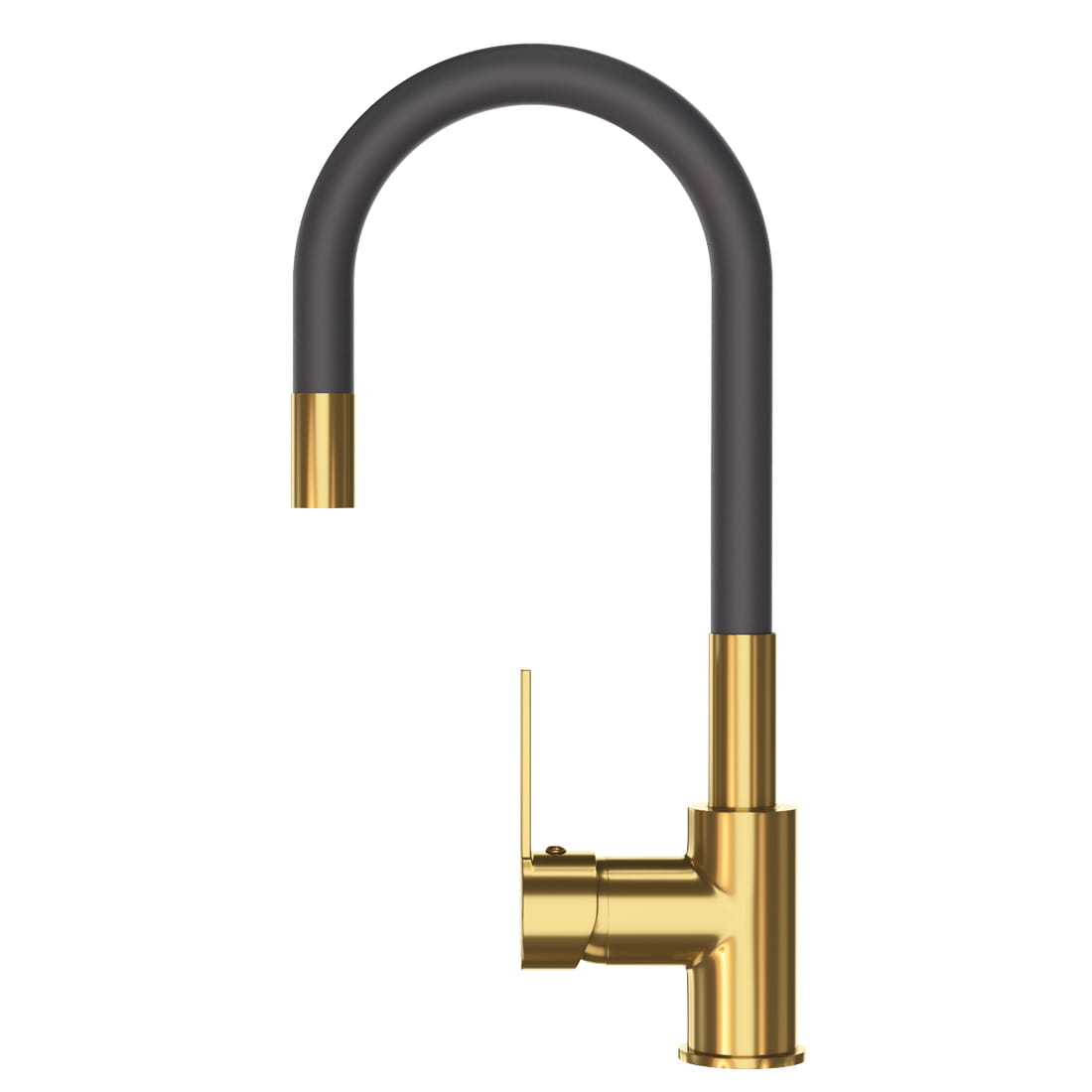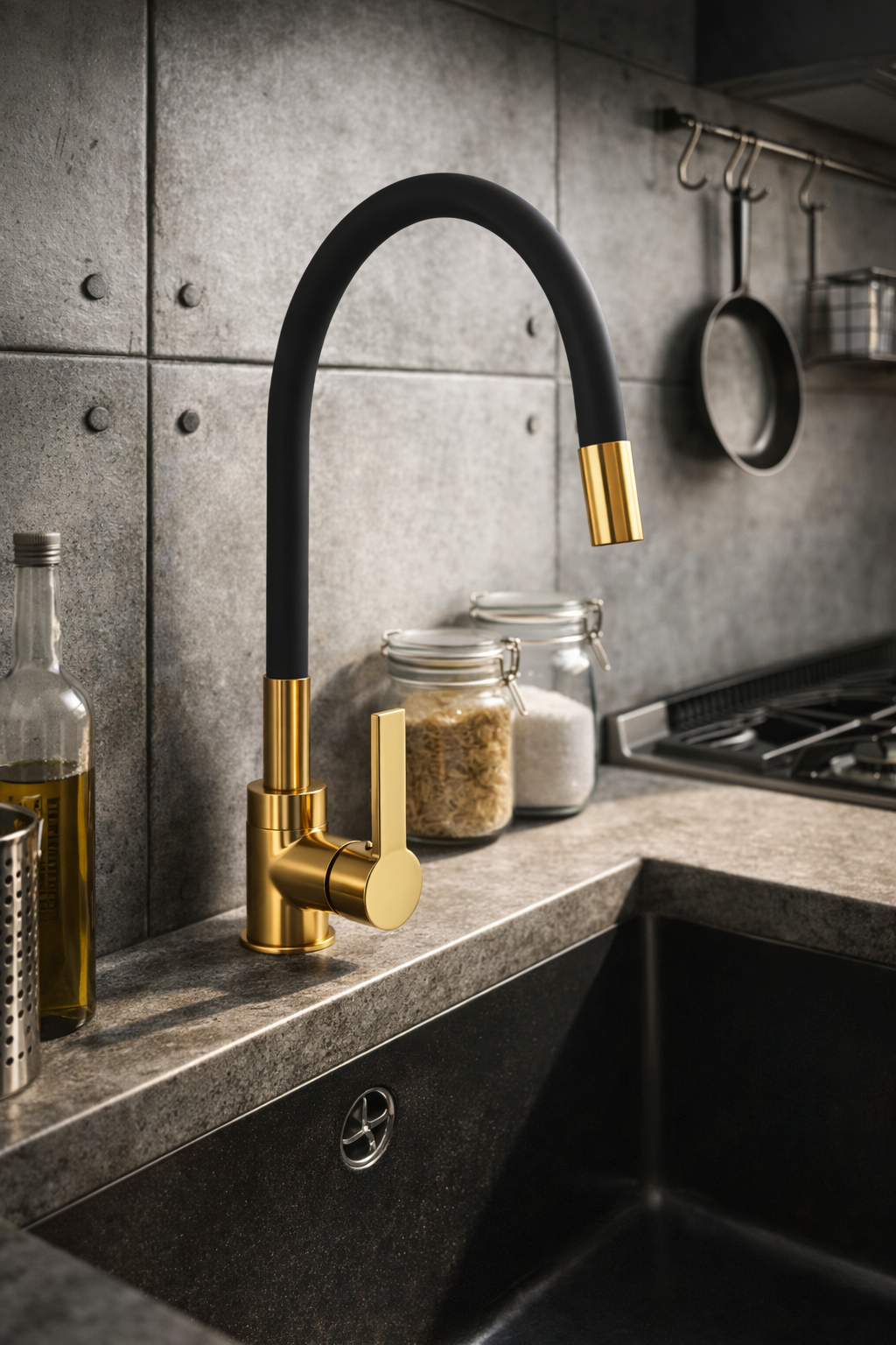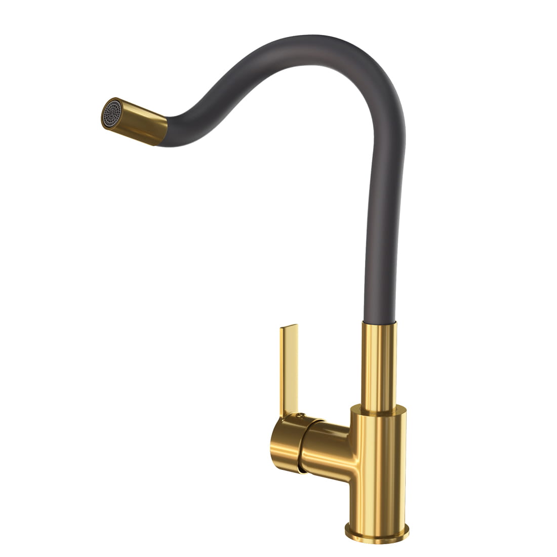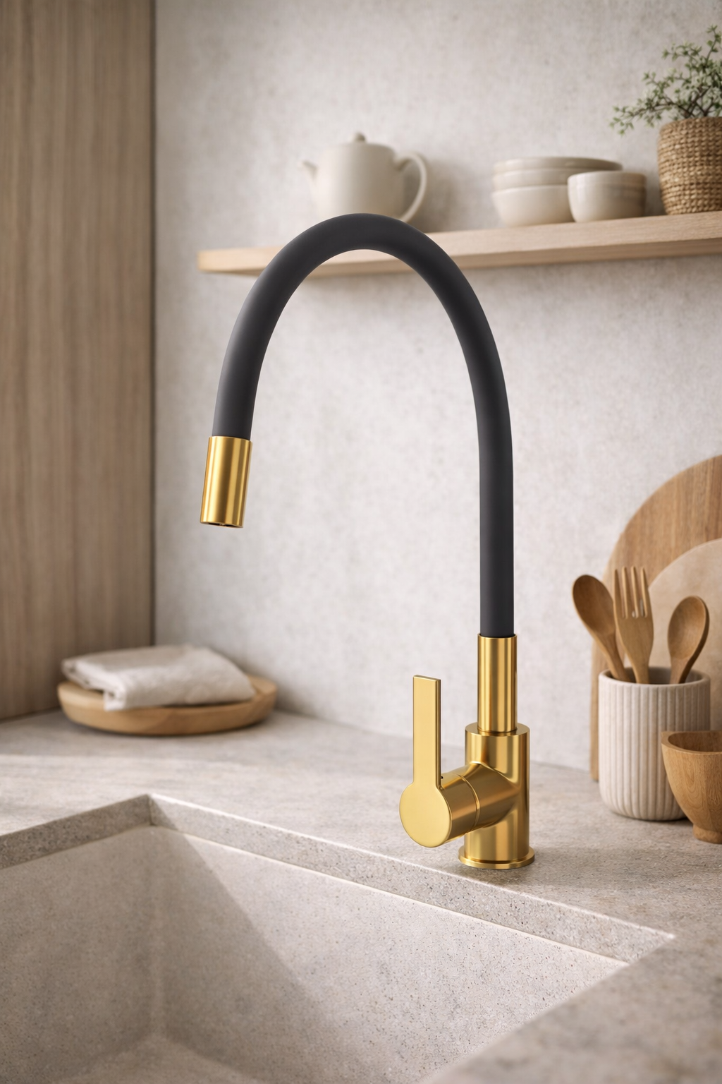 Złoty kolor nadaje kuchni świeżości oraz dynamicznego charakteru, stanowiąc efektowny akcent aranżacyjny. Solidny korpus z mosiądzuzapewnia trwałość i odporność na korozję nawet przy intensywnym, codziennym użytkowaniu. Zastosowana ceramiczna głowica gwarantuje płynną i precyzyjną regulację temperatury oraz siły strumienia wody. Powłoka baterii jest odporna na przebarwienia i działanie wysokiej temperatury, co pozwala zachować estetyczny wygląd przez długi czas. Elastyczna, obrotowa wylewka 360° umożliwia swobodne kierowanie strumienia wody w dowolne miejsce komory zlewu, zwiększając komfort pracy. Regulowana wysokość (maksymalnie do 54 cm) pozwala dopasować ustawienie baterii do indywidualnych potrzeb użytkownika oraz wielkości naczyń.