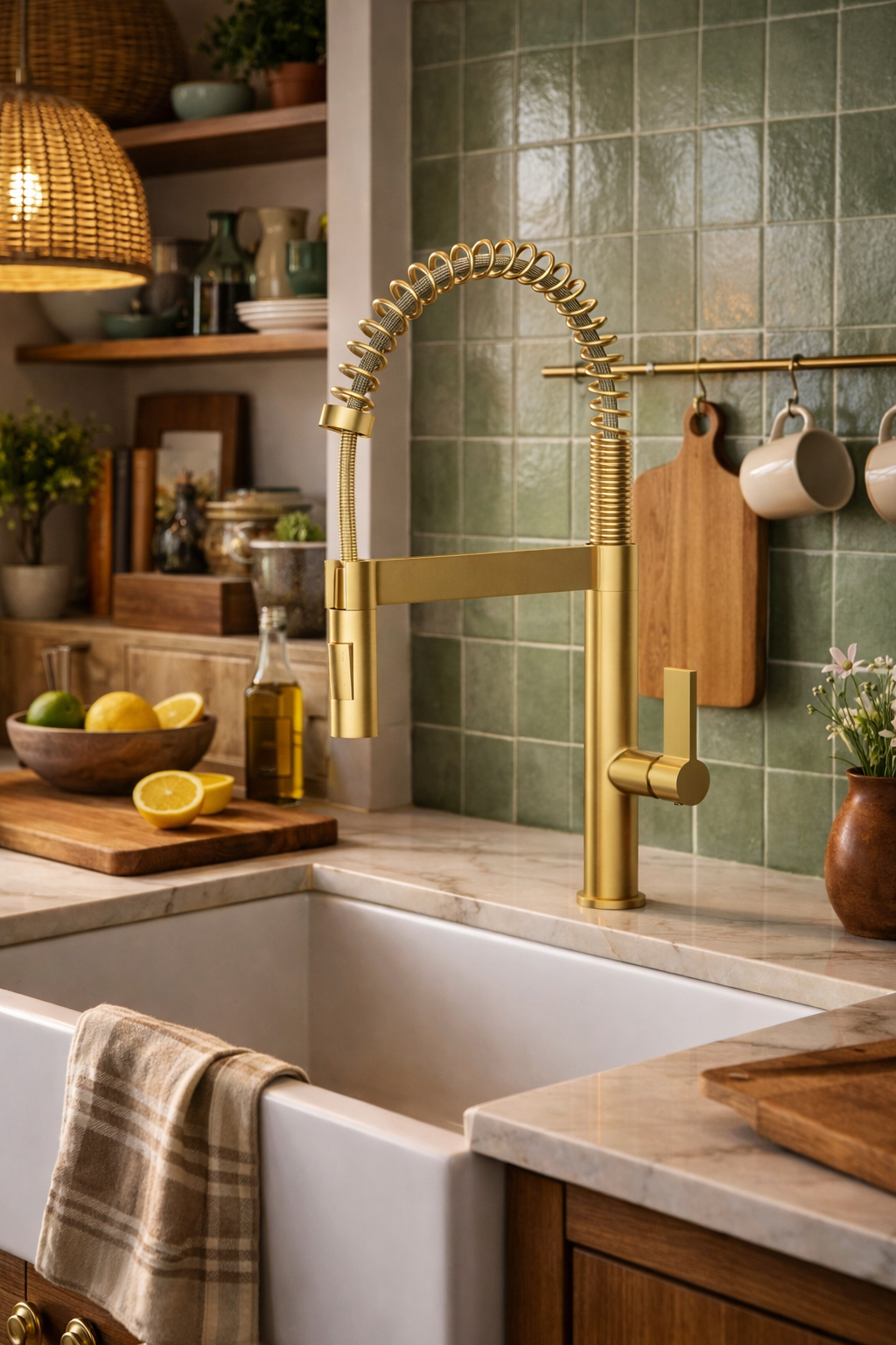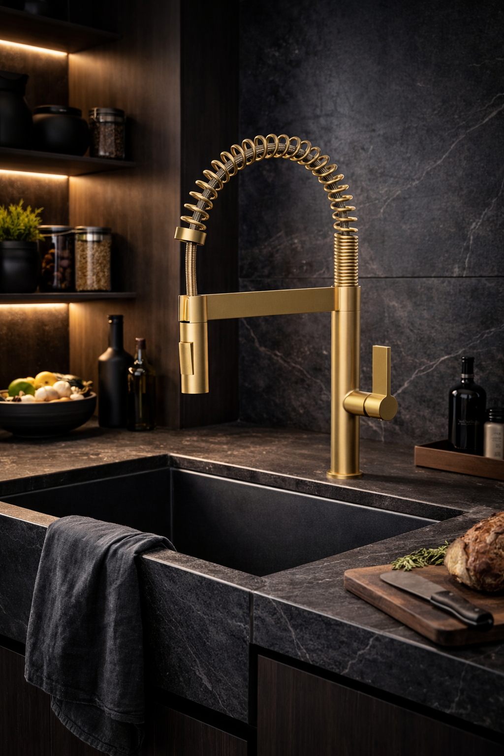 Wysoka konstrukcja oraz spiralna, elastyczna wylewka zapewniają pełną swobodę ruchu i łatwy dostęp do całej powierzchni zlewu, co znacząco ułatwia mycie naczyń, dużych garnków oraz płukanie produktów spożywczych. Wyciągana słuchawka z dwoma trybami strumienia pozwala szybko przełączać się pomiędzy strumieniem klasycznym a natryskowym, zwiększając funkcjonalność baterii w każdej sytuacji. Złote wykończenie nadaje całości nowoczesny, elegancki wygląd i sprawia, że bateria doskonale komponuje się z kuchniami w stylu loftowym, industrialnym i nowoczesnym. Solidna konstrukcja gwarantuje trwałość, odporność na intensywne użytkowanie oraz łatwe utrzymanie czystości, a wysoka forma zapewnia komfort nawet przy pracy z dużymi naczyniami.