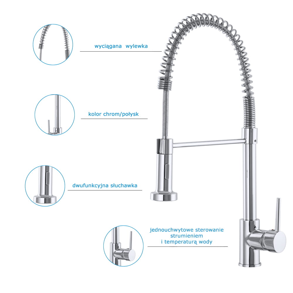 Bateria kuchenna spiralna wyciągana wylewka kran zlewozmywakowy chrom DACO