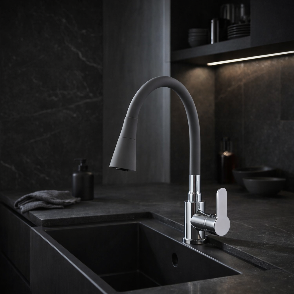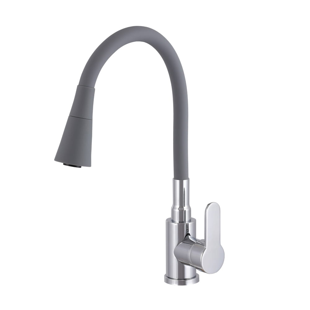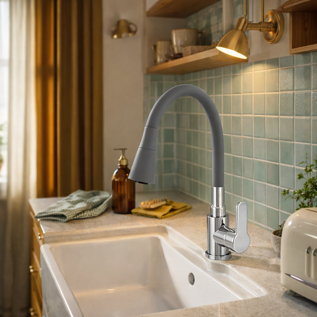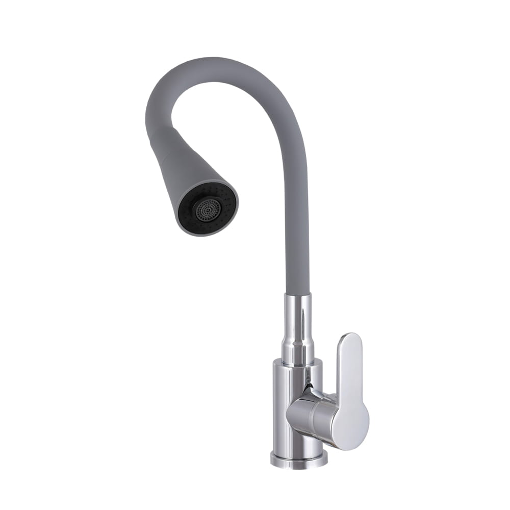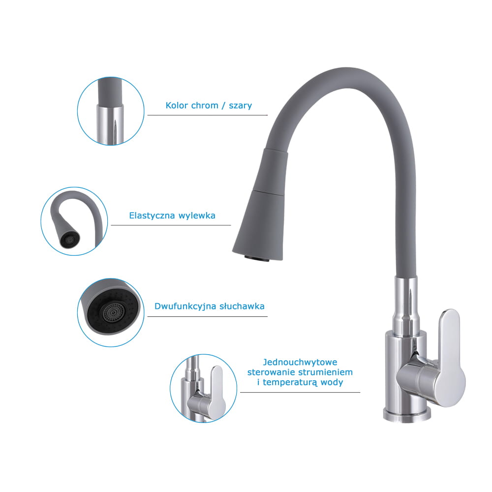 Model ten wyposażono w elastyczną, giętką wylewkę z pełnym obrotem 360°, która umożliwia swobodne kierowanie strumieniem wody oraz łatwe dopasowanie wysokości do aktualnych potrzeb – od mycia drobnych naczyń po napełnianie dużych garnków. Jednouchwytowa obsługa pozwala na płynną i precyzyjną regulację temperatury oraz przepływu wody, a zastosowana ceramiczna głowica gwarantuje trwałość i bezawaryjne działanie przez długi czas. Połączenie szarej wylewki z chromowanymi detalami nadaje baterii świeży, uniwersalny wygląd, który doskonale pasuje zarówno do kuchni nowoczesnych, jak i klasycznych aranżacji.