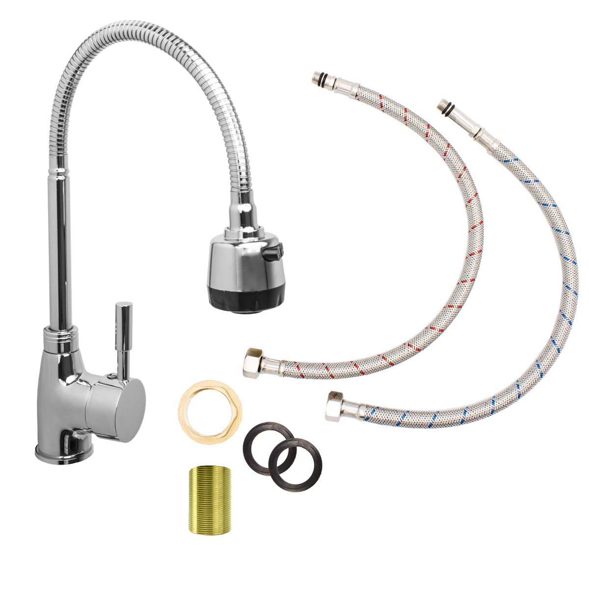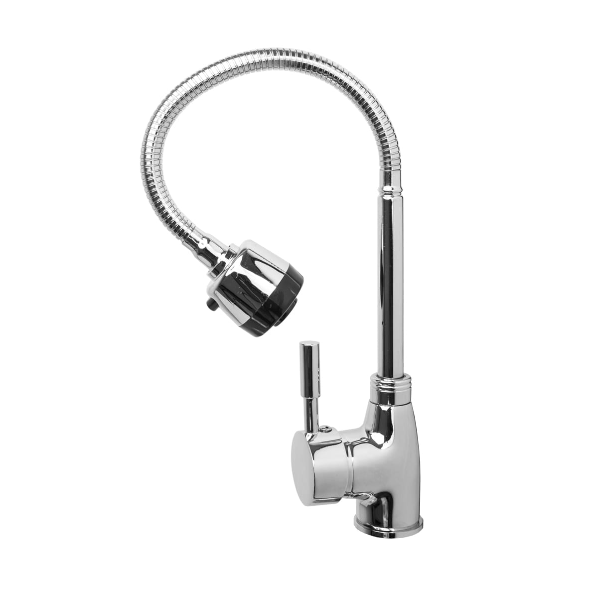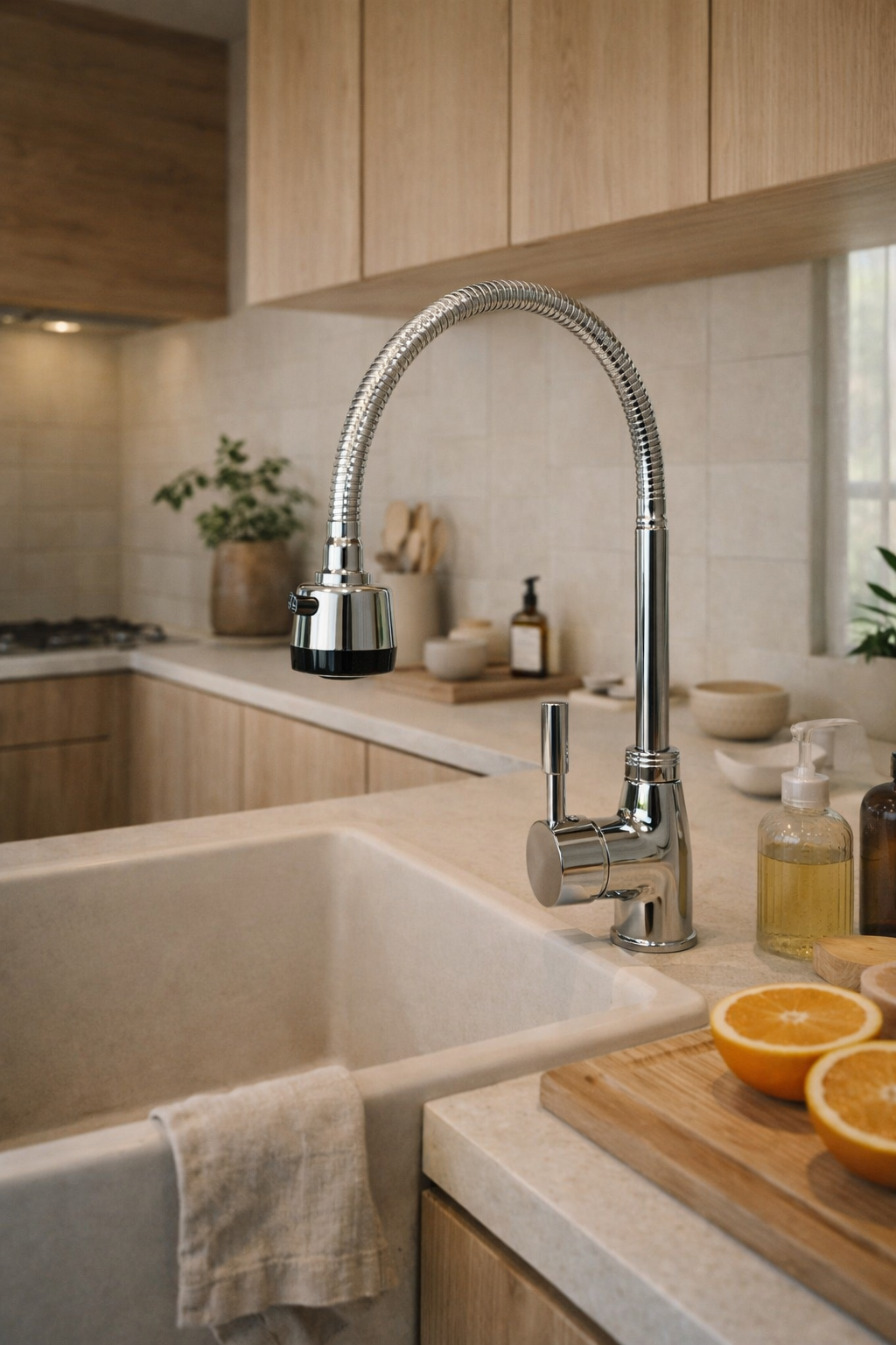Wyposażona w elastyczną, giętką wylewkę, pozwala na pełną swobodę ruchu i precyzyjne kierowanie strumieniem wody, co znacząco ułatwia mycie naczyń, płukanie warzyw oraz napełnianie większych garnków. Dwufunkcyjna słuchawka umożliwia szybkie przełączanie pomiędzy strumieniem klasycznym a prysznicowym, zwiększając komfort pracy przy zlewie. Dzięki obrotowej konstrukcji 360° bateria sprawdzi się zarówno przy jedno-, jak i dwukomorowych zlewach. Solidny korpus z mosiądzu oraz ceramiczna głowica gwarantują trwałość, szczelność i płynną regulację temperatury wody przez długi czas. Chromowana powierzchnia jest odporna na zarysowania, wysoką temperaturę oraz łatwa w utrzymaniu czystości, a nowoczesny design sprawia, że bateria doskonale komponuje się z kuchniami w stylu nowoczesnym, loftowym i minimalistycznym.