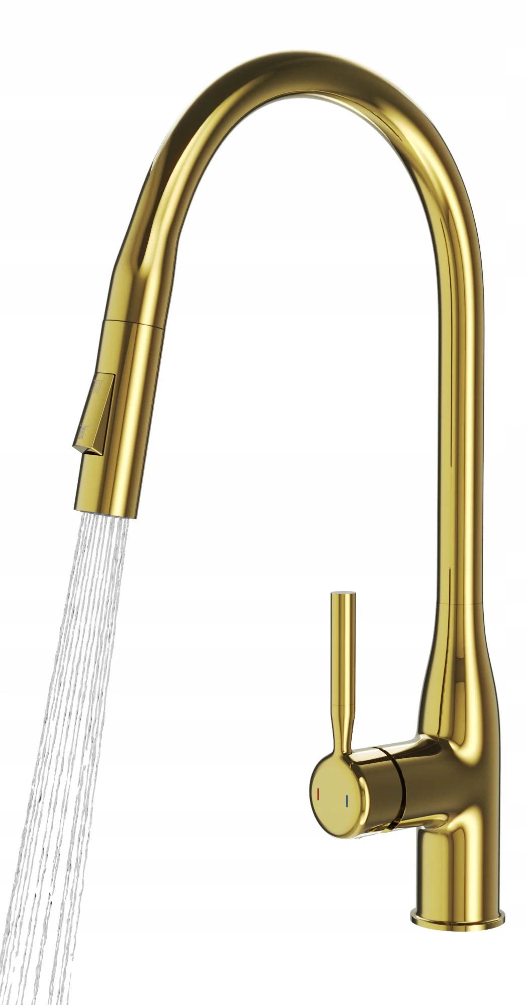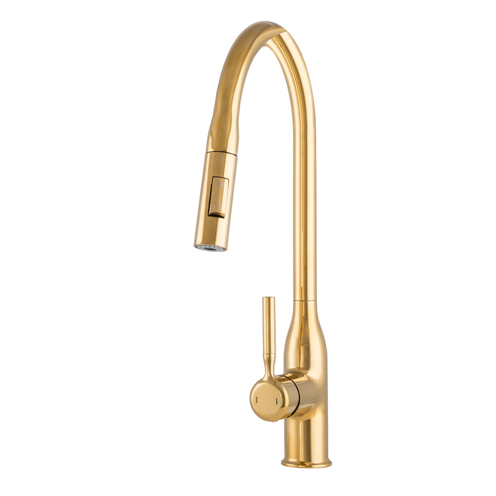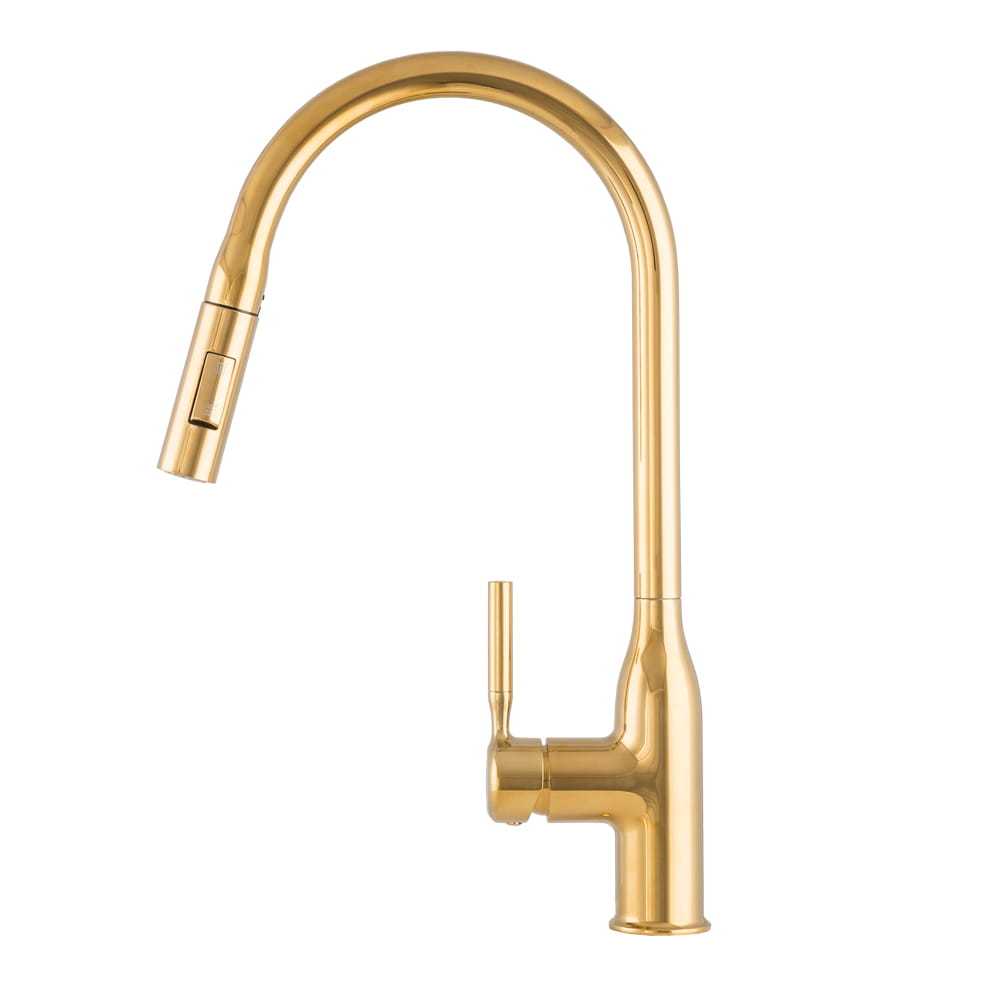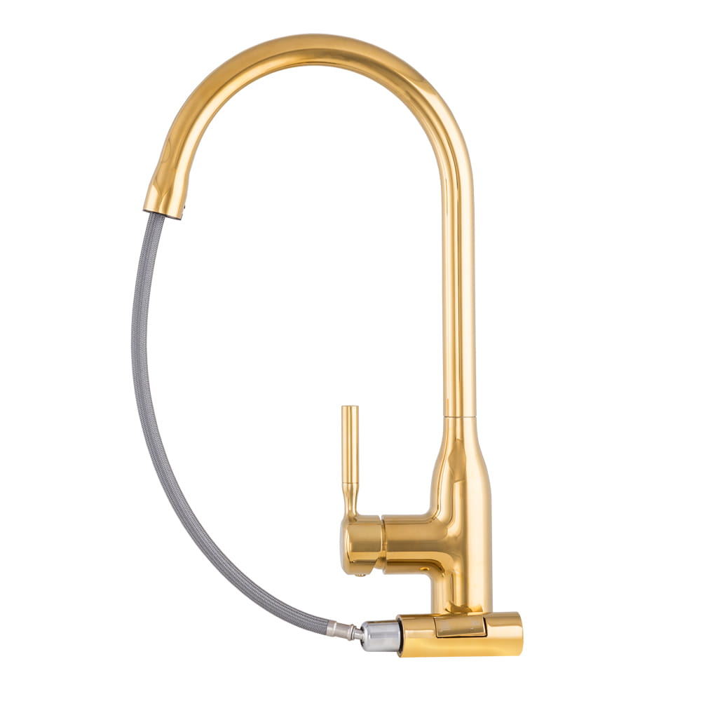 Model ten został wyposażony w wyciąganą i obrotową wylewkę, która zapewnia pełną swobodę ruchu oraz ułatwia mycie naczyń, płukanie produktów i czyszczenie zlewu, a dwufunkcyjna słuchawka pozwala szybko przełączać strumień między trybem standardowym a prysznicowym. Złoty kolor nadaje baterii elegancki, nowoczesny charakter, idealnie pasujący do kuchni loftowych, industrialnych i minimalistycznych. Solidny mosiężny korpus gwarantuje trwałość i odporność na uszkodzenia, a ceramiczna głowica zapewnia płynną i precyzyjną regulację temperatury oraz strumienia wody. Powłoka odporna na wysoką temperaturę i przebarwienia sprawia, że bateria zachowuje estetyczny wygląd przez długi czas.