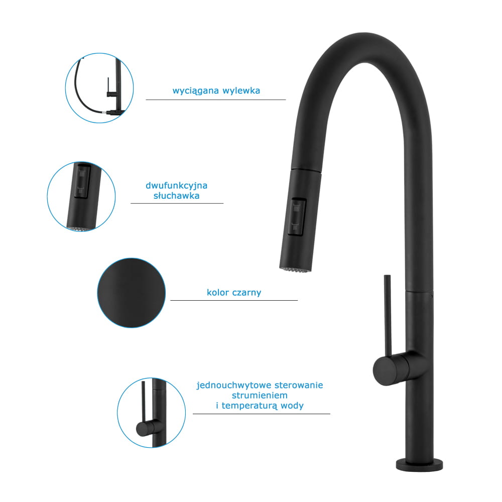 Model wyróżnia się smukłym, minimalistycznym designem oraz czarnym wykończeniem, które nadaje wnętrzu lekkości i ponadczasowej estetyki. Wyciągana, obrotowa wylewka zapewnia większy zasięg i swobodę ruchu, a dwufunkcyjna słuchawka umożliwia szybkie przełączanie pomiędzy strumieniem laminarnym, idealnym do napełniania naczyń, a trybem prysznicowym (deszczowym), który ułatwia płukanie produktów i mycie zlewu. Zastosowana ceramiczna głowica gwarantuje płynną regulację temperatury i przepływu wody, a odporna powłokazabezpiecza baterię przed przebarwieniami i działaniem wysokiej temperatury, zachowując estetyczny wygląd na długi czas. To idealny wybór dla osób ceniących funkcjonalność, wygodę użytkowania i spójny wygląd strefy kuchennej.