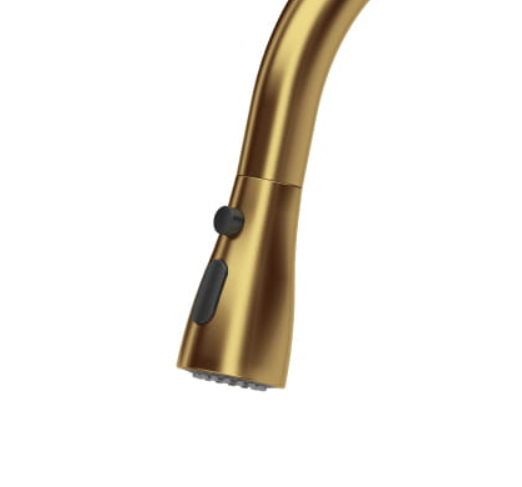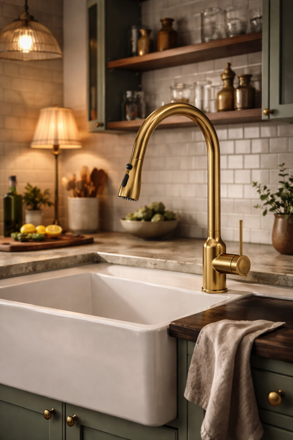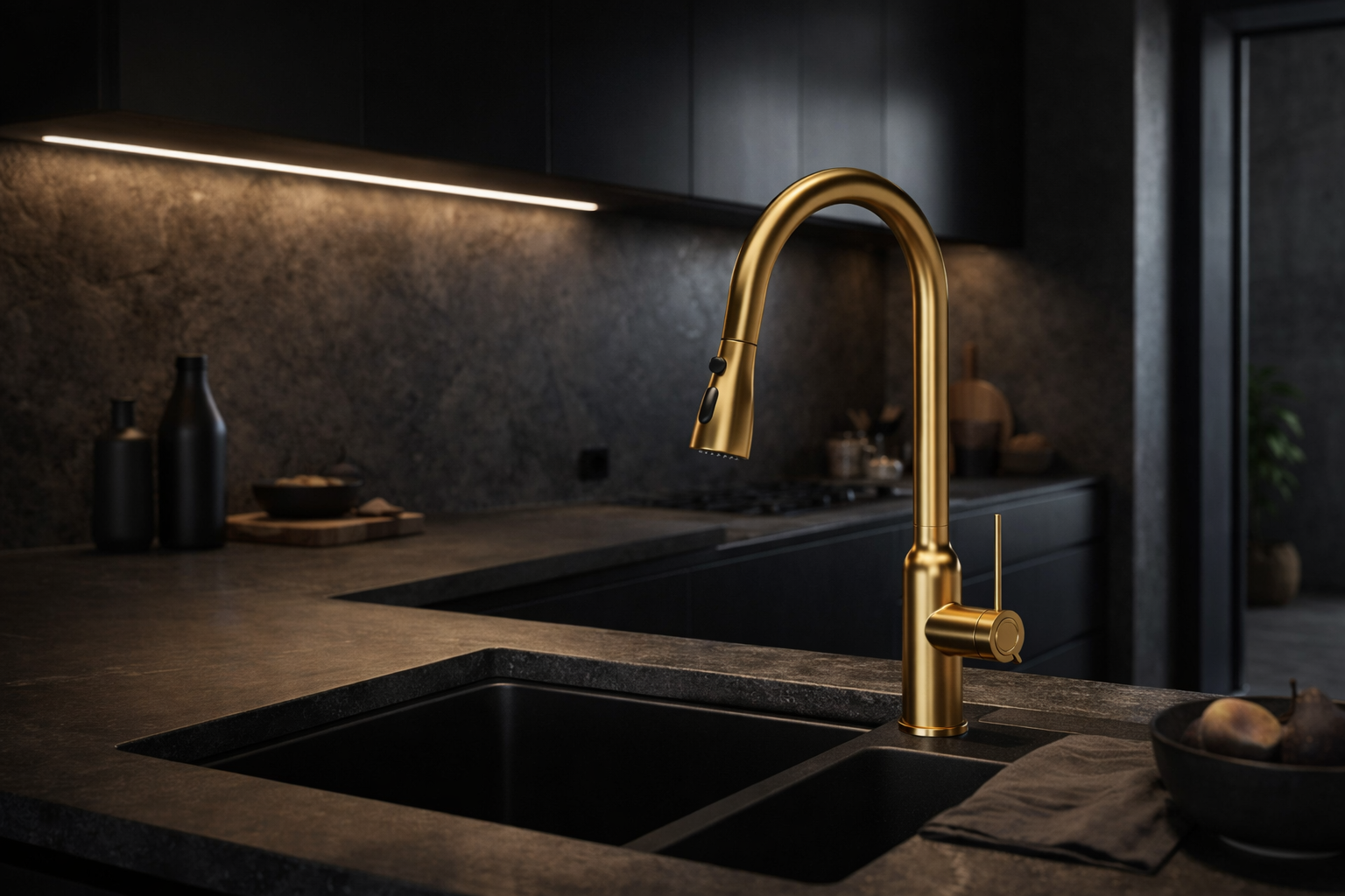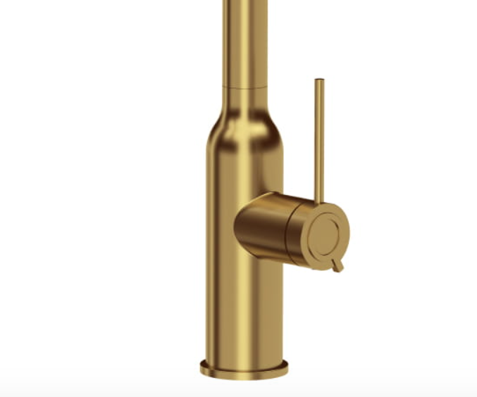 Bateria kuchenna stojąca z wyciąganą wylewką BASSO to eleganckie i funkcjonalne rozwiązanie do nowoczesnych kuchni, w których liczy się komfort pracy i dopracowany design. Złote wykończenie nadaje wnętrzu luksusowy charakter, a nowoczesna forma doskonale komponuje się zarówno ze zlewami prostokątnymi, jak i okrągłymi.