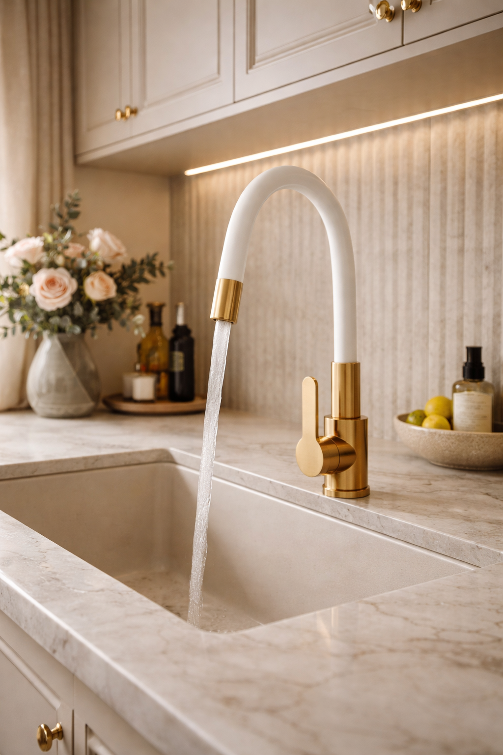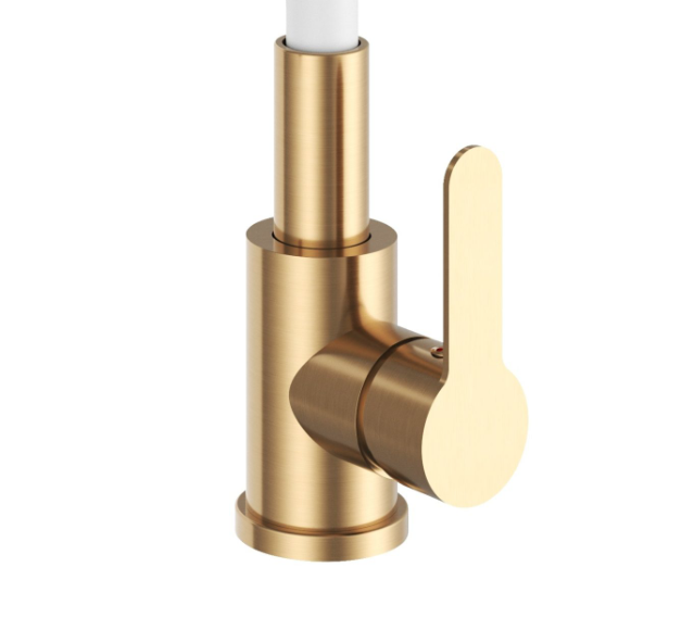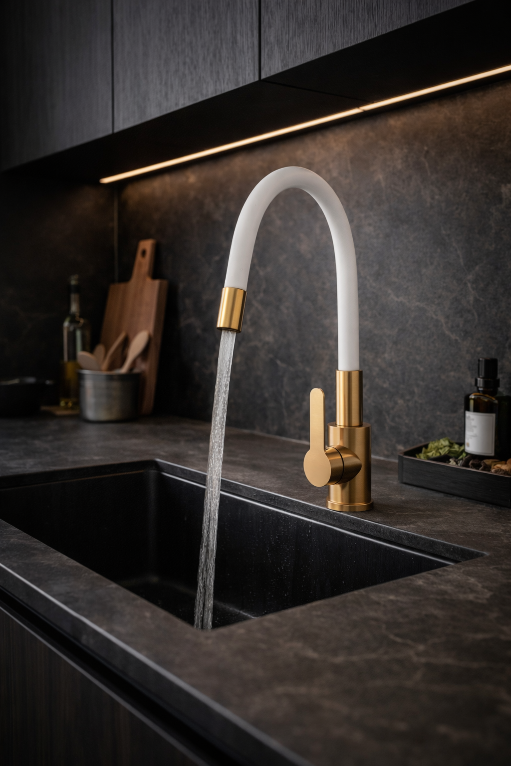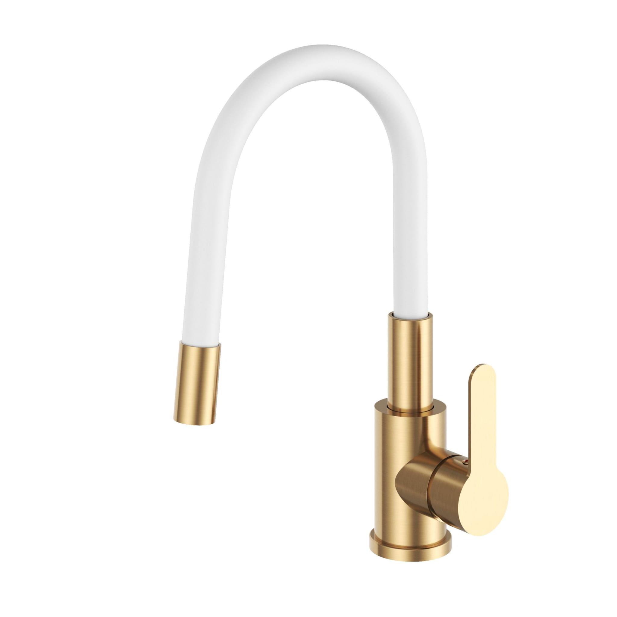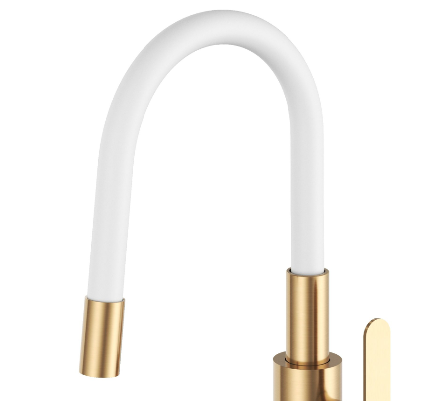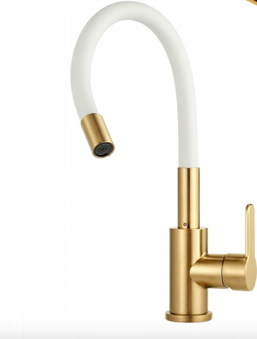 Zastosowana elastyczna wylewka umożliwia swobodne formowanie i precyzyjne kierowanie strumieniem wody, co znacząco ułatwia mycie naczyń, płukanie produktów oraz napełnianie wysokich pojemników. Obrotowa konstrukcja oraz regulowana wysokość baterii pozwalają idealnie dopasować jej ustawienie do aktualnych potrzeb, zwiększając ergonomię i komfort pracy przy zlewie. Wykończenie w kolorze biało złotym nadaje baterii nowoczesny, profesjonalny charakter, który doskonale komponuje się z aranżacjami industrialnymi, loftowymi i minimalistycznymi, a także z wnętrzami użytkowymi, takimi jak salony fryzjerskie czy kosmetyczne.
