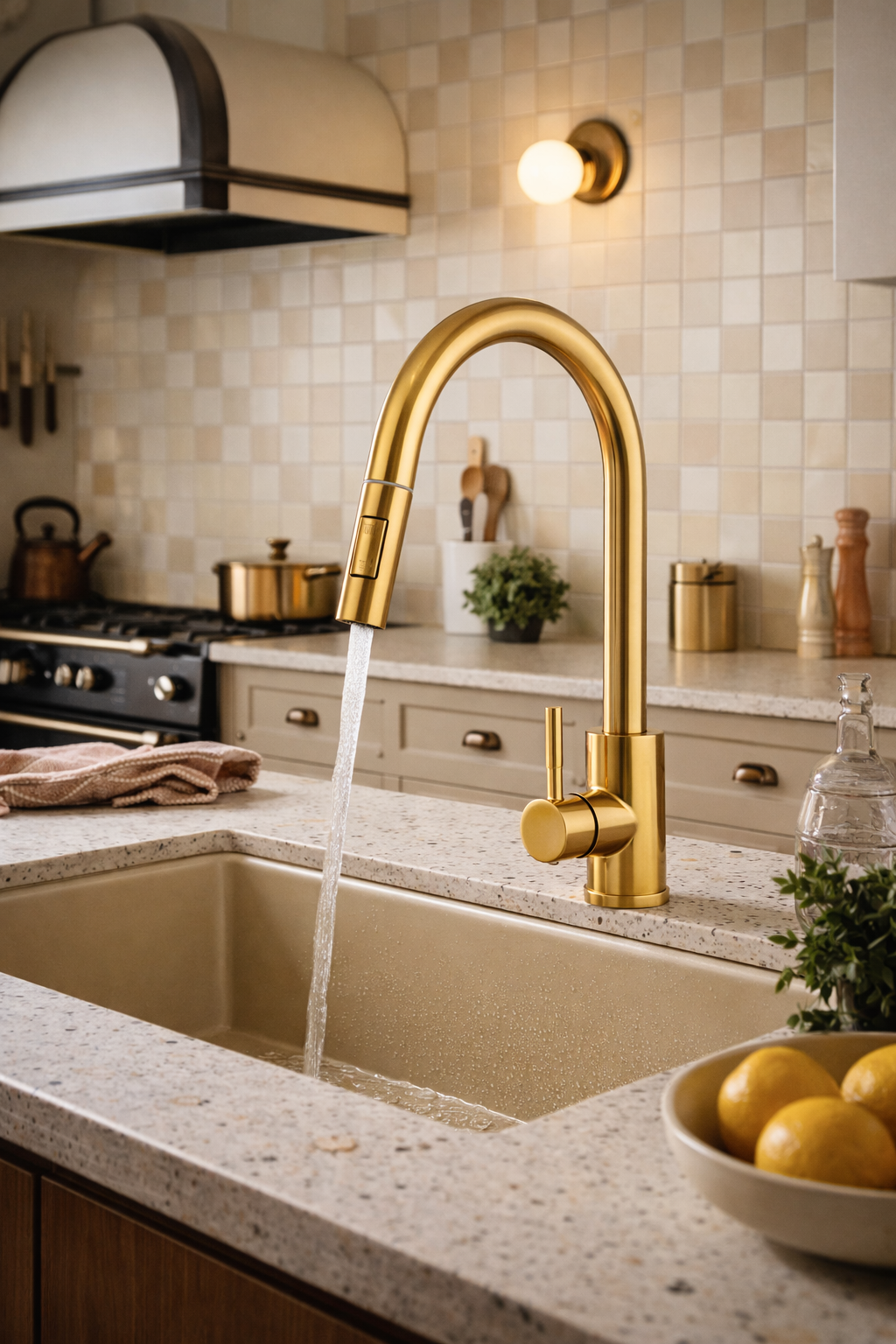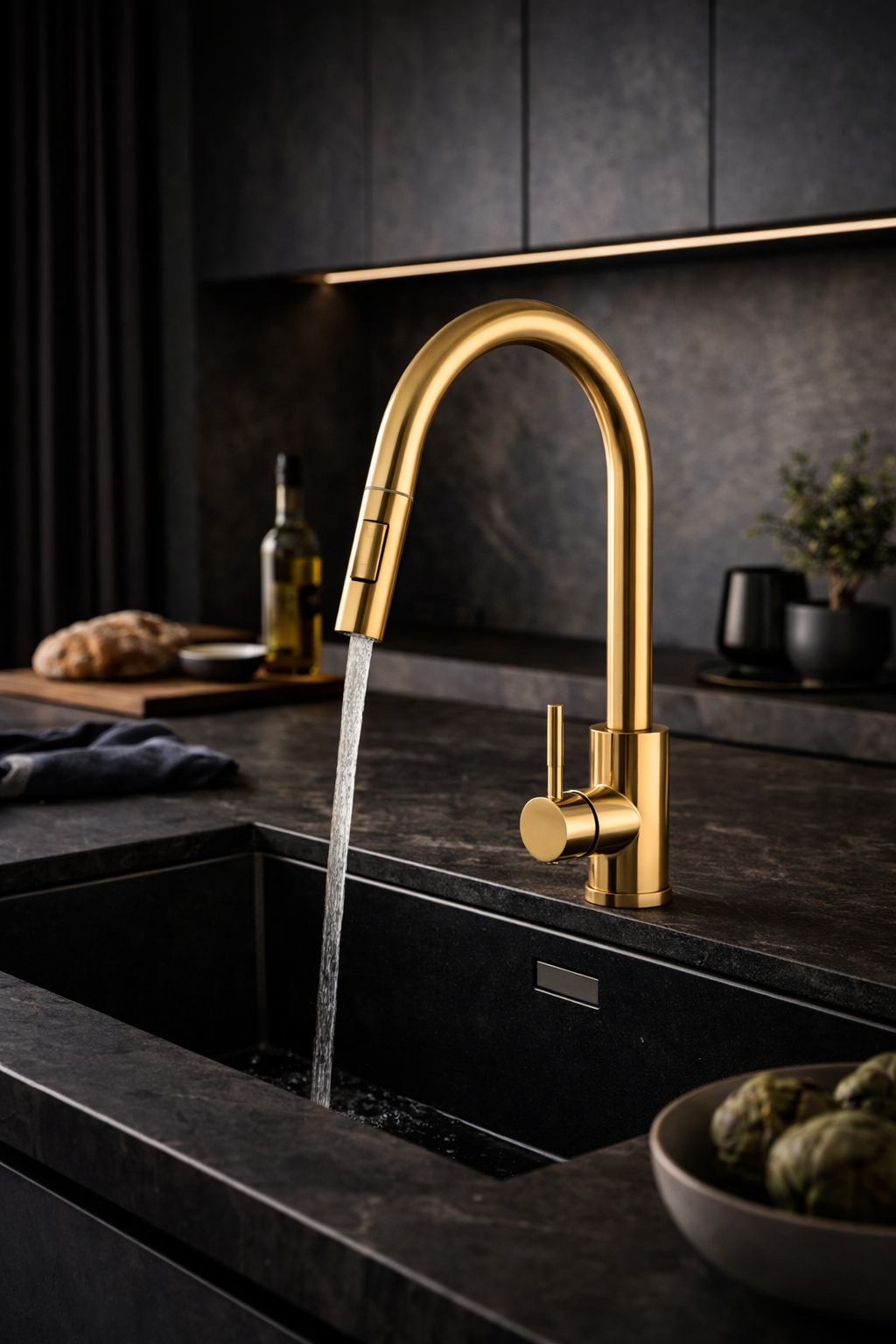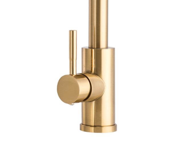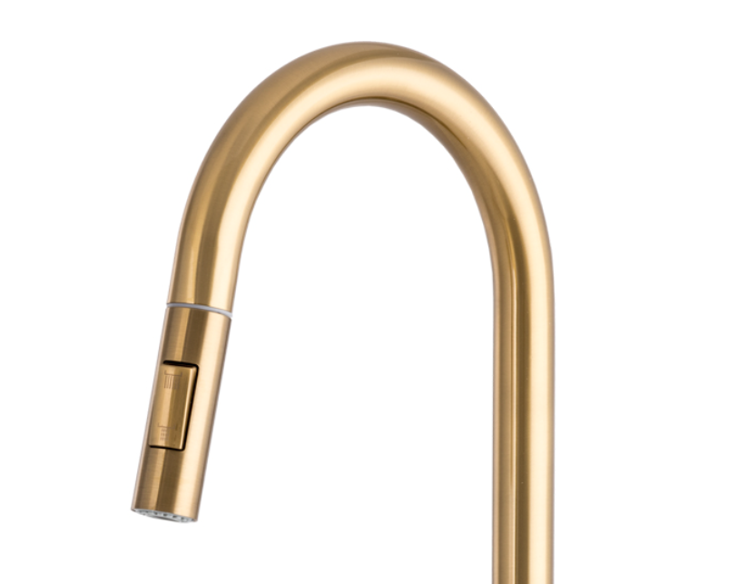 Model ten wyróżnia się wyciąganą wylewką, która znacząco ułatwia mycie naczyń, płukanie zlewu oraz napełnianie większych garnków, a także dwoma trybami strumienia wody – klasycznym strumieniem laminarnym do codziennych prac oraz trybem prysznicowym (spray) idealnym do szybkiego płukania i czyszczenia większych powierzchni. Szczotkowane złote wykończenie z delikatną, kamienną strukturą nadaje baterii ciepły, naturalny charakter, który doskonale komponuje się z kuchniami nowoczesnymi, klasycznymi i skandynawskimi.