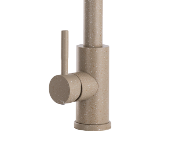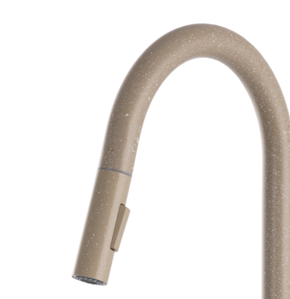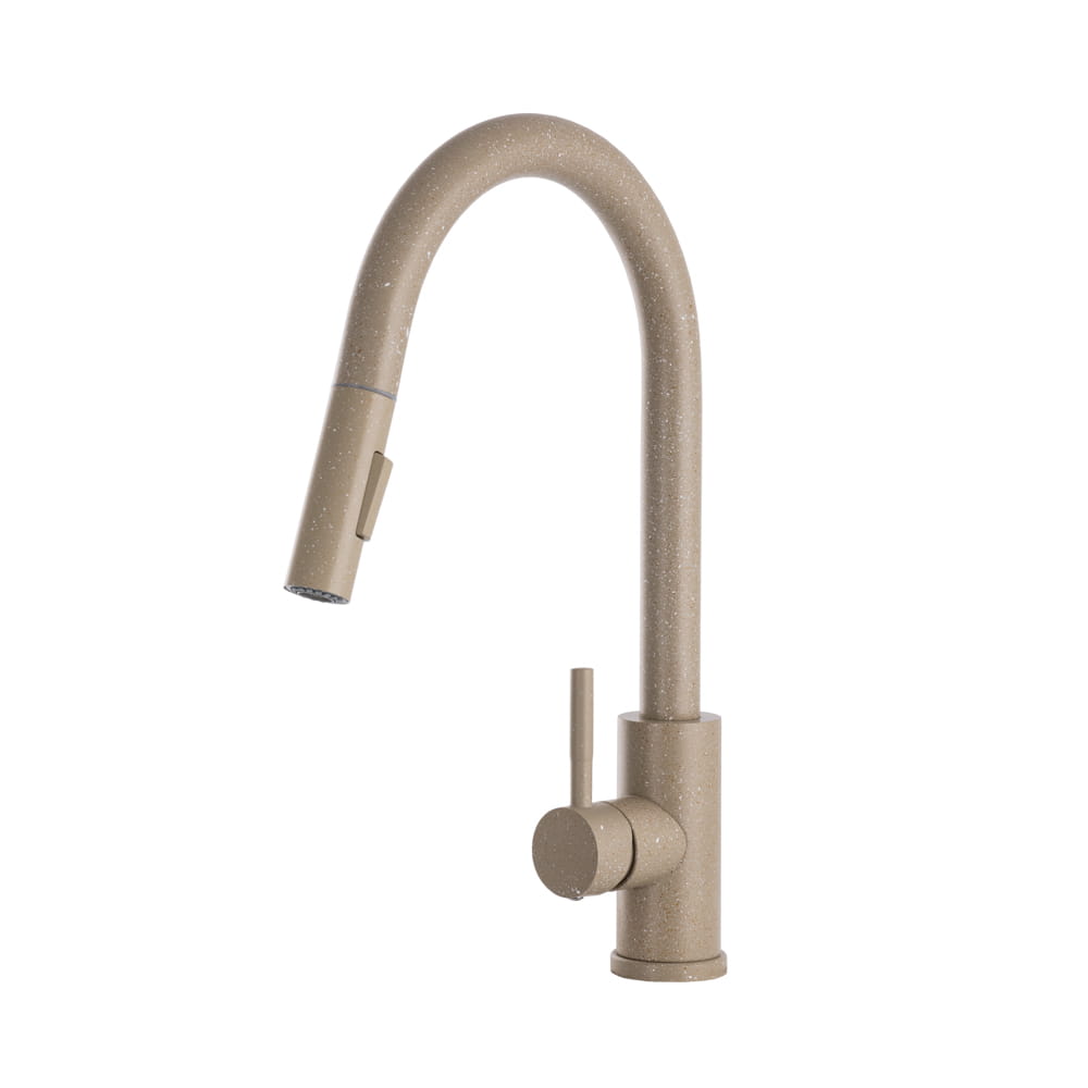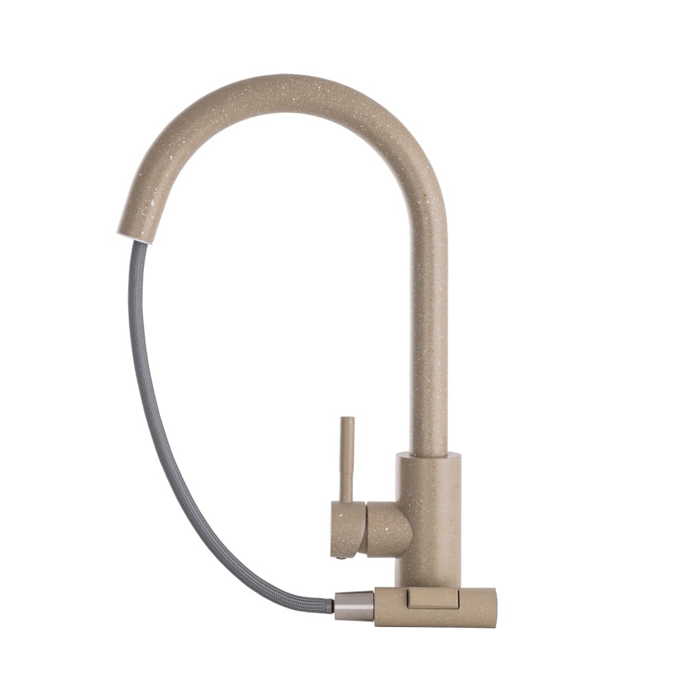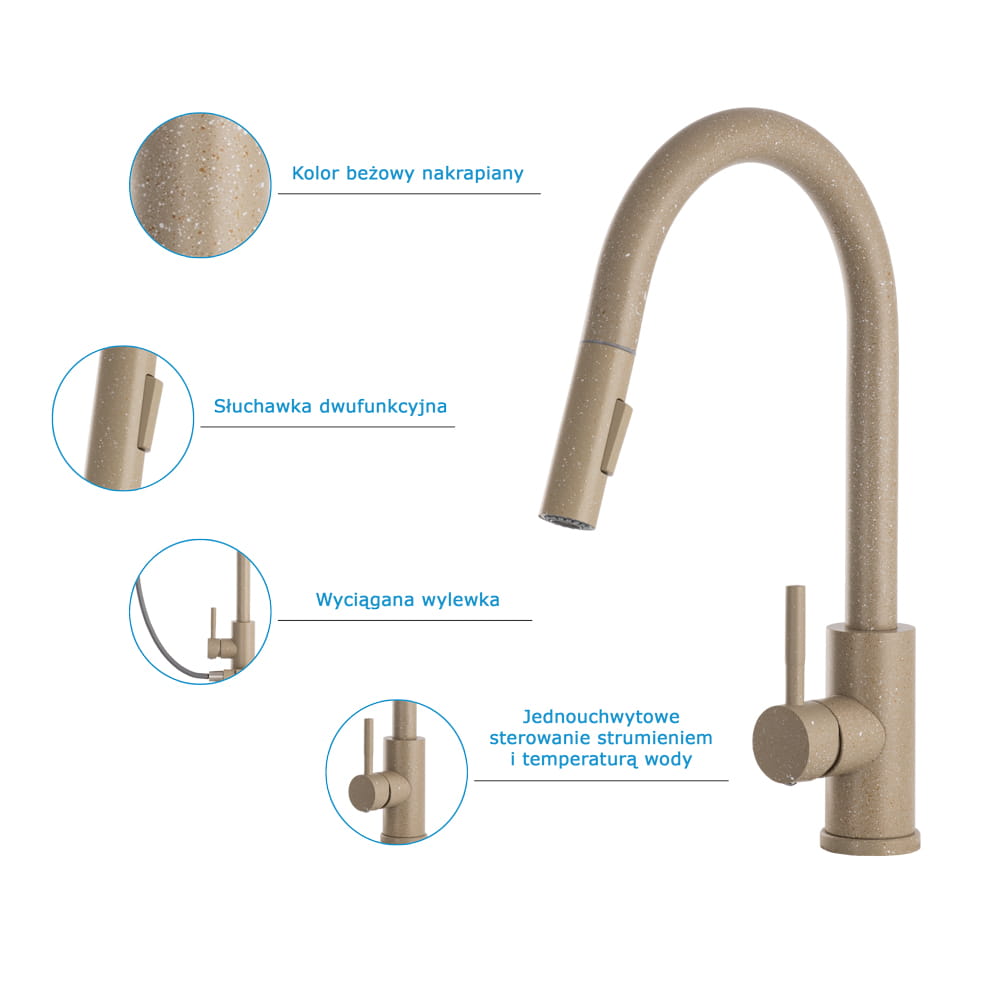 Model ten wyróżnia się wyciąganą wylewką, która znacząco ułatwia mycie naczyń, płukanie zlewu oraz napełnianie większych garnków, a także dwoma trybami strumienia wody – klasycznym strumieniem laminarnym do codziennych prac oraz trybem prysznicowym (spray) idealnym do szybkiego płukania i czyszczenia większych powierzchni. Jasnobeżowe wykończenie z delikatną, kamienną strukturą nadaje baterii ciepły, naturalny charakter, który doskonale komponuje się z kuchniami nowoczesnymi, klasycznymi i skandynawskimi.
