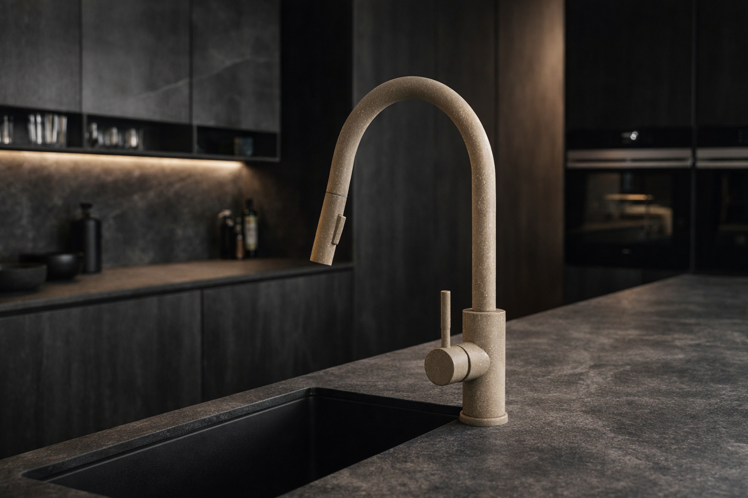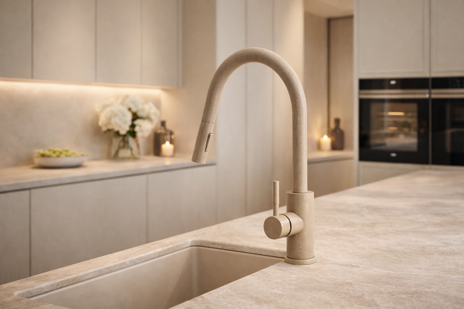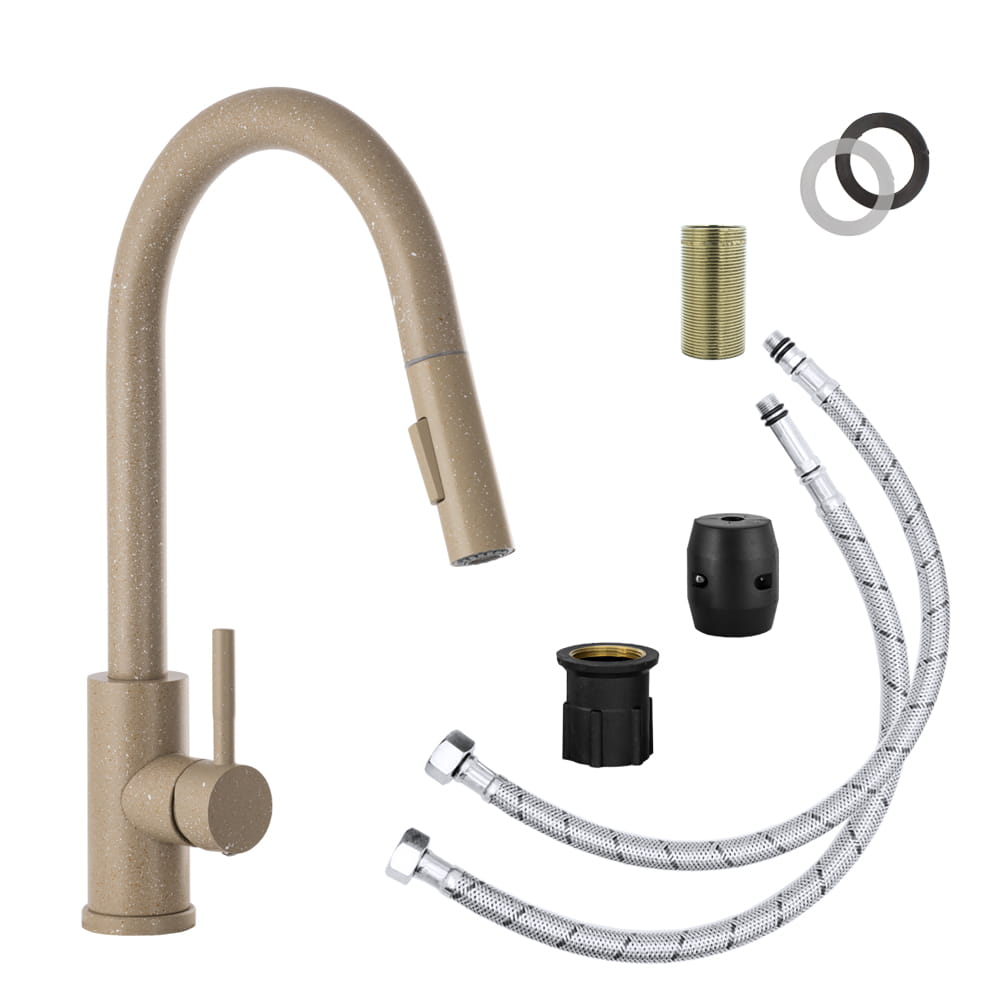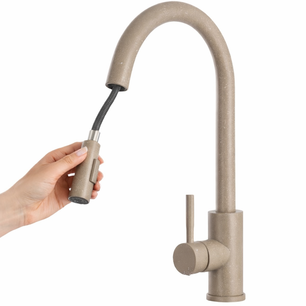Model ten wyróżnia się wyciąganą wylewką, która znacząco ułatwia mycie naczyń, płukanie zlewu oraz napełnianie większych garnków, a także dwoma trybami strumienia wody – klasycznym strumieniem laminarnym do codziennych prac oraz trybem prysznicowym (spray) idealnym do szybkiego płukania i czyszczenia większych powierzchni. Jasnobeżowe wykończenie z delikatną, kamienną strukturą nadaje baterii ciepły, naturalny charakter, który doskonale komponuje się z kuchniami nowoczesnymi, klasycznymi i skandynawskimi.
