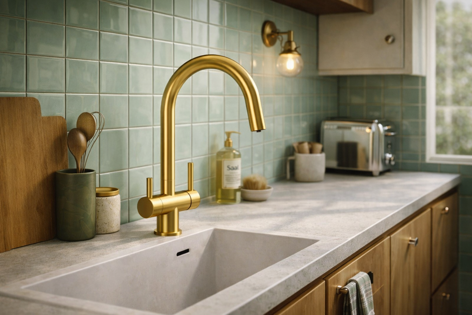 Bateria kuchenna trójdrożna stalowa stała wylewka zlewozmywakowa złota RILO to nowoczesne i wyjątkowo praktyczne rozwiązanie stworzone z myślą o użytkownikach ceniących wygodę, estetykę oraz funkcjonalność w jednym produkcie.
