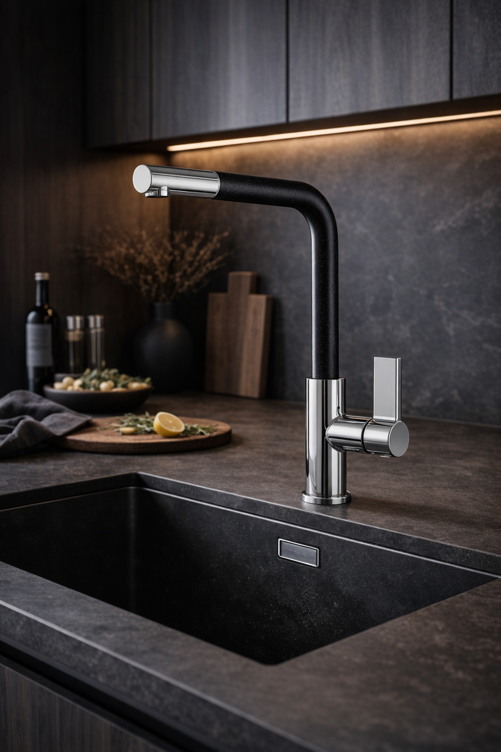 Wyciągana wylewka zapewnia dużą swobodę ruchu, ułatwiając mycie naczyń, płukanie warzyw oraz napełnianie większych garnków, a ergonomiczna forma gwarantuje komfort podczas codziennej pracy przy zlewie. Subtelne granitowe wykończenie nadaje baterii ciepły, elegancki charakter i doskonale komponuje się z kuchniami nowoczesnymi, skandynawskimi oraz klasycznymi. Solidna konstrukcja, odporność na przebarwienia i wysoką temperaturę oraz staranne wykonanie sprawiają, że bateria zachowuje estetyczny wygląd przez długi czas.