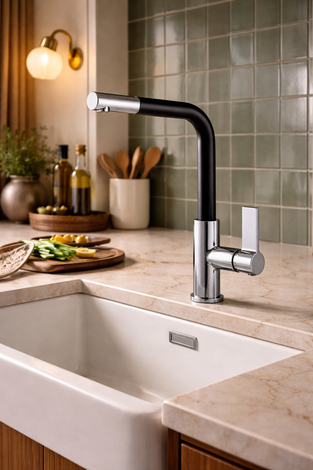 Bateria kuchenna wyciągana wylewka LEVA to eleganckie i funkcjonalne rozwiązanie stworzone z myślą o nowoczesnych kuchniach, w których liczy się zarówno estetyka, jak i wygoda użytkowania.