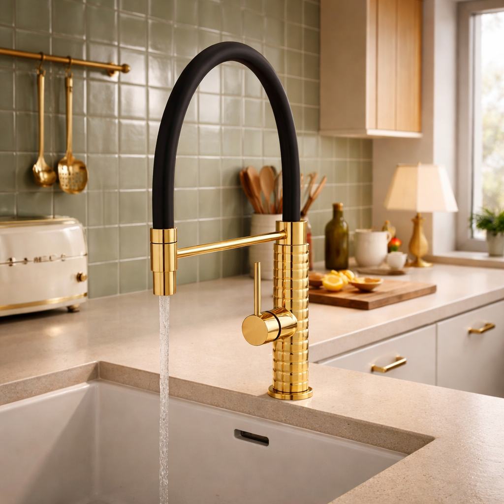 Dzięki elastycznej, obrotowej wylewce umożliwia swobodne kierowanie strumieniem wody, co znacząco ułatwia mycie naczyń, płukanie warzyw oraz napełnianie większych garnków. Złote wykończenie nadaje baterii elegancki, uniwersalny wygląd, który doskonale komponuje się zarówno z kuchniami nowoczesnymi, jak i klasycznymi. Obrót 360°, ergonomiczny uchwyt oraz ceramiczna głowica zapewniają płynną regulację temperatury i strumienia wody, a solidna konstrukcja gwarantuje trwałość na lata. To idealny wybór dla osób ceniących funkcjonalność, estetykę i komfort pracy przy zlewie, a także dla tych, którzy chcą połączyć nowoczesny design z niezawodnością w codziennym użytkowaniu.
