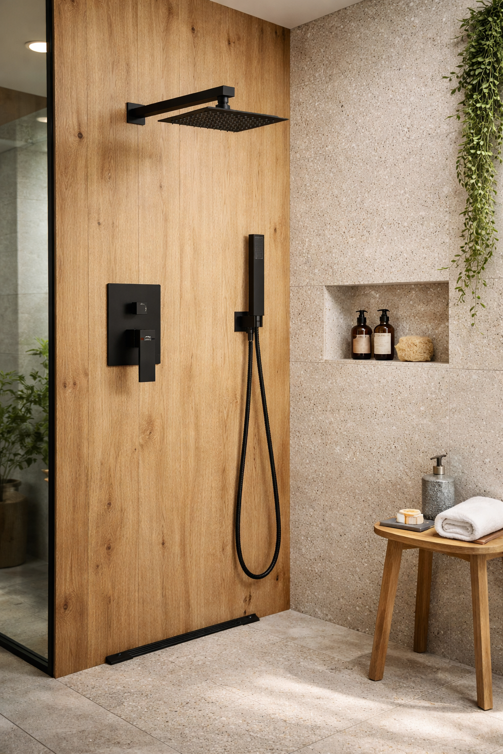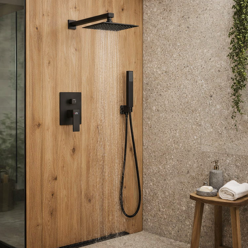 Bateria natryskowa podtynkowa – zestaw prysznicowy LAVEO to nowoczesne rozwiązanie do eleganckich i minimalistycznych łazienek. Ukryty montaż podtynkowy pozwala zachować czystą, uporządkowaną formę wnętrza, a widoczne elementy wykończone czarnym matem podkreślają geometryczny, designerski charakter strefy prysznica.