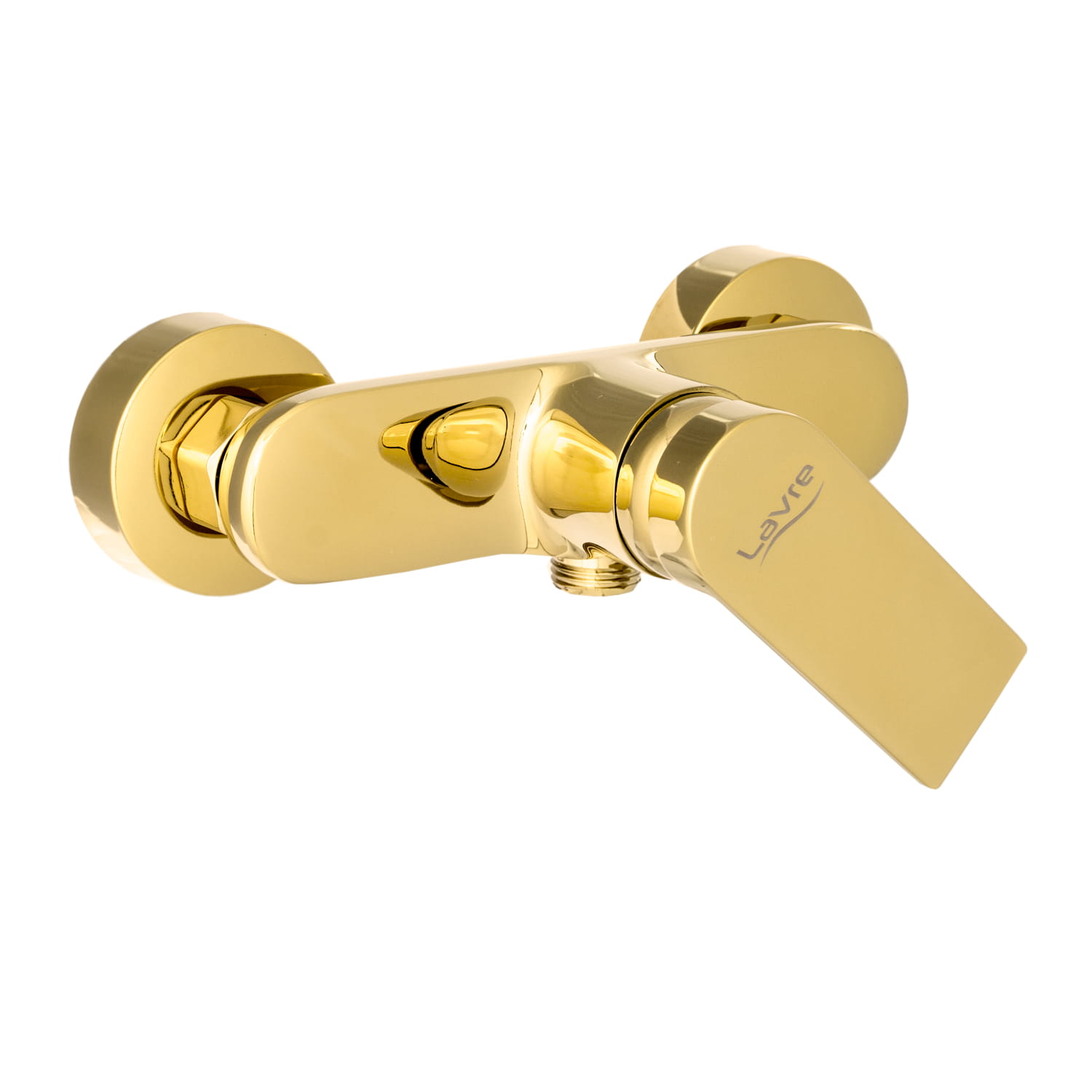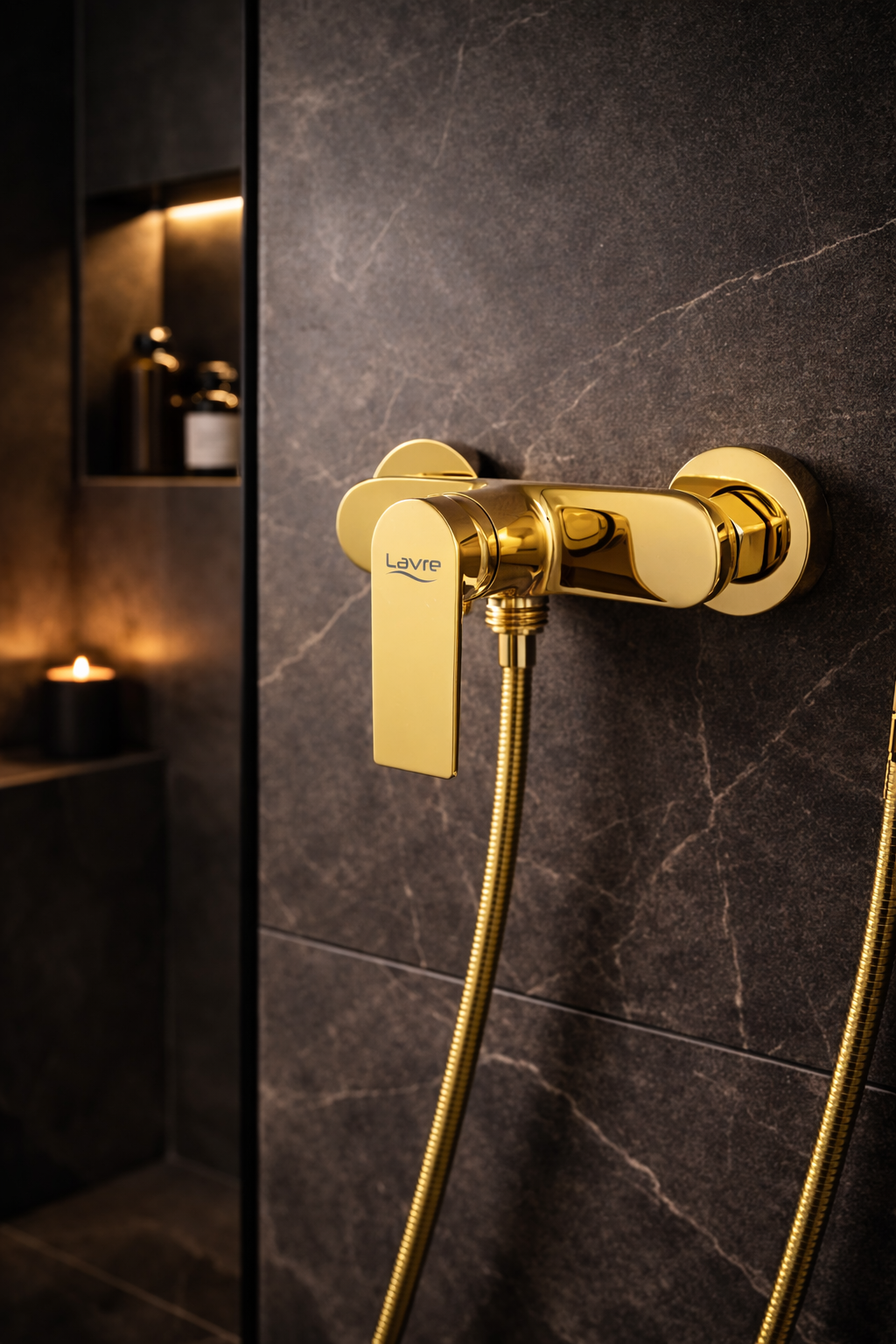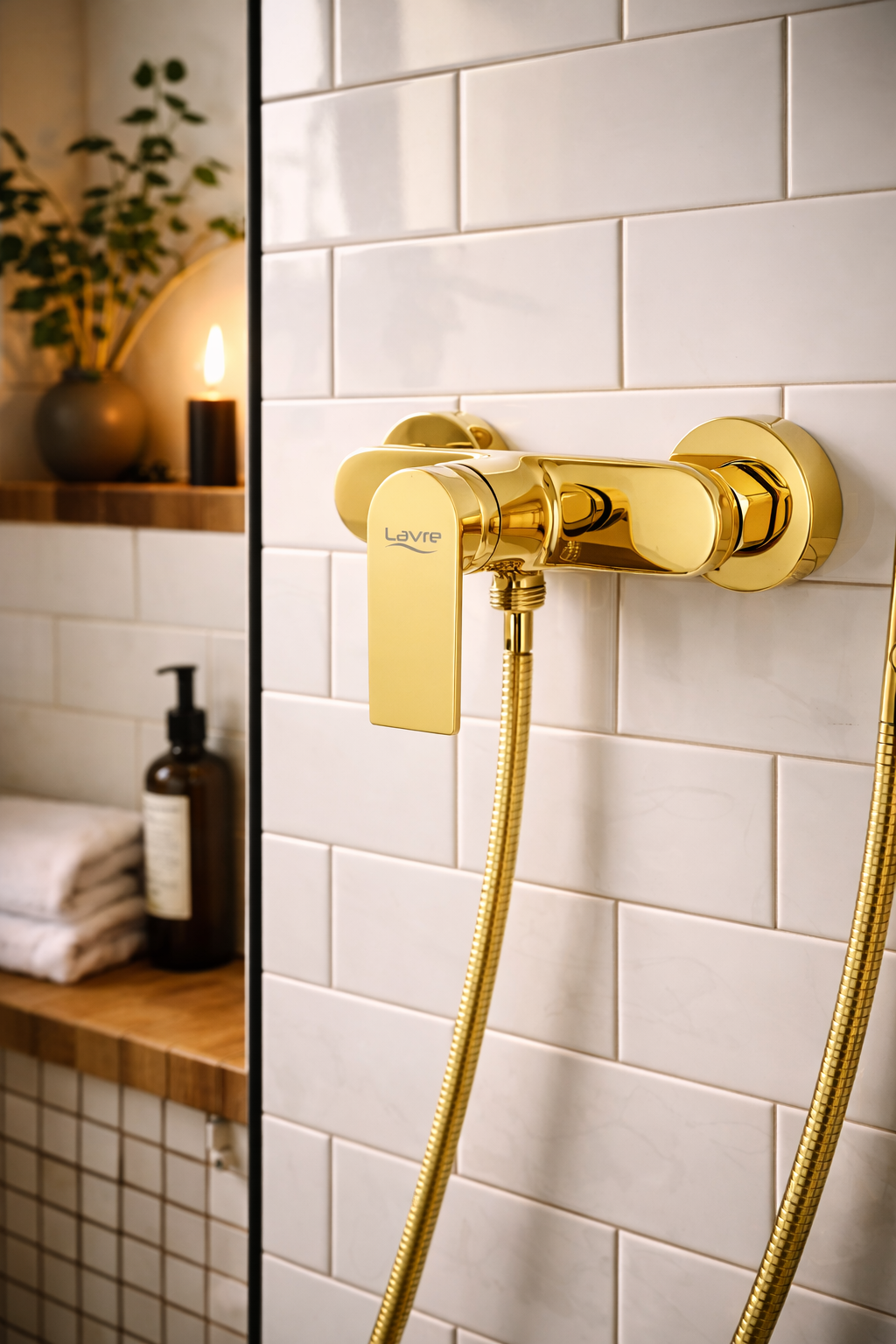 Bateria natryskowa prysznicowa ścienna DENO to nowoczesne i trwałe rozwiązanie do kabin prysznicowych w łazienkach urządzonych w stylu loftowym, industrialnym lub minimalistycznym. Prosta, geometryczna forma w połączeniu ze złotym wykończeniem nadaje wnętrzu wyrazisty charakter i doskonale komponuje się z inną nowoczesną armaturą.