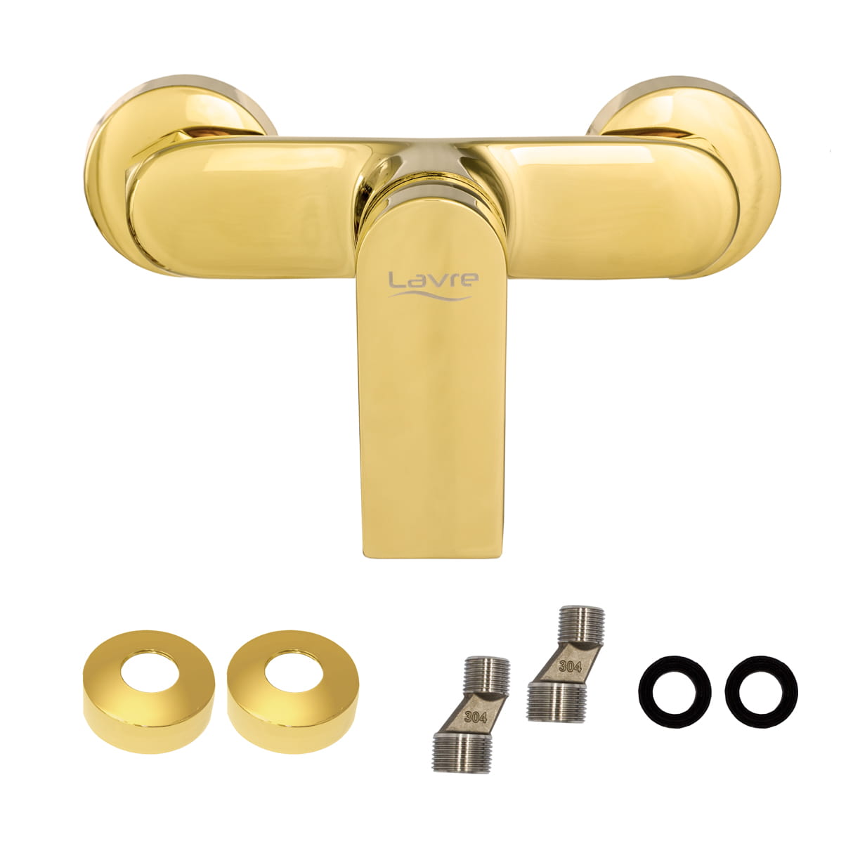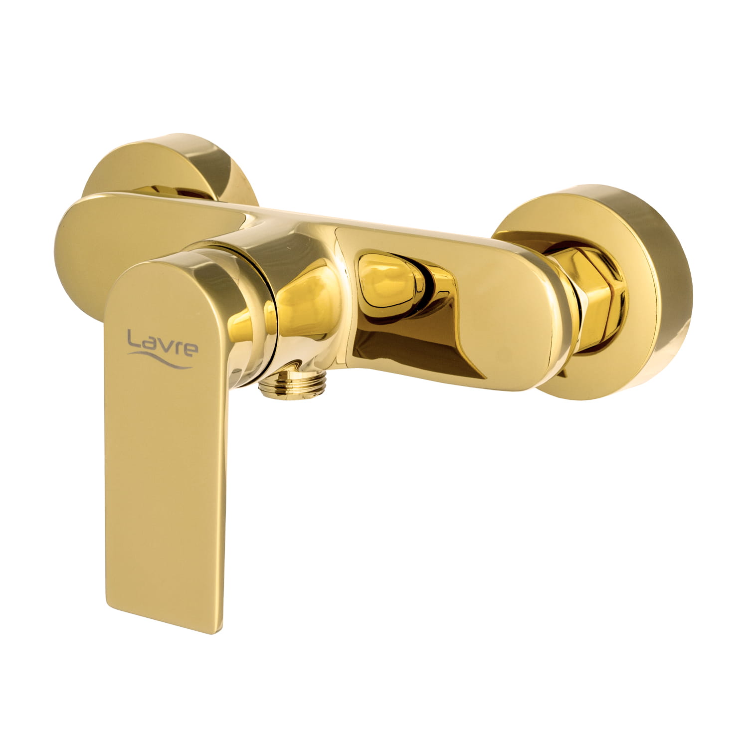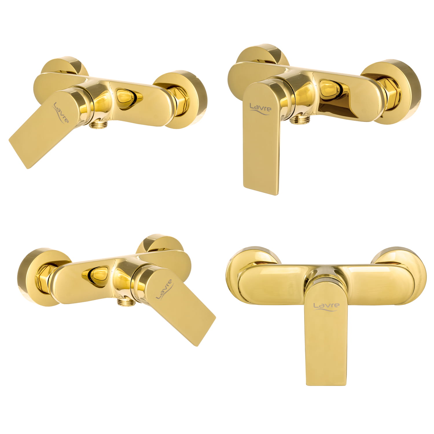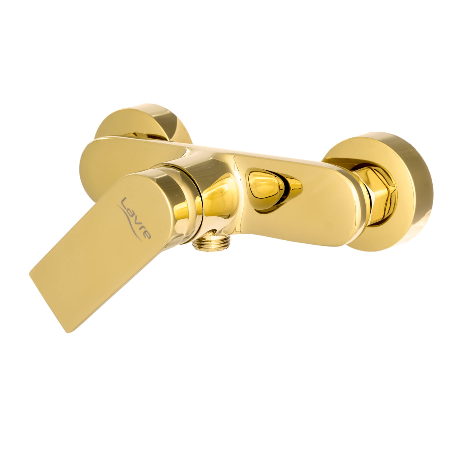Bateria natryskowa prysznicowa ścienna DENO to nowoczesne i trwałe rozwiązanie do kabin prysznicowych w łazienkach urządzonych w stylu loftowym, industrialnym lub minimalistycznym. Prosta, geometryczna forma w połączeniu ze złotym wykończeniem nadaje wnętrzu wyrazisty charakter i doskonale komponuje się z inną nowoczesną armaturą.