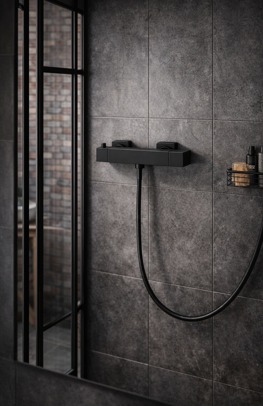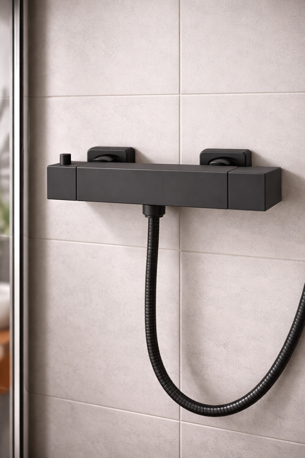 Natryskowa bateria termostatyczna Kvadrato w kolorze czarnym to nowoczesny model, który z uwagi na proste, kanciaste kształty idealnie komponuje się z minimalistycznymi i surowo urządzonymi łazienkami. Baterię bez problemu można podłączyć do kolumny natryskowej oraz zestawu prysznicowego na drążku lub punktowego. Głowica termostatyczna umożliwia ustawienie stałej temperatury wody, co zmniejsza jej zużycie i obniża wysokość rachunków oraz zapobiega poparzeniu zbyt gorącym strumieniem. Dodatkowo system chłodnego dotyku (tzw. cool touch) zapobiega nagrzewaniu się korpusu baterii, zwiększając komfort jej użytkowania. Produkt szczególnie polecany do łazienek, z których korzystają dzieci i osoby starsze.