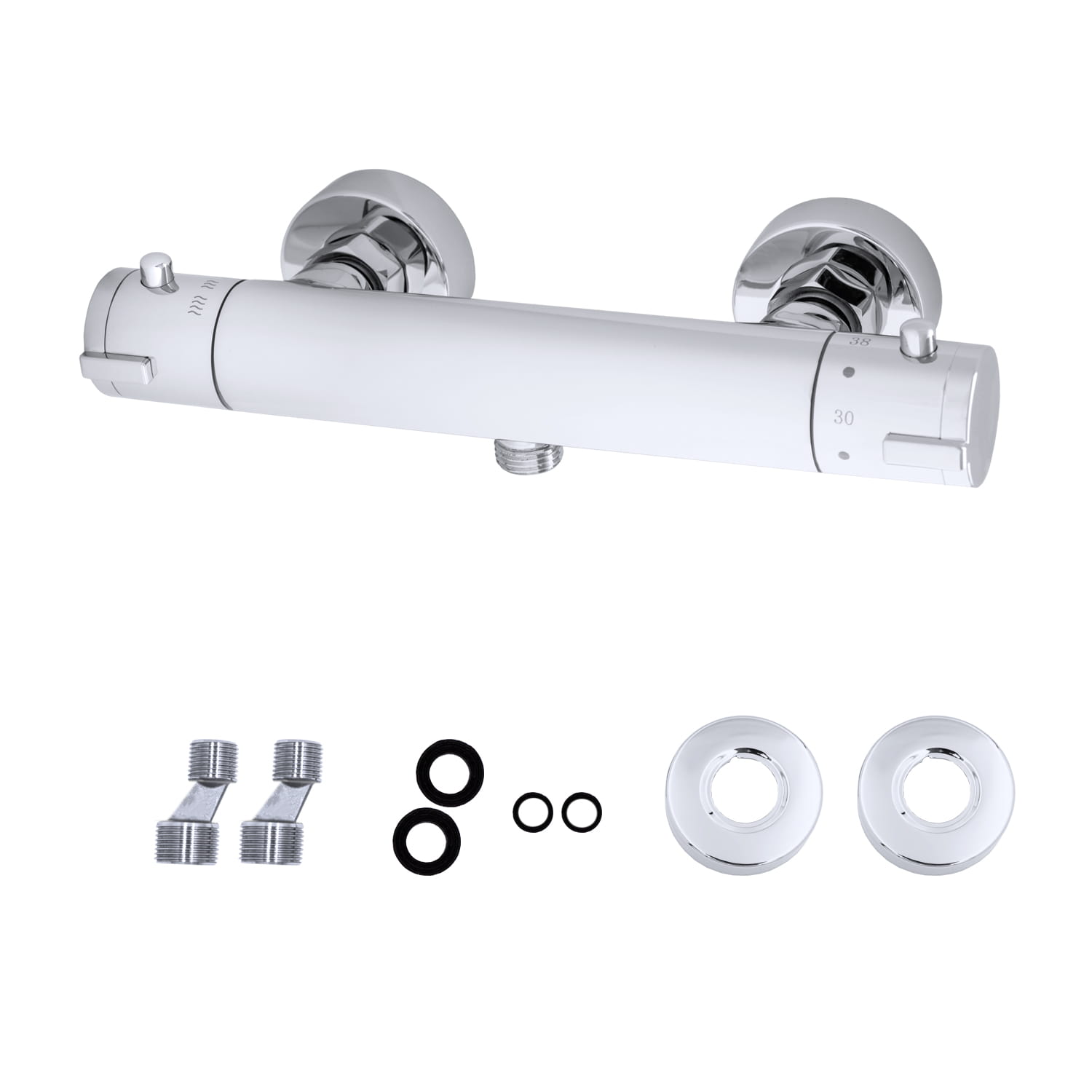 Solidny mosiężny korpus gwarantuje trwałość i odporność na korozję, natomiast chromowane wykończenie nadaje łazience elegancki, uniwersalny wygląd oraz jest odporne na zarysowania i wysoką temperaturę. Montaż ścienny ze standardowym rozstawem z regulacją umożliwia szybkie dopasowanie do większości instalacji, zarówno w nowych łazienkach, jak i podczas modernizacji.