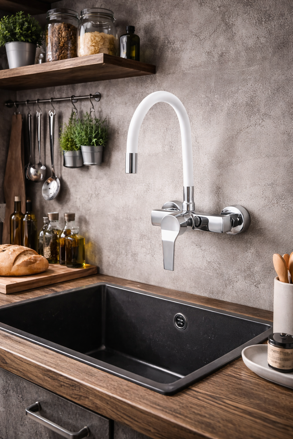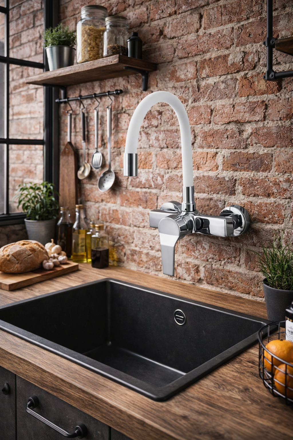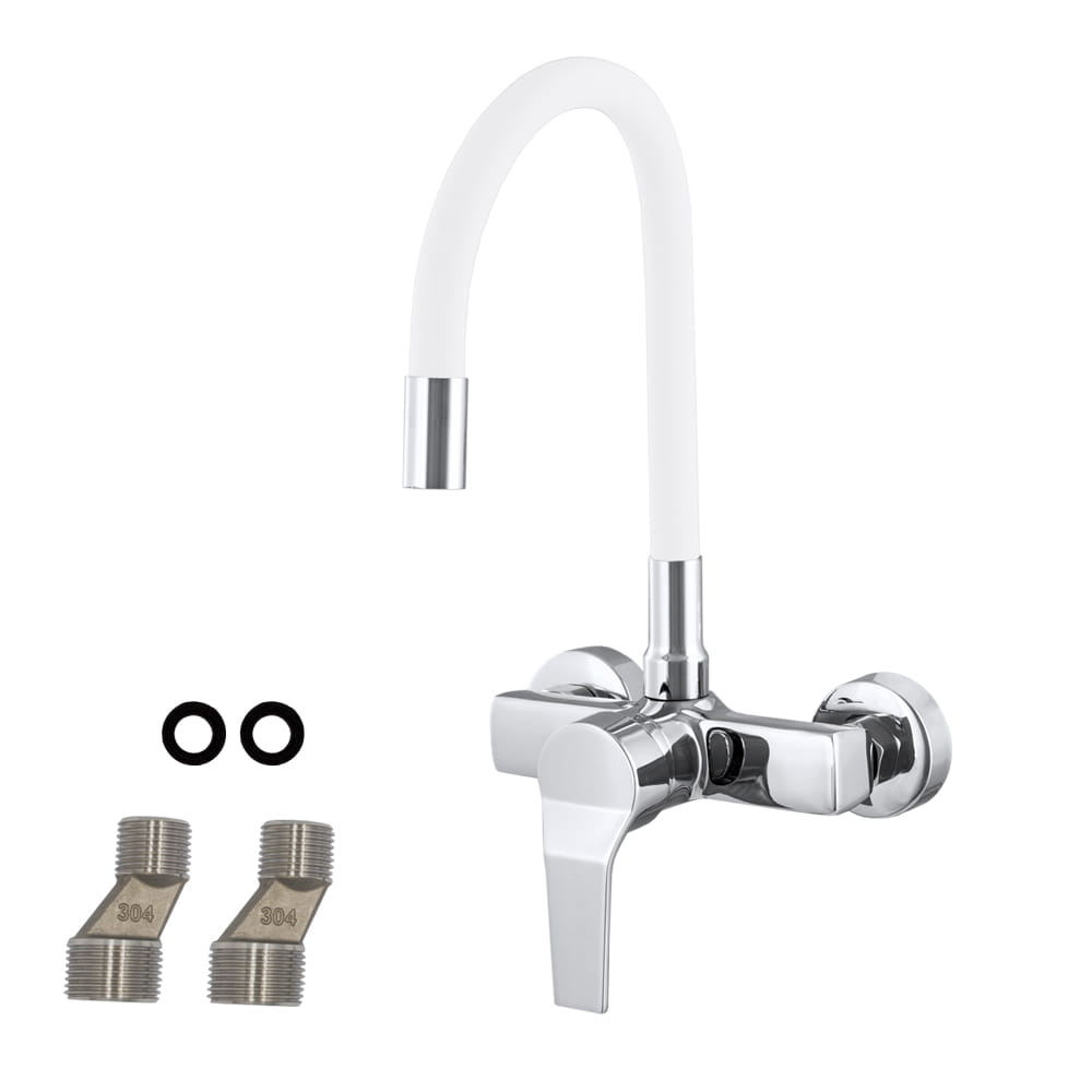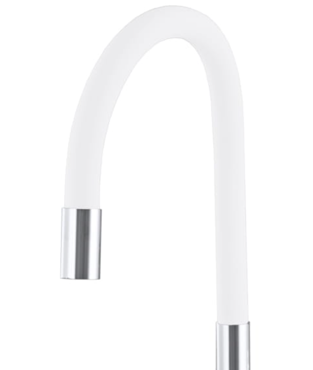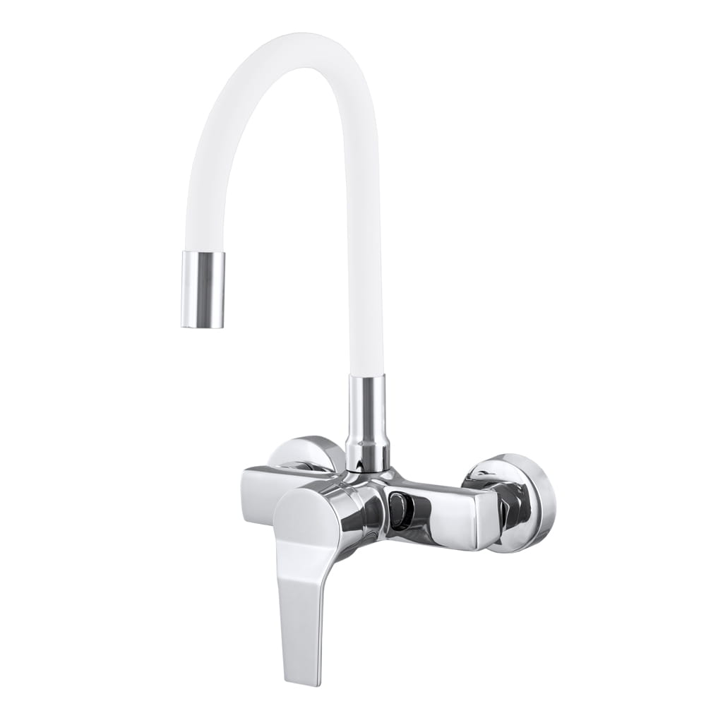 Bateria kuchenna MONA w kolorze białym z elementami chromu to funkcjonalne i nowoczesne rozwiązanie stworzone z myślą o maksymalnej wygodzie pracy przy zlewie. Elastyczna, giętka wylewka z obrotem 360° pozwala swobodnie kierować strumień wody, co znacząco ułatwia mycie naczyń, warzyw oraz czyszczenie zlewu. Solidny mosiężny korpuszapewnia trwałość i odporność na korozję, a wysokiej jakości głowica gwarantuje płynną regulację temperatury i strumienia wody. Regulowana wysokość i zasięg wylewki umożliwiają idealne dopasowanie baterii do indywidualnych potrzeb użytkownika. Montaż ścienny na standardowym rozstawie 150 mm z regulacją na krzywkach sprawia, że bateria doskonale sprawdzi się także jako zamiennik istniejącej armatury – bez przerabiania instalacji. To praktyczna, estetyczna i niezawodna bateria kuchenna, która doskonale odnajdzie się w codziennym użytkowaniu.