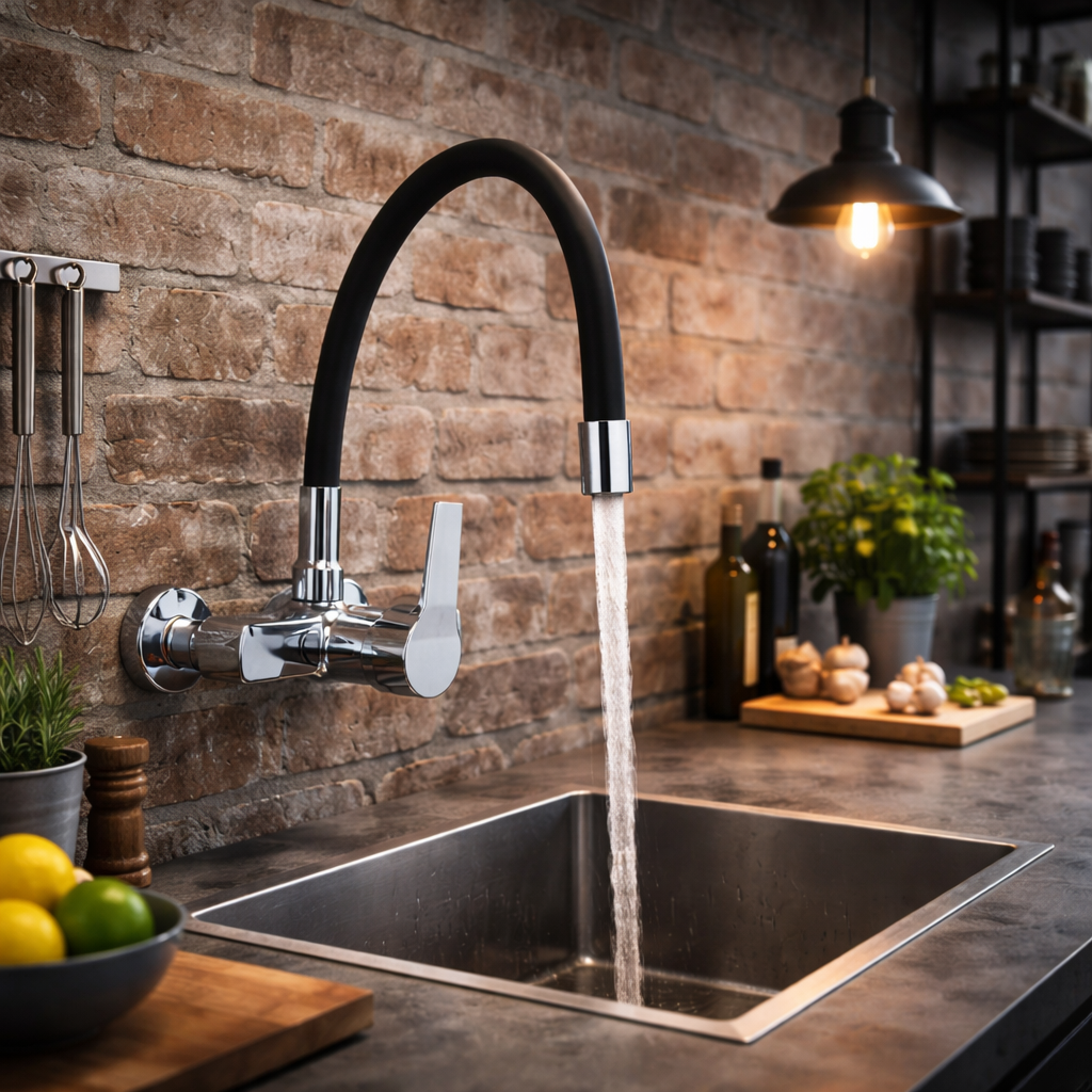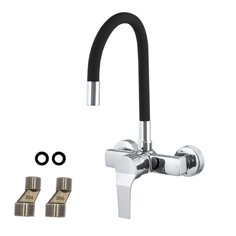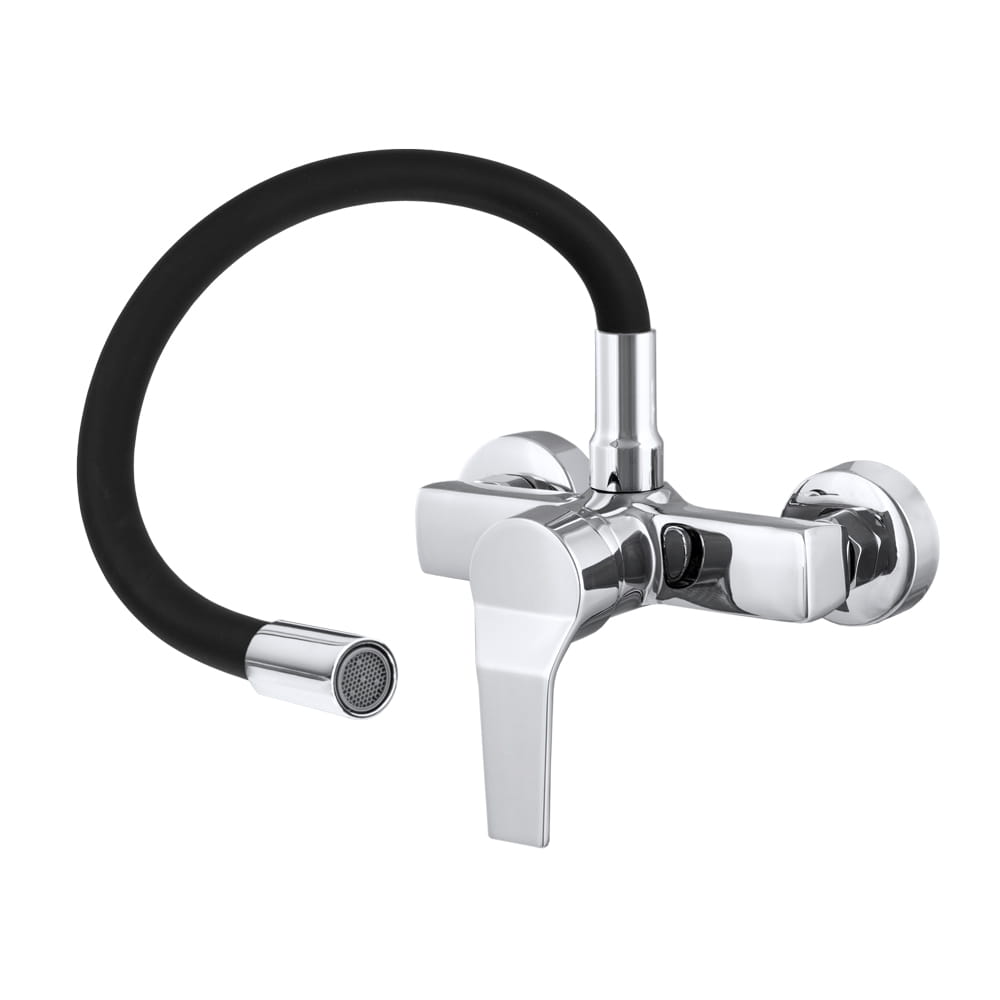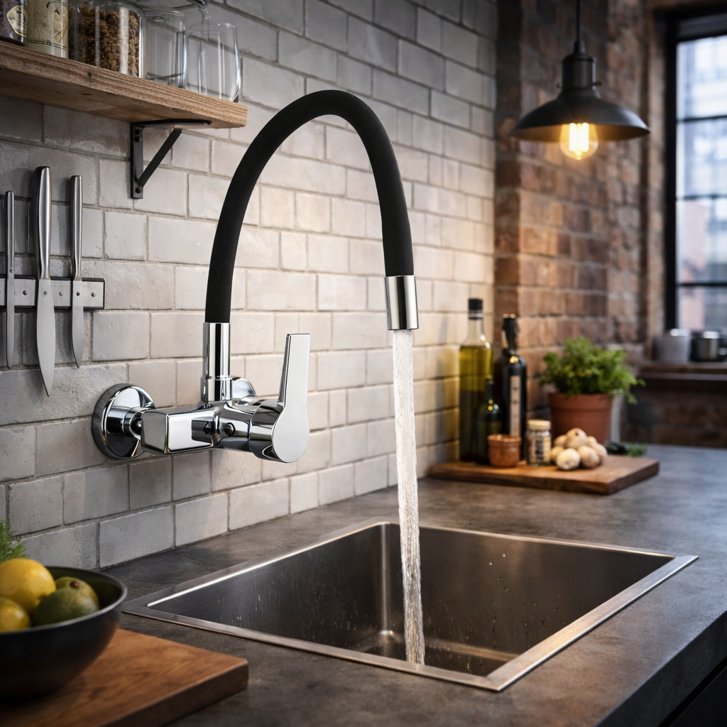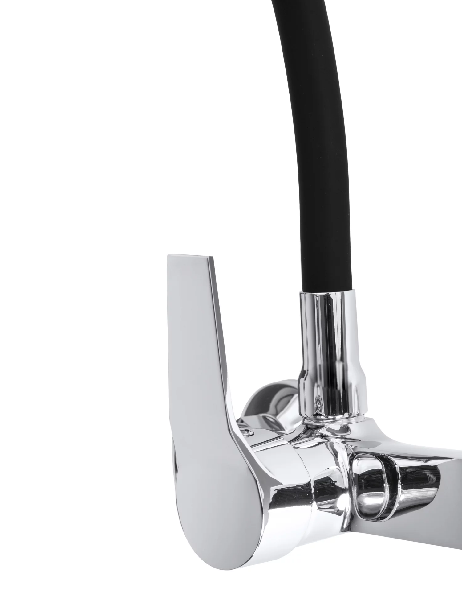 Bateria kuchenna MONA w kolorze czarnym z elementami chromu to funkcjonalne i nowoczesne rozwiązanie stworzone z myślą o maksymalnej wygodzie pracy przy zlewie. Elastyczna, giętka wylewka z obrotem 360° pozwala swobodnie kierować strumień wody, co znacząco ułatwia mycie naczyń, warzyw oraz czyszczenie zlewu. Solidny mosiężny korpuszapewnia trwałość i odporność na korozję, a wysokiej jakości głowica gwarantuje płynną regulację temperatury i strumienia wody. Regulowana wysokość i zasięg wylewki umożliwiają idealne dopasowanie baterii do indywidualnych potrzeb użytkownika. Montaż ścienny na standardowym rozstawie 150 mm z regulacją na krzywkach sprawia, że bateria doskonale sprawdzi się także jako zamiennik istniejącej armatury – bez przerabiania instalacji. To praktyczna, estetyczna i niezawodna bateria kuchenna, która doskonale odnajdzie się w codziennym użytkowaniu.