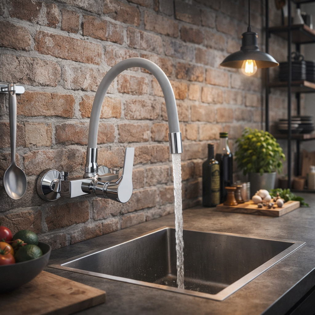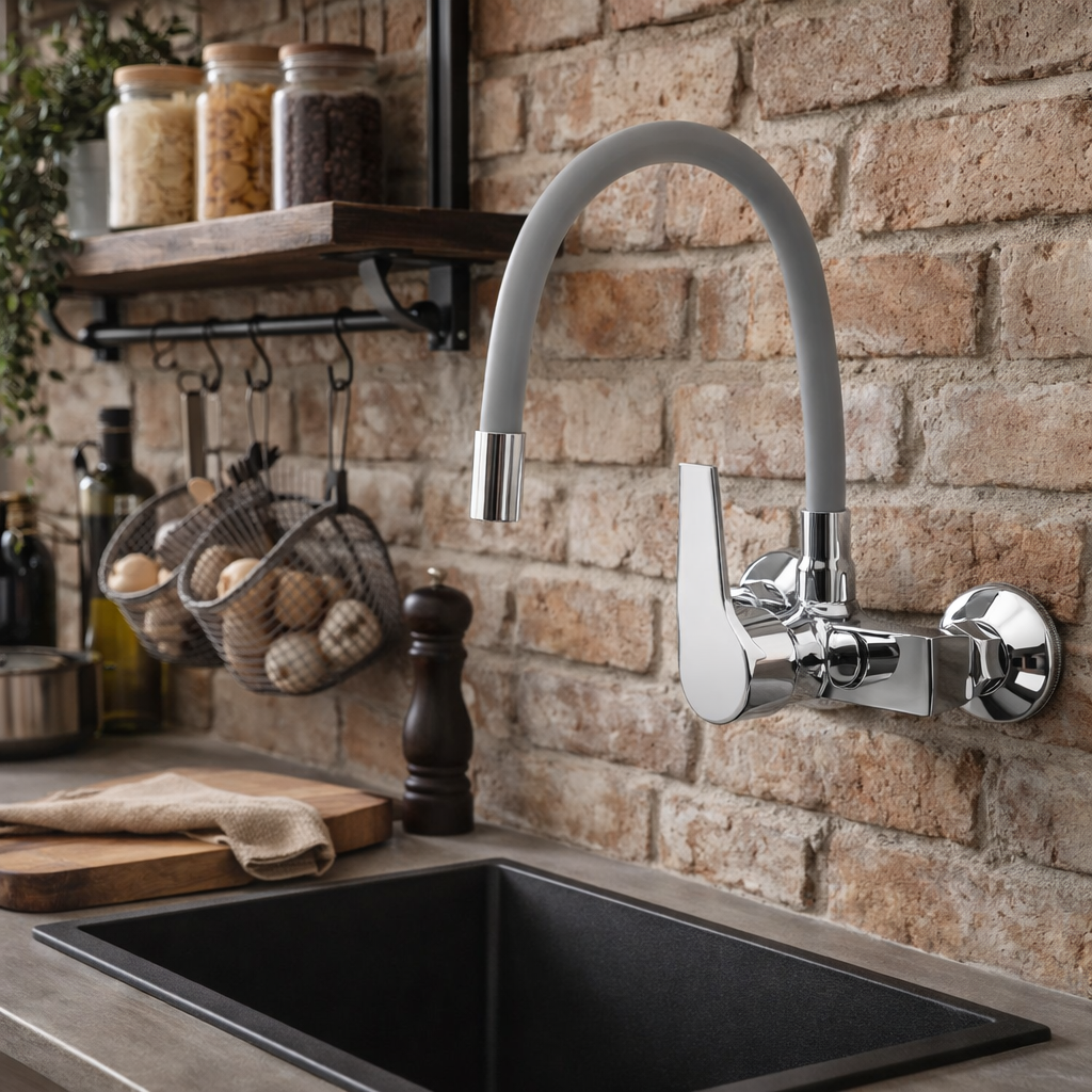 Bateria kuchenna MONA w kolorze szarym z elementami chromu to funkcjonalne i nowoczesne rozwiązanie stworzone z myślą o maksymalnej wygodzie pracy przy zlewie. Elastyczna, giętka wylewka z obrotem 360° pozwala swobodnie kierować strumień wody, co znacząco ułatwia mycie naczyń, warzyw oraz czyszczenie zlewu. Solidny mosiężny korpus zapewnia trwałość i odporność na korozję, a wysokiej jakości głowica gwarantuje płynną regulację temperatury i strumienia wody. Regulowana wysokość i zasięg wylewki umożliwiają idealne dopasowanie baterii do indywidualnych potrzeb użytkownika. Montaż ścienny na standardowym rozstawie 150 mm z regulacją na krzywkach sprawia, że bateria doskonale sprawdzi się także jako zamiennik istniejącej armatury – bez przerabiania instalacji. To praktyczna, estetyczna i niezawodna bateria kuchenna, która doskonale odnajdzie się w codziennym użytkowaniu.