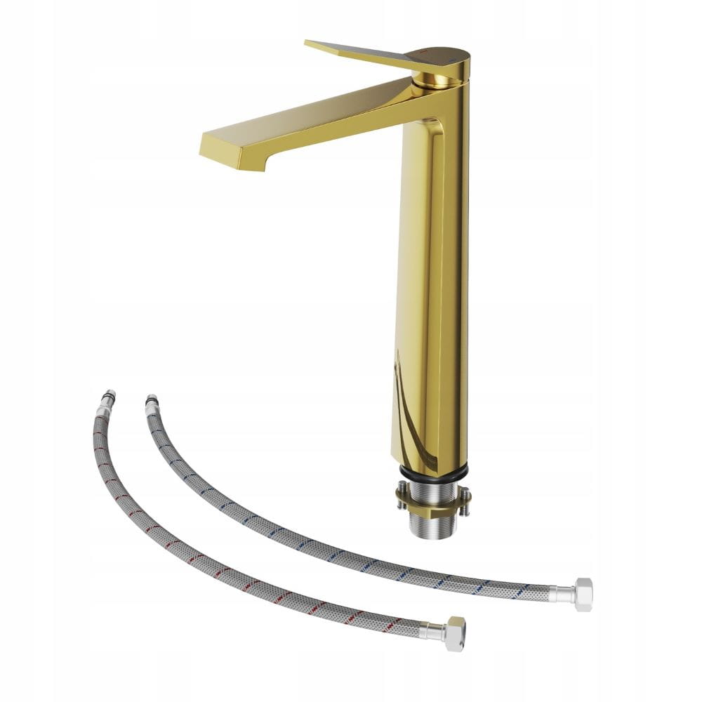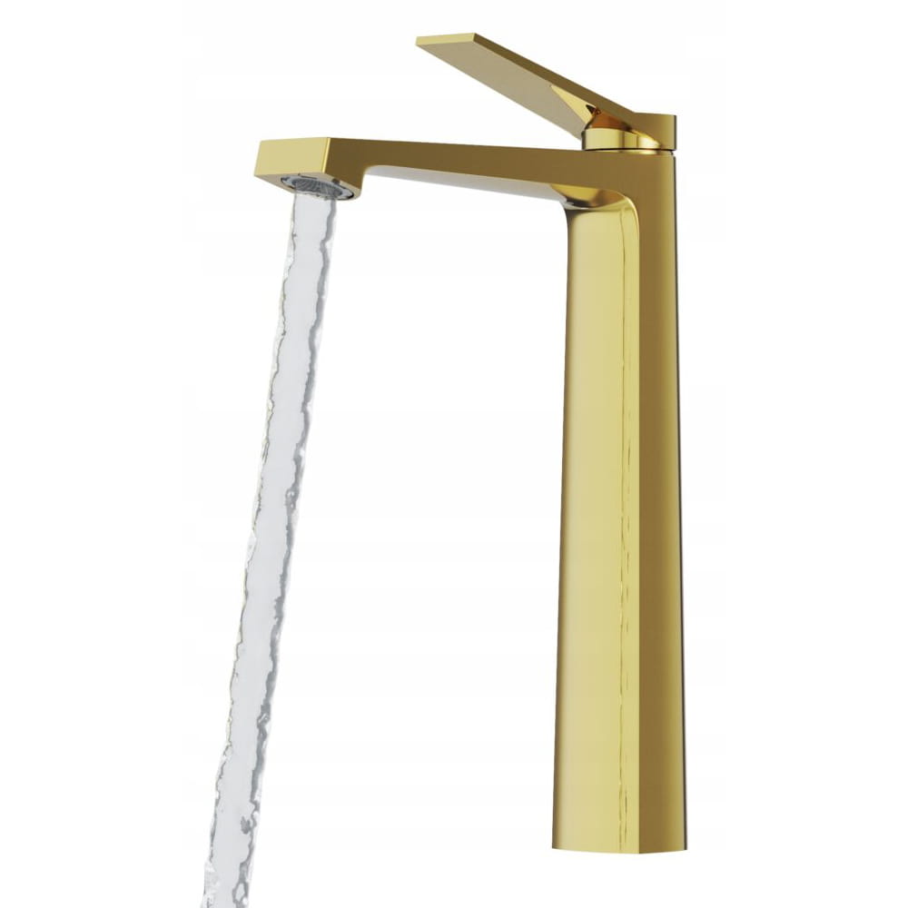 Wysoka bateria umywalkowa SALO to połączenie nowoczesnego designu, wygody użytkowania i solidnej konstrukcji, stworzone z myślą o umywalkach nablatowych. Jej podwyższona sylwetka zapewnia swobodę podczas codziennych czynności higienicznych, a złote wykończenie dodaje łazience elegancji i nowoczesnego charakteru.