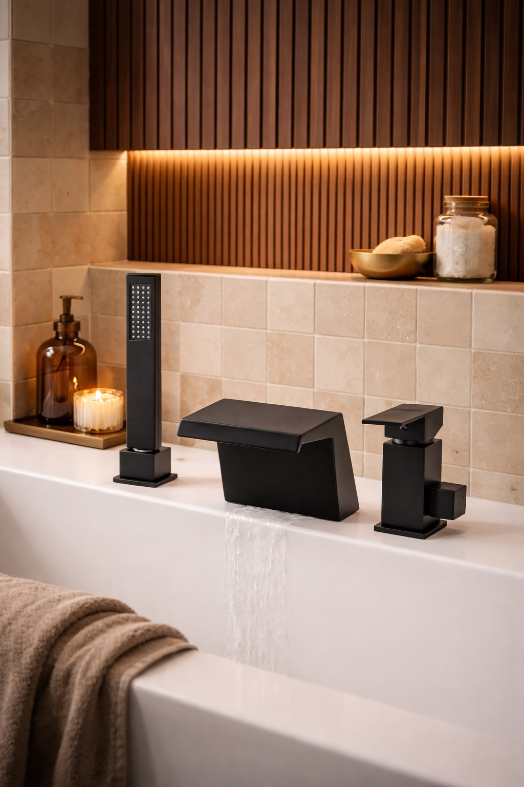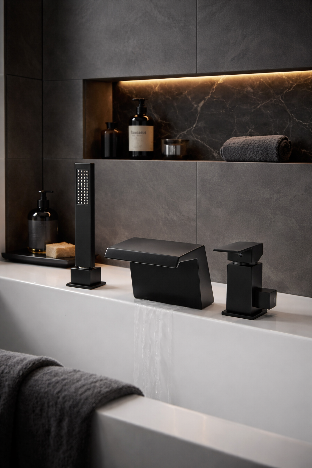 Bateria wannowa 3-otworowa RONA to luksusowe i efektowne rozwiązanie stworzone z myślą o nowoczesnych łazienkach klasy premium. Nawannowy montaż 3-otworowy pozwala na eleganckie i uporządkowane rozmieszczenie elementów, a kaskadowa wylewka typu wodospad nadaje strefie kąpielowej wyjątkowy, spa-like charakter. Czarne, matowe wykończenie podkreśla nowoczesny styl wnętrza i doskonale wpisuje się w aranżacje loftowe, industrialne oraz luksusowe.