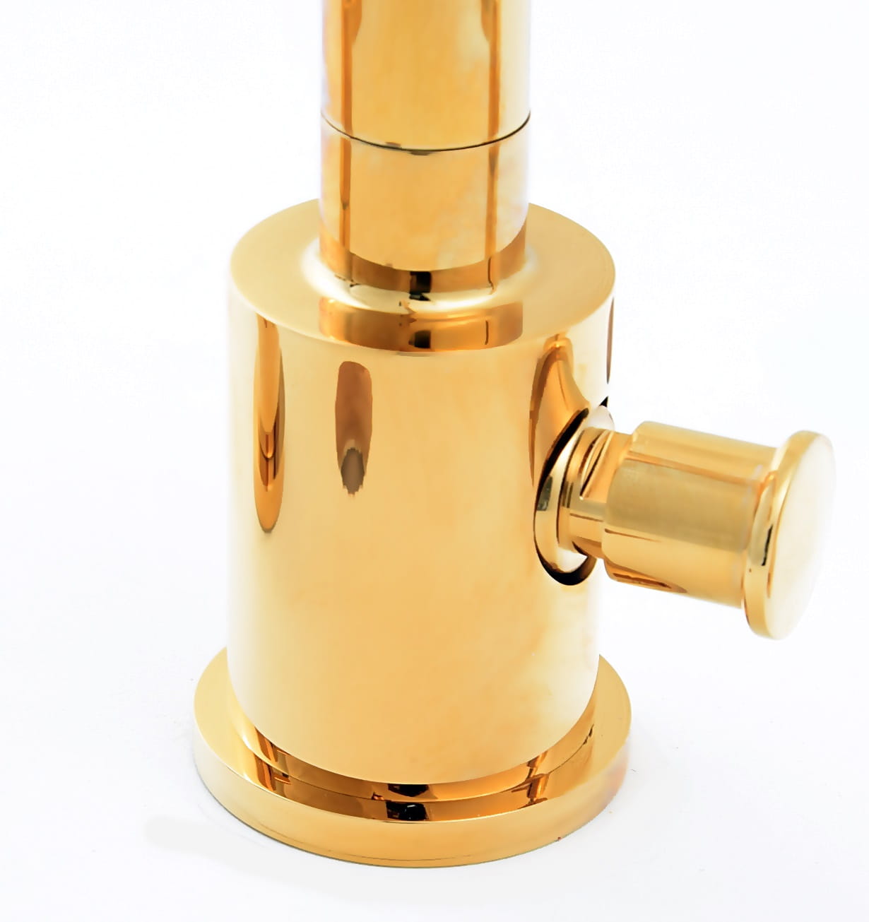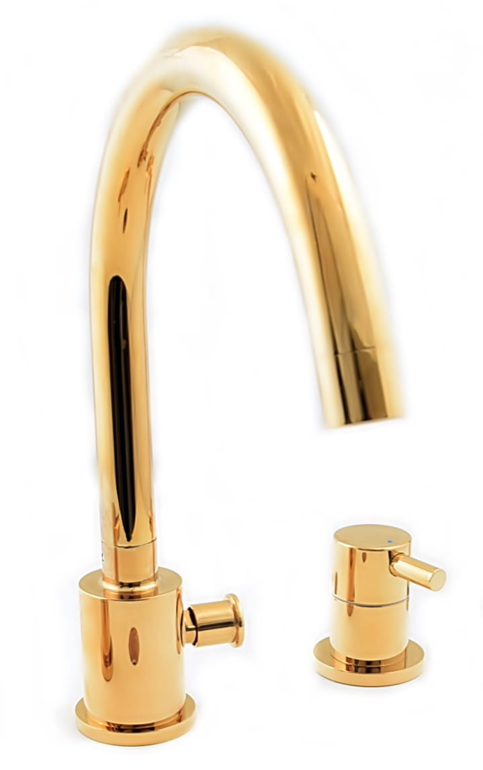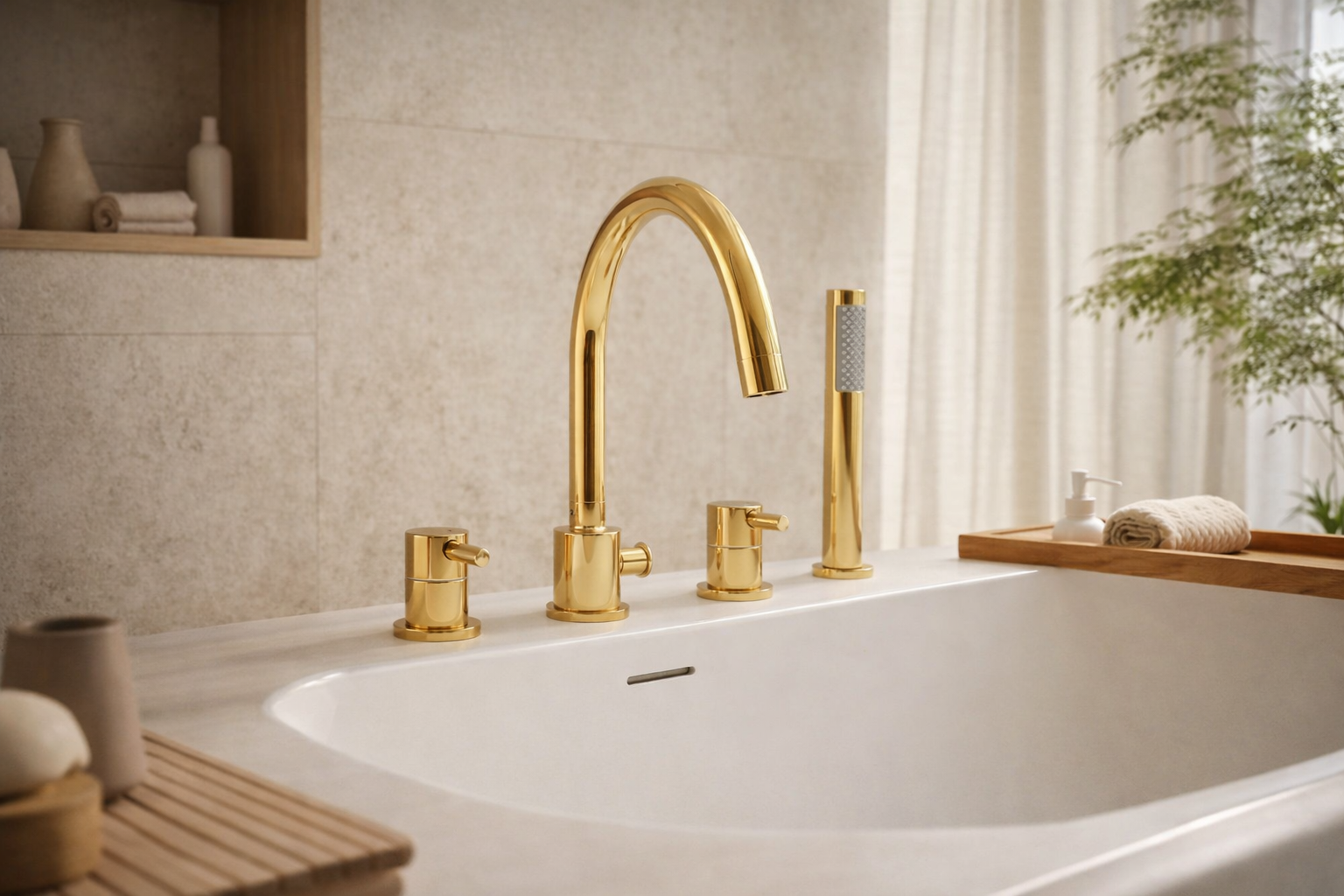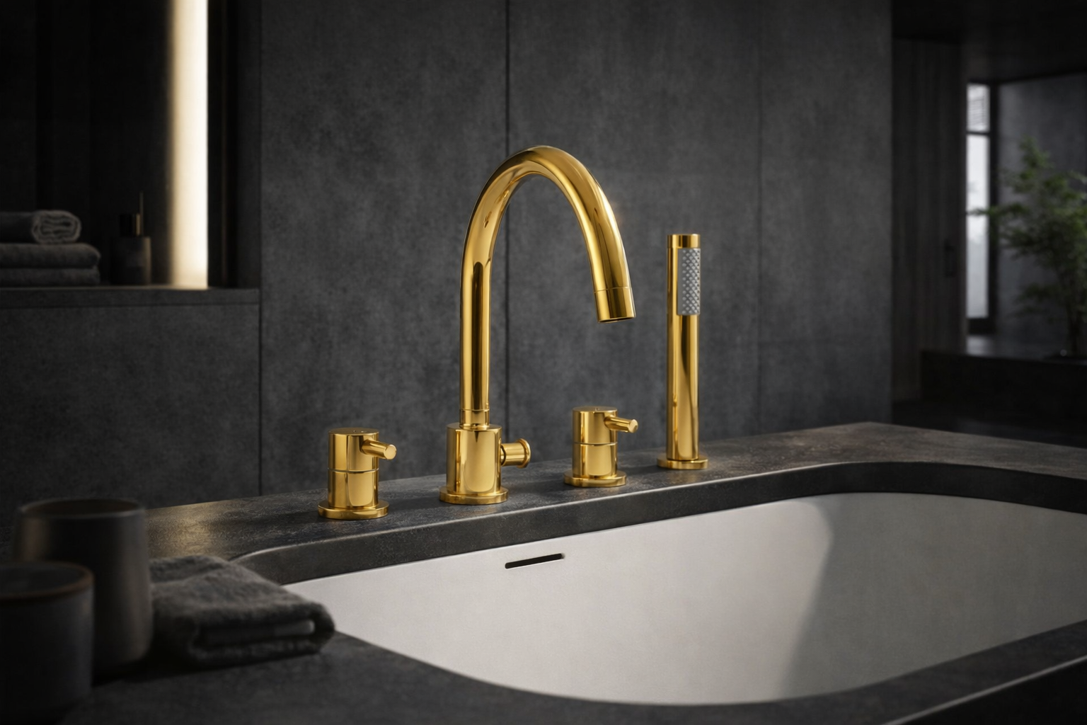 Bateria wannowa łazienkowa 4-otworowa RESO to eleganckie i funkcjonalne rozwiązanie do nowoczesnych stref kąpielowych, w których liczy się design, wygoda i najwyższa jakość wykonania. Złota, lśniąca powłoka nadaje armaturze luksusowy charakter i doskonale komponuje się z nowoczesnymi aranżacjami łazienek oraz wannami zabudowanymi.