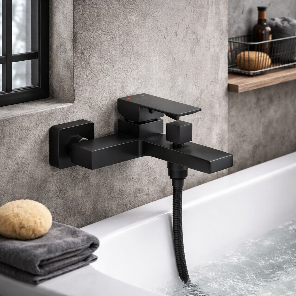 Bateria wannowo-natryskowa ścienna LAVEO to nowoczesne rozwiązanie stworzone z myślą o minimalistycznych i designerskich łazienkach. Charakterystyczna kwadratowa forma korpusu, dźwigni i przełącznika tworzy spójną, geometryczną całość, a czarne wykończenie w wysokim macie podkreśla elegancki styl wnętrza.