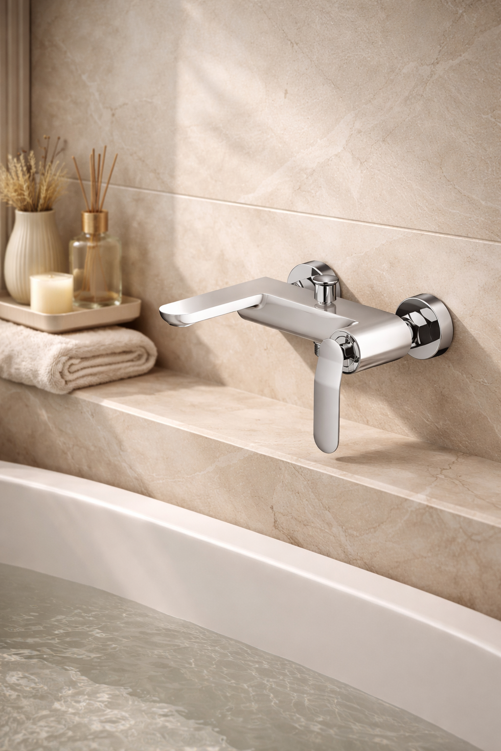 Bateria wannowa ścienna jednouchwytowa VERO to eleganckie i funkcjonalne rozwiązanie do nowoczesnych łazienek, w których liczy się estetyka i wygoda codziennego użytkowania. Połączenie białej powierzchni z chromowanymi elementami nadaje strefie kąpielowej lekki, świeży charakter i doskonale komponuje się zarówno z jasnymi, jak i bardziej kontrastowymi aranżacjami.