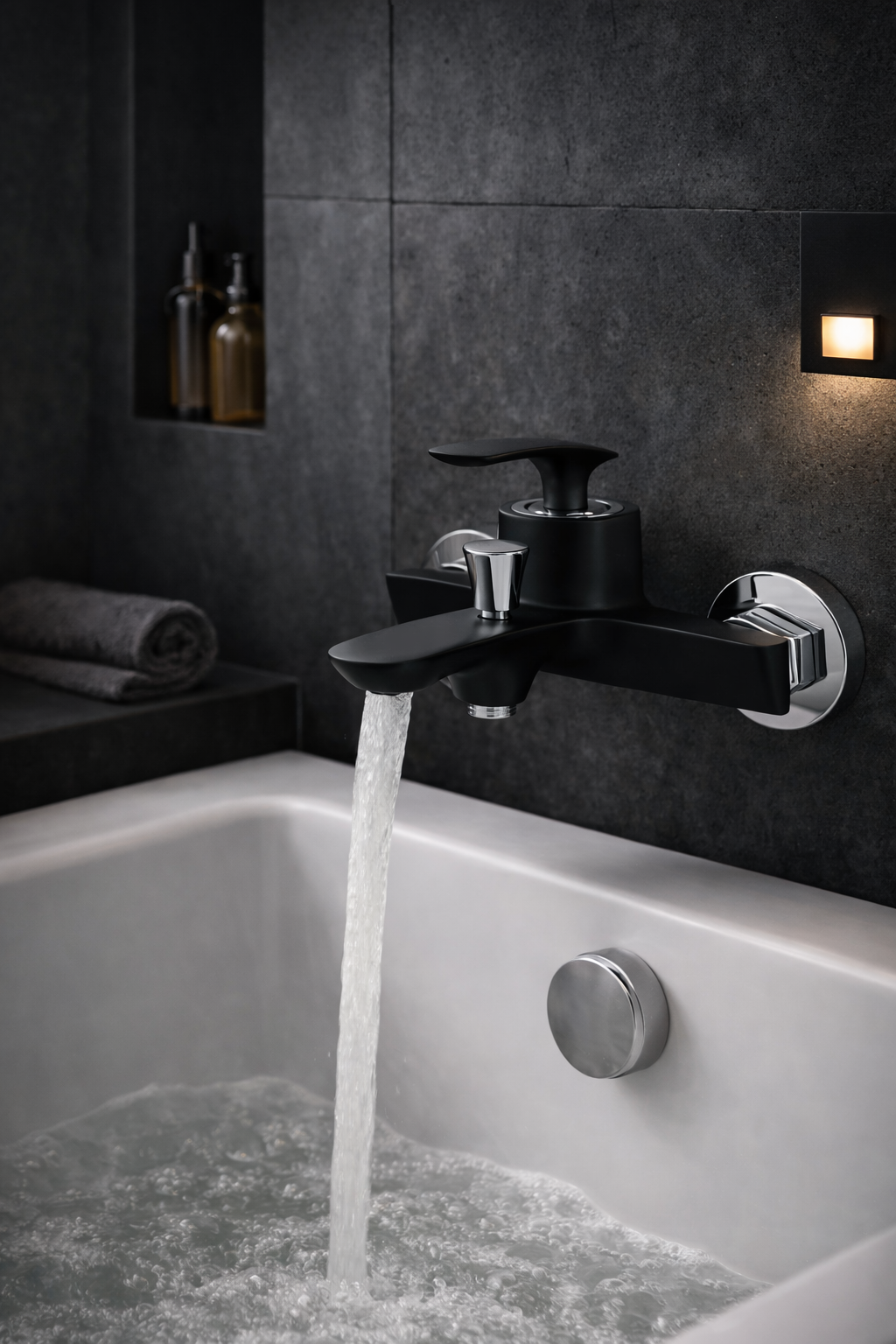 Bateria wannowa ścienna ROCCO to eleganckie i solidne rozwiązanie do nowoczesnych łazienek, w których liczy się czysta forma i niezawodna funkcjonalność. Minimalistyczny design w połączeniu z czarnym wykończeniem nadaje strefie kąpielowej świeży, uporządkowany charakter i doskonale komponuje się z nowoczesnymi aranżacjami wnętrz.