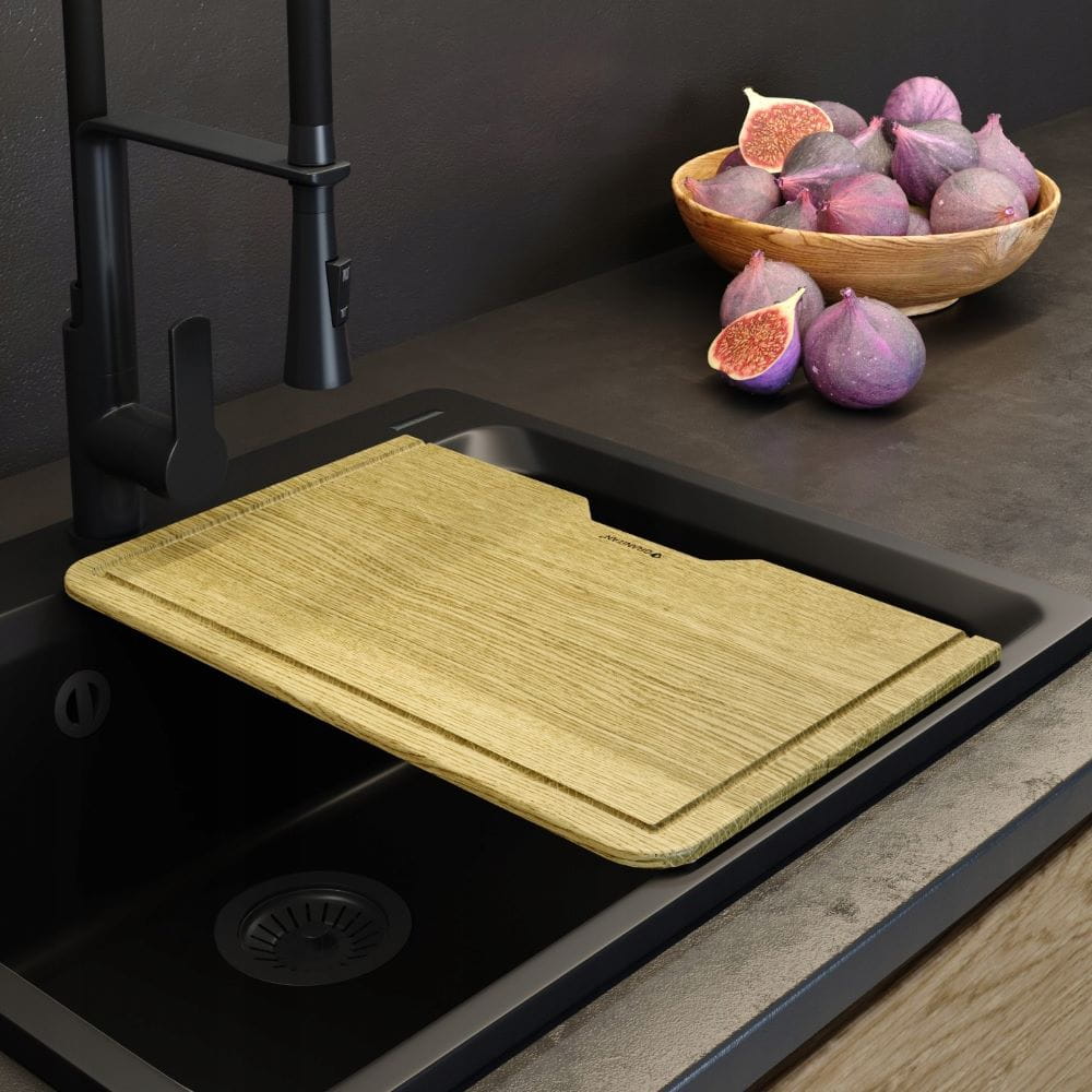 Zarówno rozmiar, jak i kształt zostały dopasowane stylistycznie do zlewu, by razem tworzyć spójny, elegancki i funkcjonalny zestaw. Produkt posiada silikonowe podkładki, które zabezpieczają deskę przed przesuwaniem się podczas pracy.