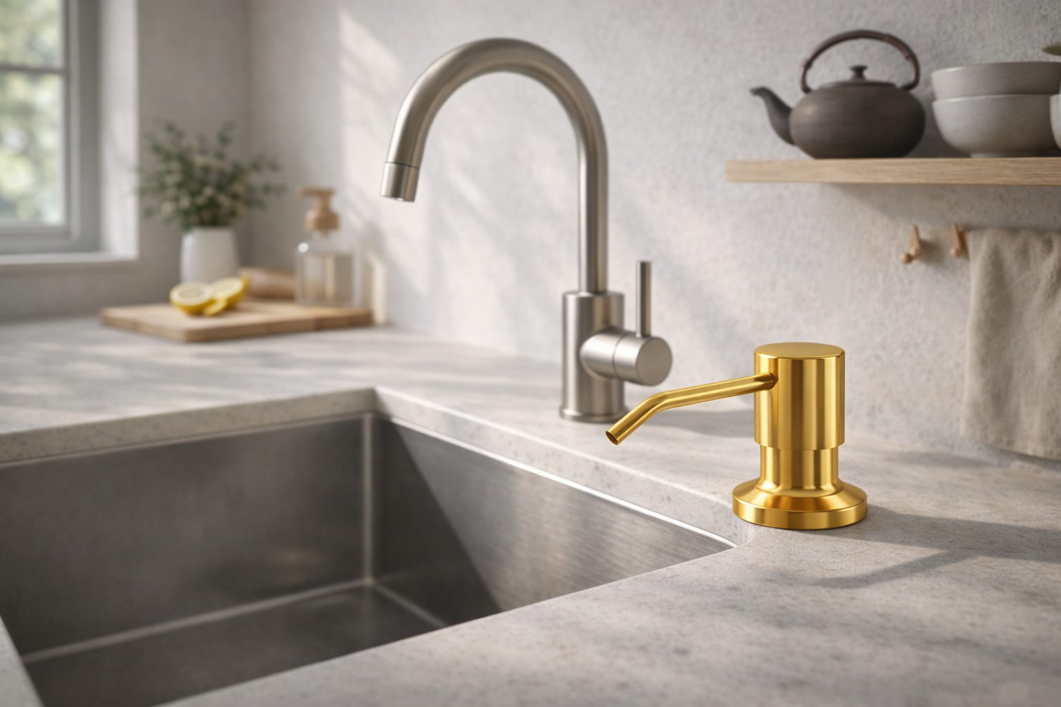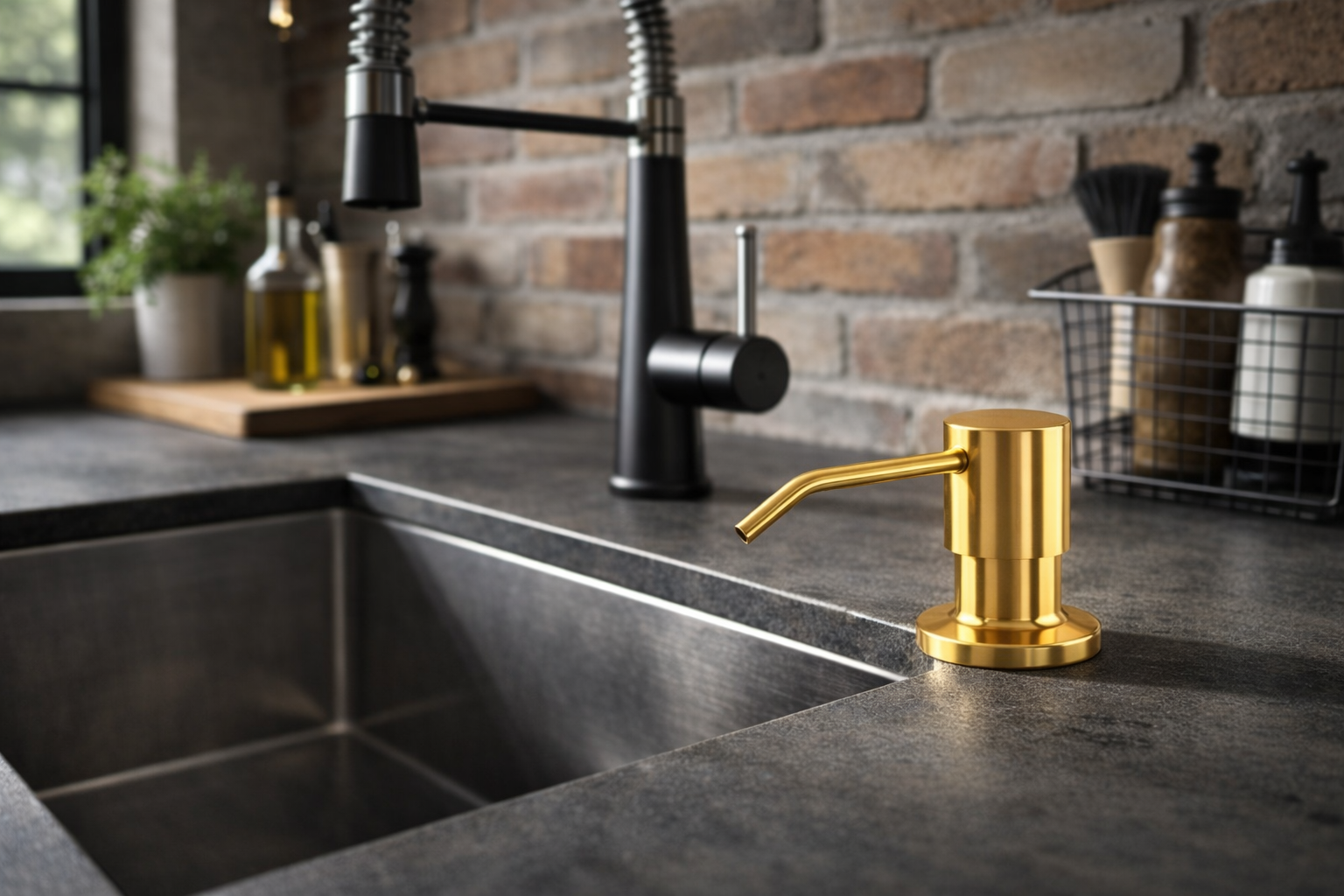 Dozownik MELANI w wykończeniu złotym to praktyczne i estetyczne uzupełnienie strefy zmywania, które doskonale komponuje się z nowoczesną armaturą oraz zlewozmywakami w stylu loftowym, industrialnym i minimalistycznym.