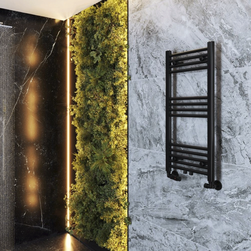 Funkcjonalny, czarny grzejnik łazienkowy w stylu drabinkowym to idealne rozwiązanie do nowoczesnych wnętrz. Model Raven zapewnia wydajne ogrzewanie i trwałość na lata. Jego minimalistyczny design dodaje wnętrzu charakteru i elegancji. Grzejnik jest przystosowany zarówno do podłączenia centralnego ogrzewania, jak i opcjonalnej grzałki elektrycznej, co pozwala na jego używanie przez cały rok.