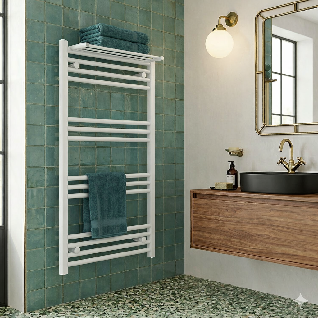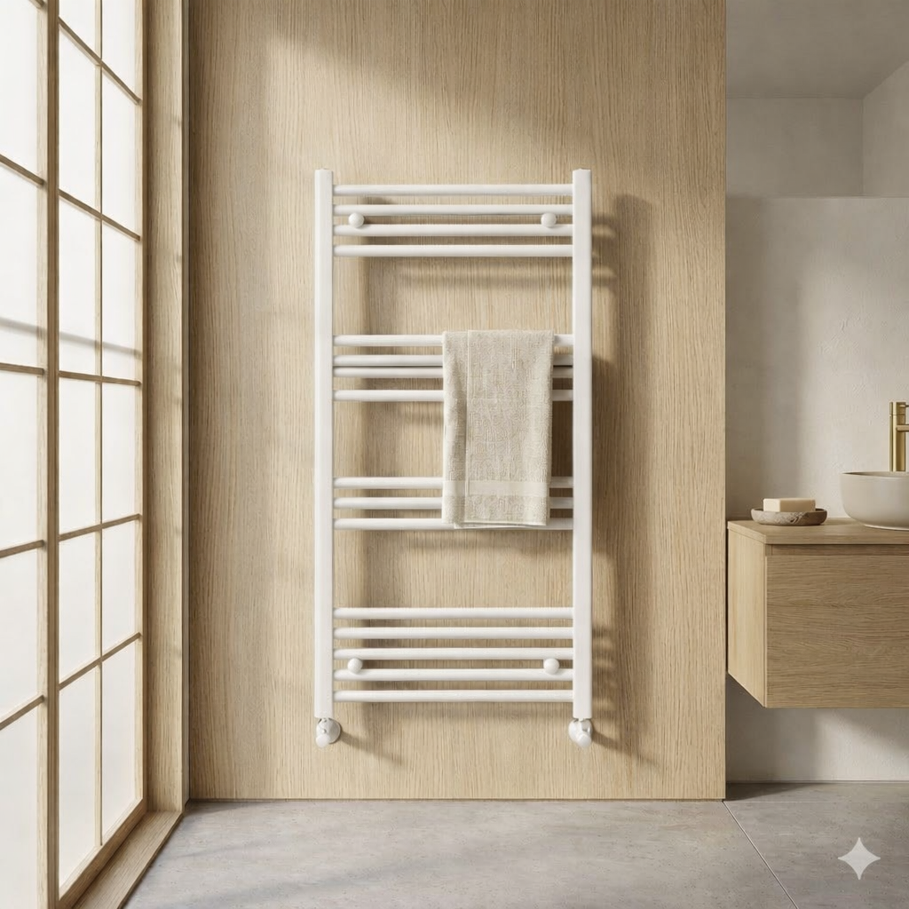 Model BASER to nowoczesny grzejnik łazienkowy typu drabinka o wymiarach 100x60 cm, który łączy minimalistyczny design, wysoką wydajność oraz praktyczne zastosowanie na co dzień, dzięki czemu doskonale sprawdzi się zarówno w mniejszych, jak i większych łazienkach.