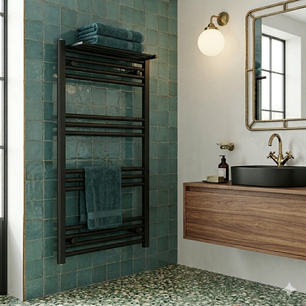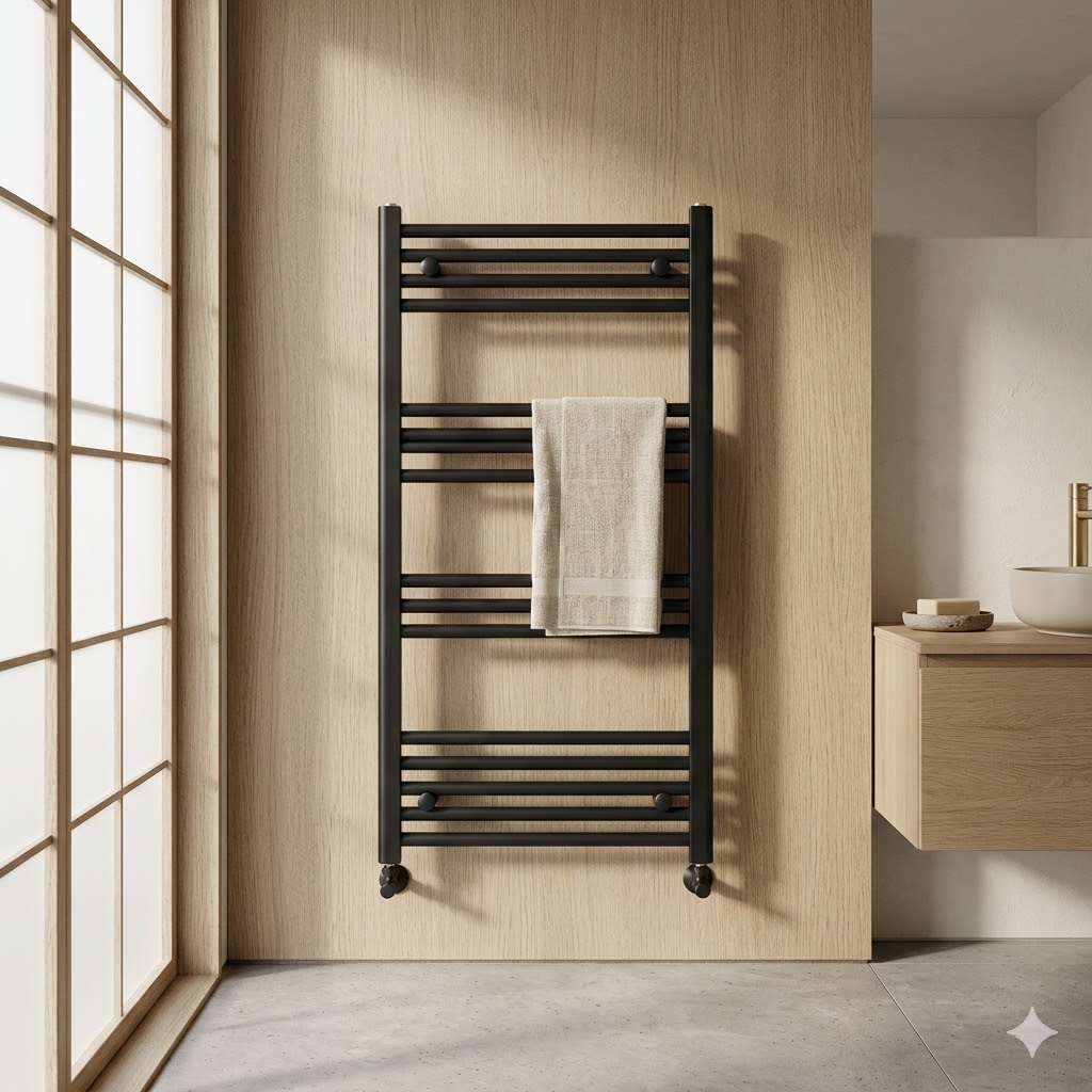 Model BASER to nowoczesny grzejnik łazienkowy typu drabinka o wymiarach 100x60 cm, który łączy minimalistyczny design, wysoką wydajność oraz praktyczne zastosowanie na co dzień, dzięki czemu doskonale sprawdzi się zarówno w mniejszych, jak i większych łazienkach.