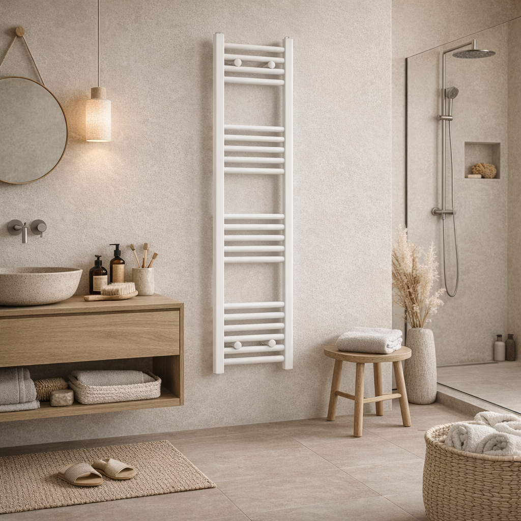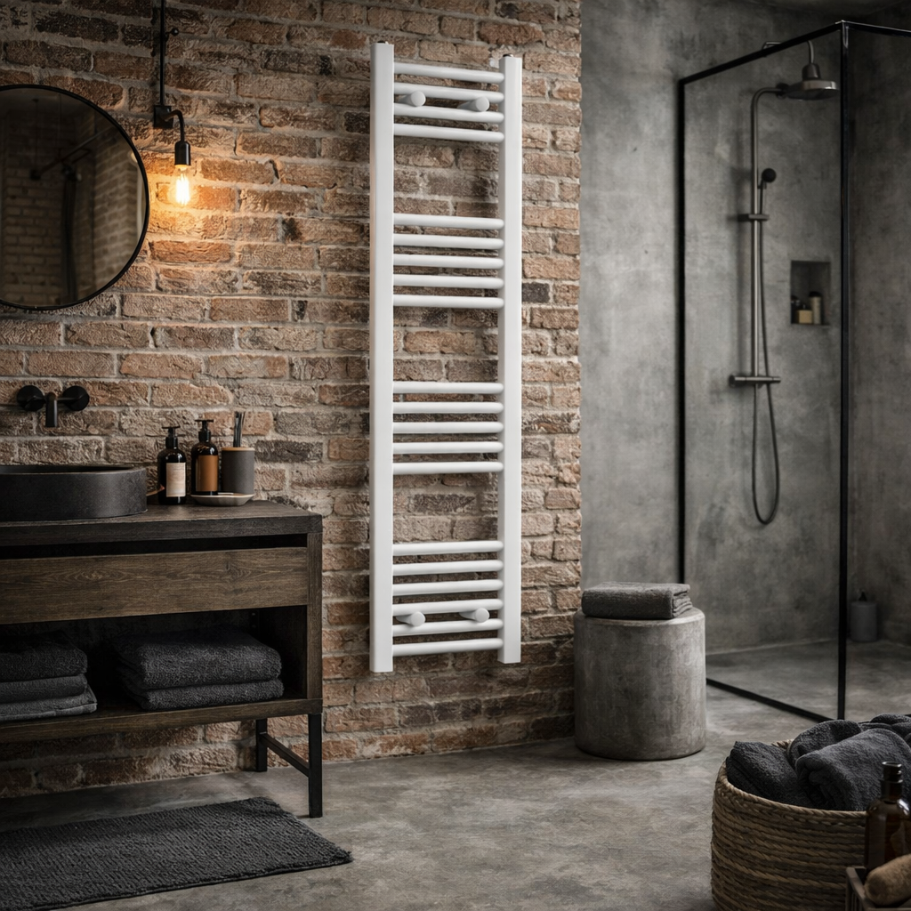 Smukła drabinkowa konstrukcja pozwala skutecznie ogrzać pomieszczenie, a jednocześnie zapewnia wygodne miejsce do suszenia ręczników oraz tekstyliów łazienkowych. Kompaktowy rozmiar 120 × 30 cm sprawia, że model doskonale sprawdzi się również w mniejszych łazienkach, gdzie liczy się każdy centymetr przestrzeni. Grzejnik wykonany został z trwałej stali odpornej na wilgoć i korozję, co gwarantuje jego niezawodność oraz estetyczny wygląd przez długi czas użytkowania. Białe wykończenie podkreśla nowoczesny charakter wnętrza i doskonale komponuje się z aranżacjami w stylu loftowym, industrialnym oraz minimalistycznym. Model przeznaczony jest do pracy w systemie centralnego ogrzewania, a jego konstrukcja umożliwia również zastosowanie grzałki elektrycznej, dzięki czemu z grzejnika można korzystać przez cały rok.