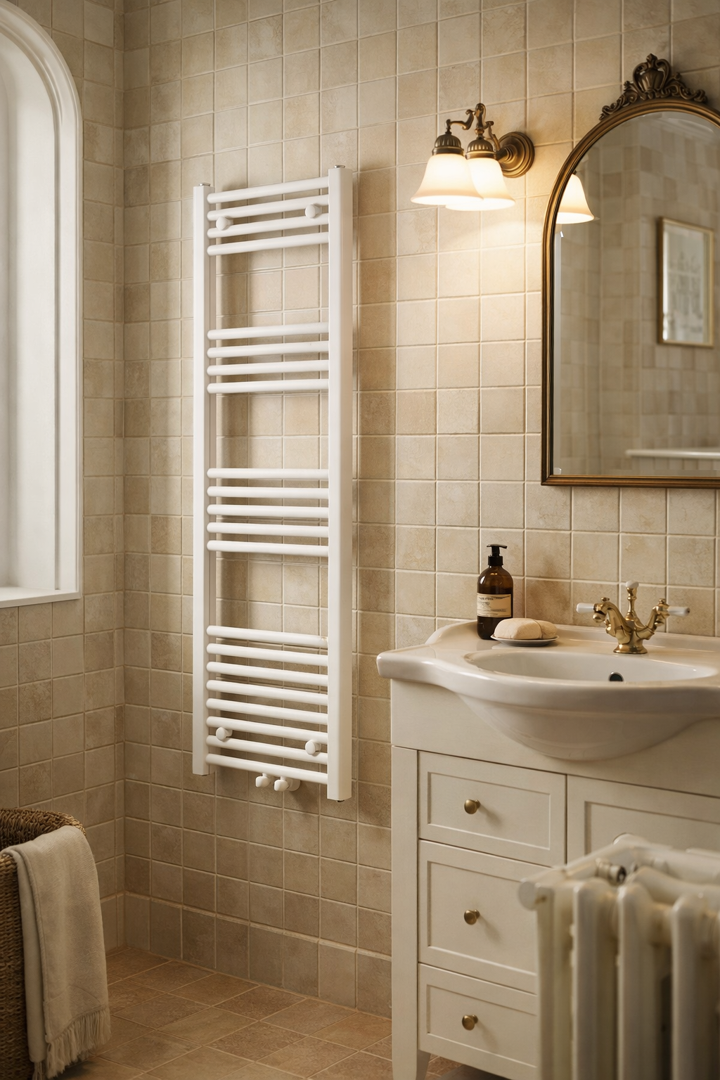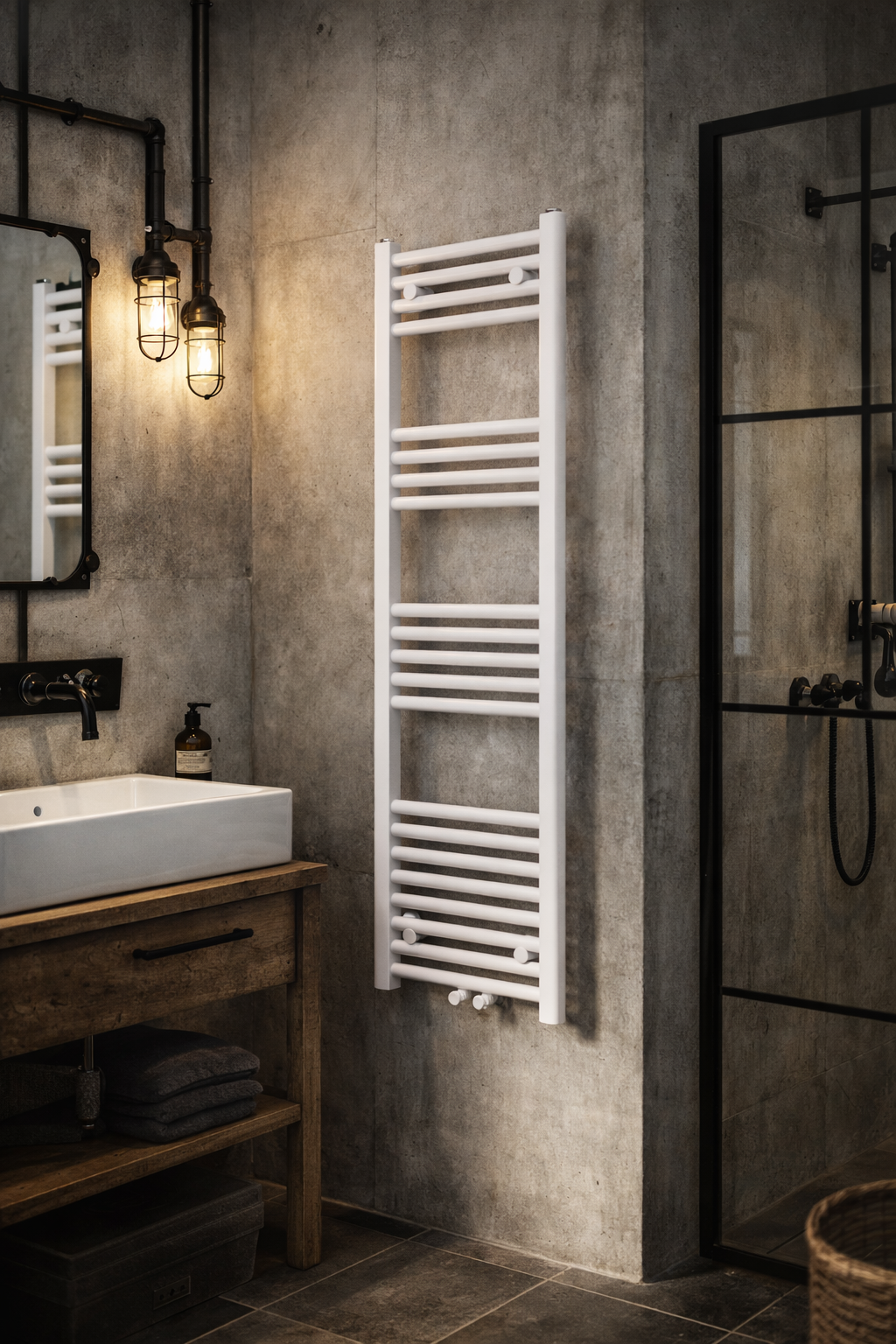 Smukła drabinkowa konstrukcja pozwala skutecznie ogrzać pomieszczenie, a jednocześnie zapewnia wygodne miejsce do suszenia ręczników oraz tekstyliów łazienkowych. Kompaktowy rozmiar 120 × 40 cm sprawia, że model doskonale sprawdzi się również w mniejszych łazienkach, gdzie liczy się każdy centymetr przestrzeni. Grzejnik wykonany został z trwałej stali odpornej na wilgoć i korozję, co gwarantuje jego niezawodność oraz estetyczny wygląd przez długi czas użytkowania. Białe wykończenie podkreśla nowoczesny charakter wnętrza i doskonale komponuje się z aranżacjami w stylu loftowym, industrialnym oraz minimalistycznym. Model przeznaczony jest do pracy w systemie centralnego ogrzewania, a jego konstrukcja umożliwia również zastosowanie grzałki elektrycznej, dzięki czemu z grzejnika można korzystać przez cały rok.