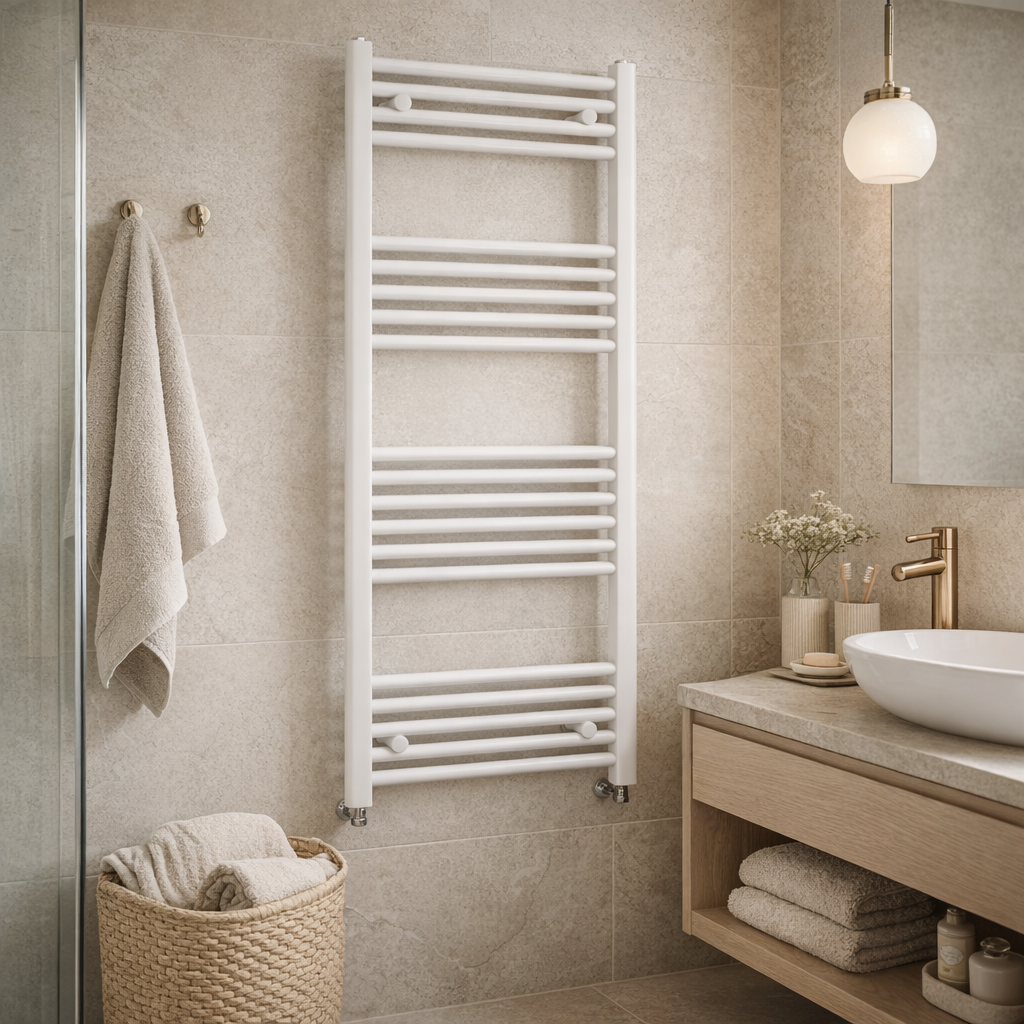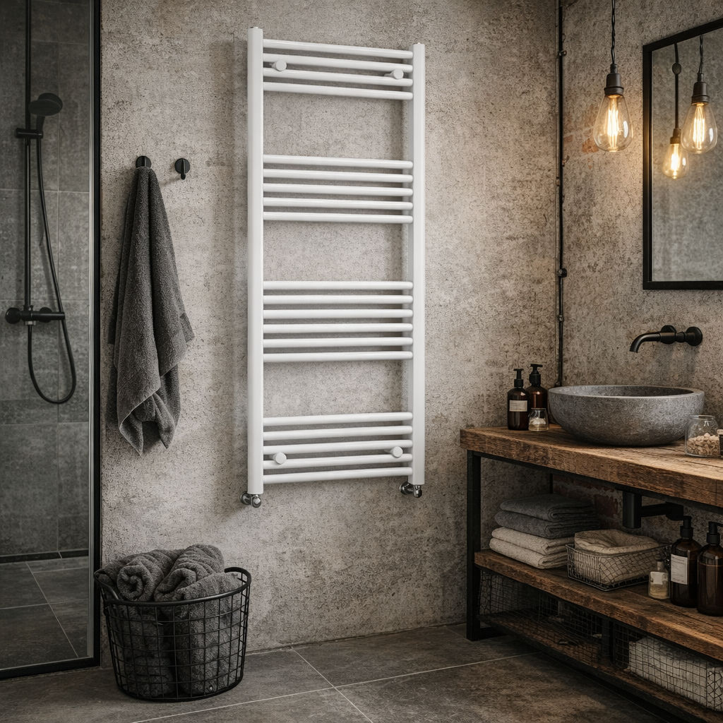 Smukła drabinkowa konstrukcja pozwala skutecznie ogrzać pomieszczenie, a jednocześnie zapewnia wygodne miejsce do suszenia ręczników oraz tekstyliów łazienkowych. Kompaktowy rozmiar 120 × 50 cm sprawia, że model doskonale sprawdzi się również w mniejszych łazienkach, gdzie liczy się każdy centymetr przestrzeni. Grzejnik wykonany został z trwałej stali odpornej na wilgoć i korozję, co gwarantuje jego niezawodność oraz estetyczny wygląd przez długi czas użytkowania. Białe wykończenie podkreśla nowoczesny charakter wnętrza i doskonale komponuje się z aranżacjami w stylu loftowym, industrialnym oraz minimalistycznym. Model przeznaczony jest do pracy w systemie centralnego ogrzewania, a jego konstrukcja umożliwia również zastosowanie grzałki elektrycznej, dzięki czemu z grzejnika można korzystać przez cały rok.