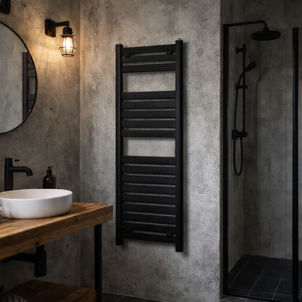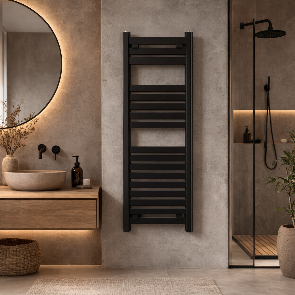 Jego prosta, geometryczna forma sprawia, że doskonale wpisuje się zarówno w minimalistyczne, jak i klasyczne aranżacje wnętrz, stanowiąc estetyczne i praktyczne wyposażenie łazienki. Drabinkowa konstrukcja zapewnia efektywne ogrzewanie pomieszczenia, a jednocześnie umożliwia wygodne suszenie ręczników oraz tekstyliów łazienkowych, zwiększając komfort codziennego użytkowania. Model wykonany został z trwałych materiałów odpornych na wilgoć, co gwarantuje długą żywotność oraz estetyczny wygląd przez wiele lat. Czarne wykończenie nadaje wnętrzu lekkości i pozwala łatwo dopasować grzejnik do różnych stylów aranżacyjnych.