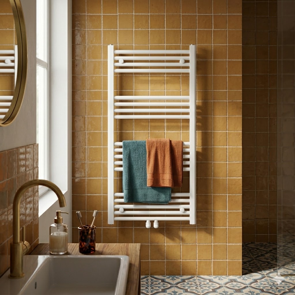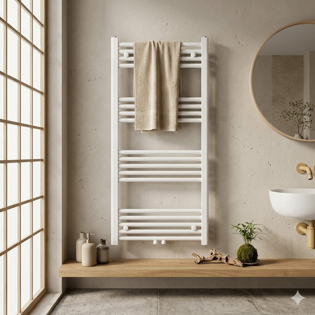Model BASER to nowoczesny grzejnik łazienkowy typu drabinka o wymiarach 120x60 cm, który łączy minimalistyczny design, wysoką wydajność oraz praktyczne zastosowanie na co dzień, dzięki czemu doskonale sprawdzi się zarówno w mniejszych, jak i większych łazienkach.