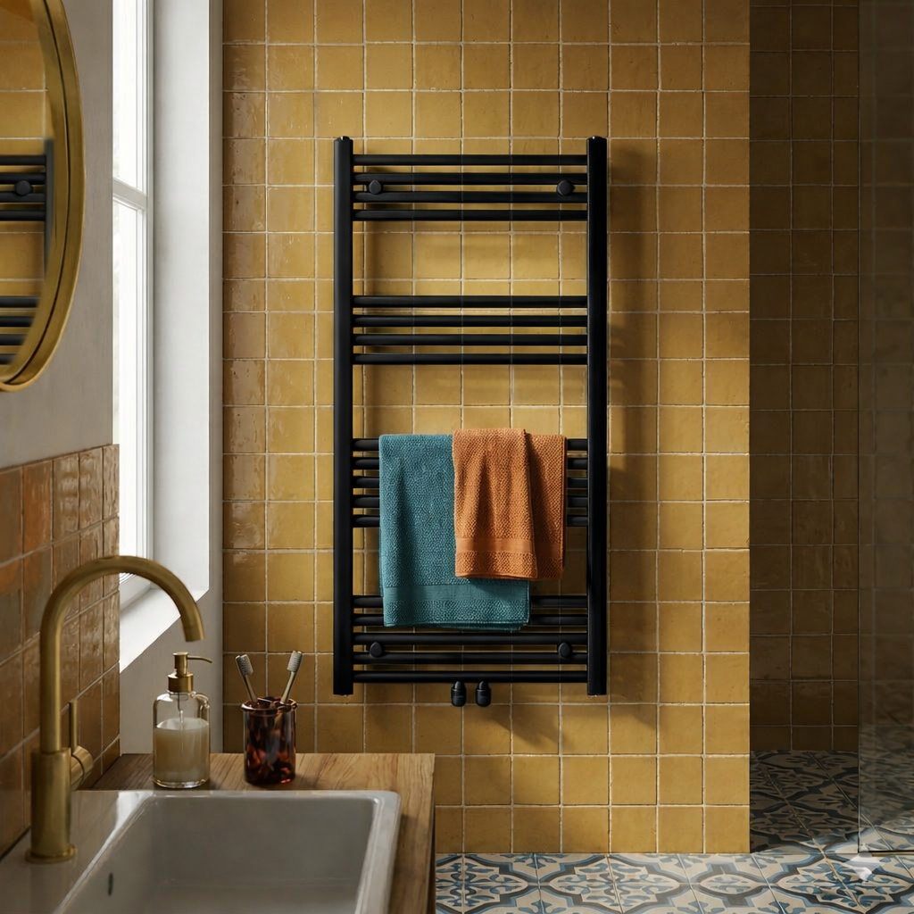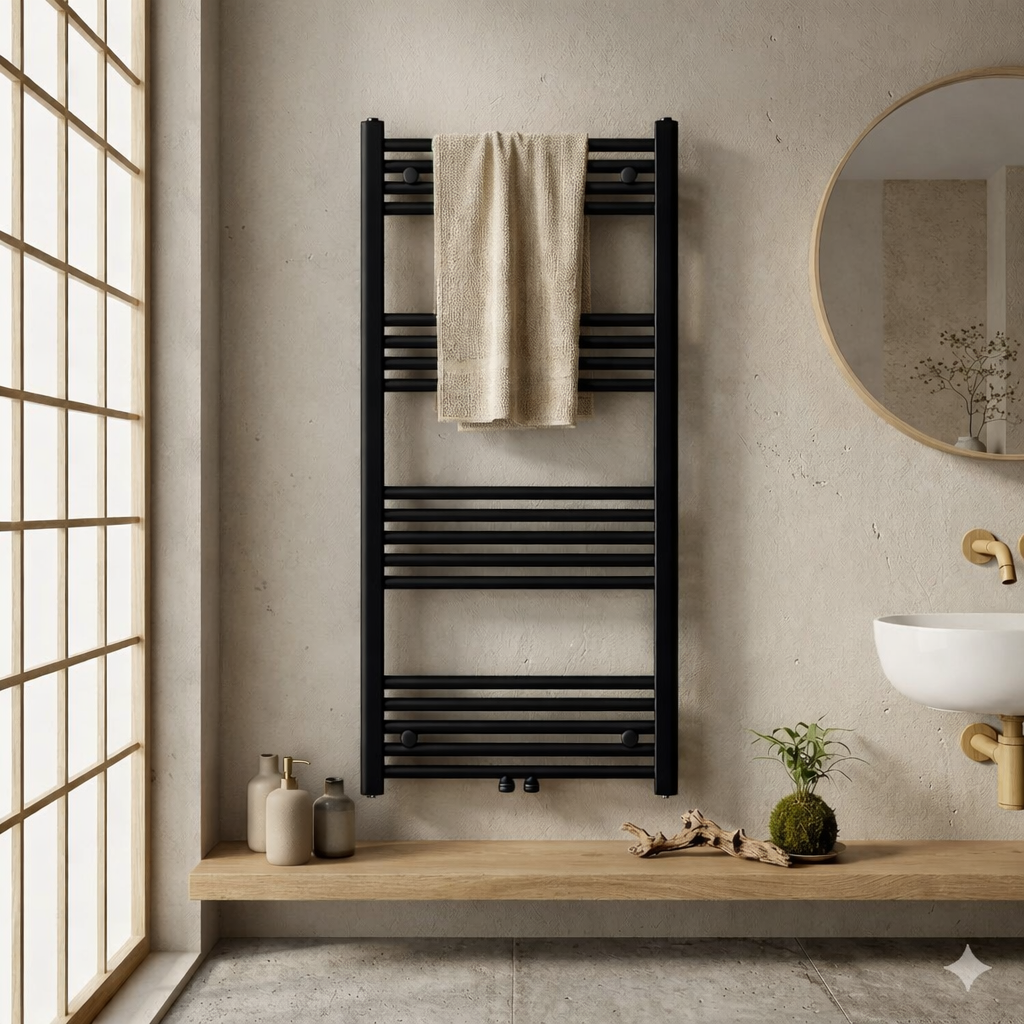 Model BASER to nowoczesny grzejnik łazienkowy typu drabinka o wymiarach 120x60 cm, który łączy minimalistyczny design, wysoką wydajność oraz praktyczne zastosowanie na co dzień, dzięki czemu doskonale sprawdzi się zarówno w mniejszych, jak i większych łazienkach.