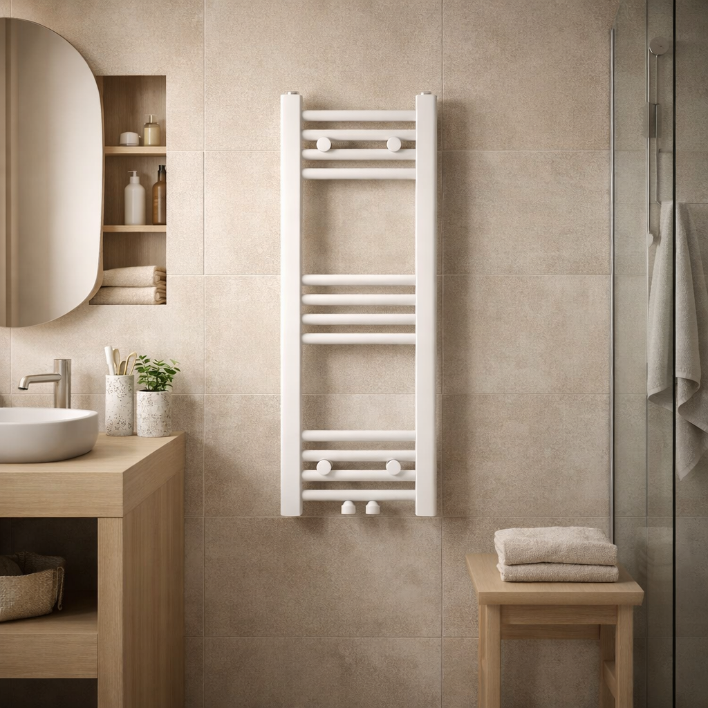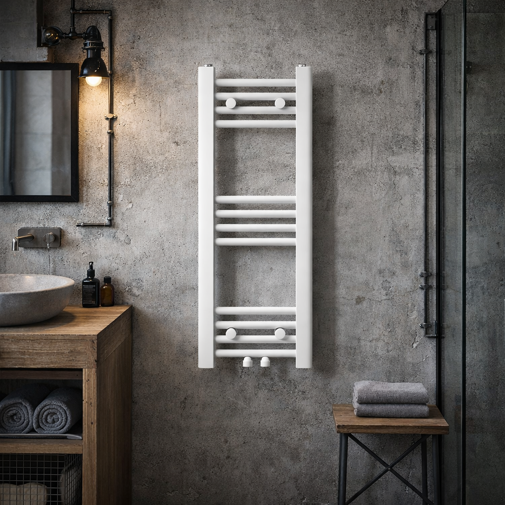Smukła drabinkowa konstrukcja pozwala skutecznie ogrzać pomieszczenie, a jednocześnie zapewnia wygodne miejsce do suszenia ręczników oraz tekstyliów łazienkowych. Kompaktowy rozmiar 80 × 30 cm sprawia, że model doskonale sprawdzi się również w mniejszych łazienkach, gdzie liczy się każdy centymetr przestrzeni. Grzejnik wykonany został z trwałej stali odpornej na wilgoć i korozję, co gwarantuje jego niezawodność oraz estetyczny wygląd przez długi czas użytkowania. Białe wykończenie podkreśla nowoczesny charakter wnętrza i doskonale komponuje się z aranżacjami w stylu loftowym, industrialnym oraz minimalistycznym. Model przeznaczony jest do pracy w systemie centralnego ogrzewania, a jego konstrukcja umożliwia również zastosowanie grzałki elektrycznej, dzięki czemu z grzejnika można korzystać przez cały rok.