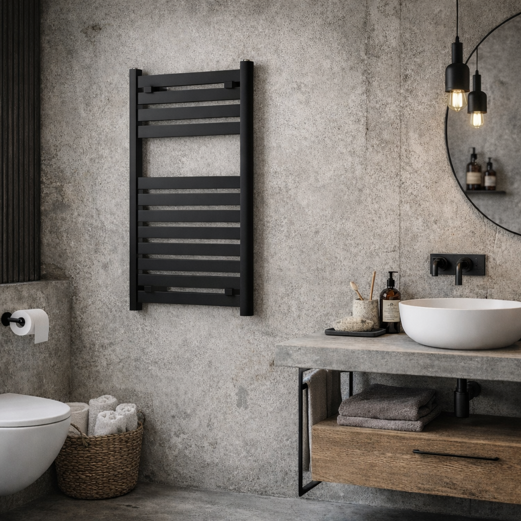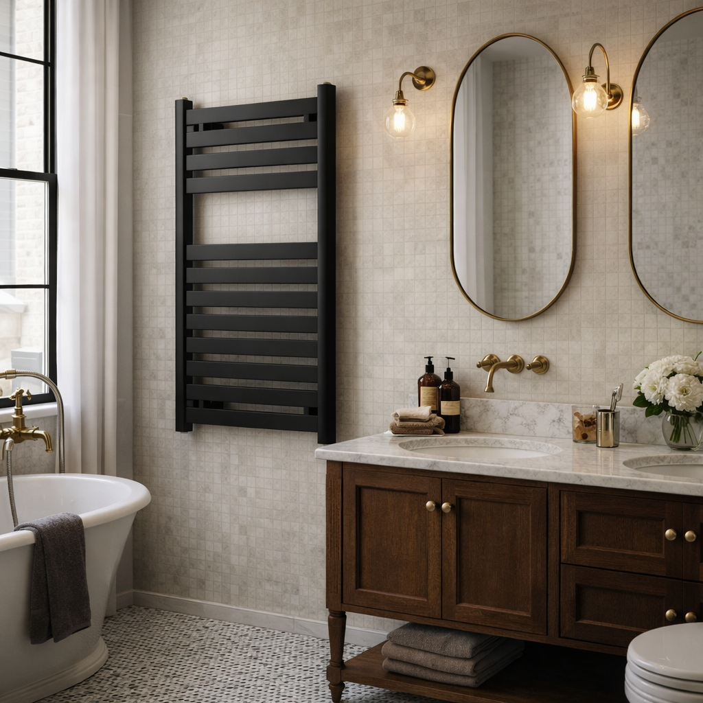 Jego prosta, geometryczna forma sprawia, że doskonale wpisuje się zarówno w minimalistyczne, jak i klasyczne aranżacje wnętrz, stanowiąc estetyczne i praktyczne wyposażenie łazienki. Drabinkowa konstrukcja zapewnia efektywne ogrzewanie pomieszczenia, a jednocześnie umożliwia wygodne suszenie ręczników oraz tekstyliów łazienkowych, zwiększając komfort codziennego użytkowania. Model wykonany został z trwałych materiałów odpornych na wilgoć, co gwarantuje długą żywotność oraz estetyczny wygląd przez wiele lat. Czarne wykończenie nadaje wnętrzu lekkości i pozwala łatwo dopasować grzejnik do różnych stylów aranżacyjnych.