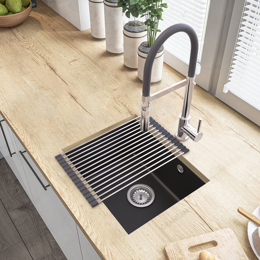 Ociekarka, składana mata do zlewu wykonana ze stali nierdzewnej oraz tworzywa PCV, w kolorze czarny/srebrny. Możliwość regulacji - zwijana. Materiały użyte podczas produkcji gwarantują trwałość i stabilność.