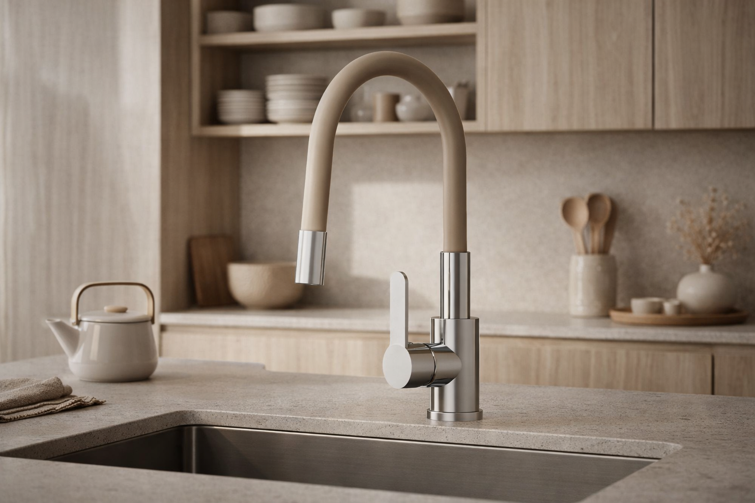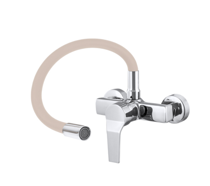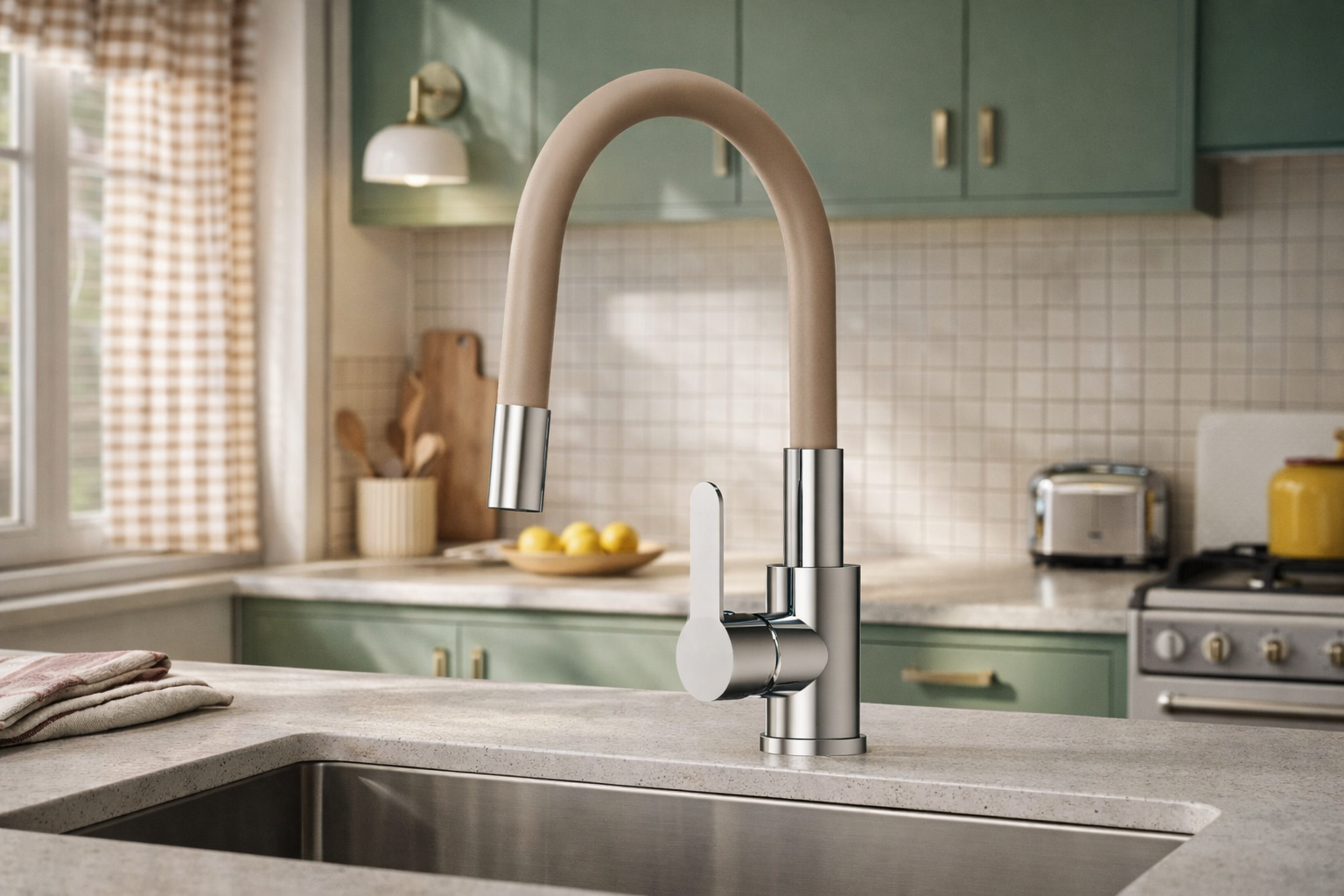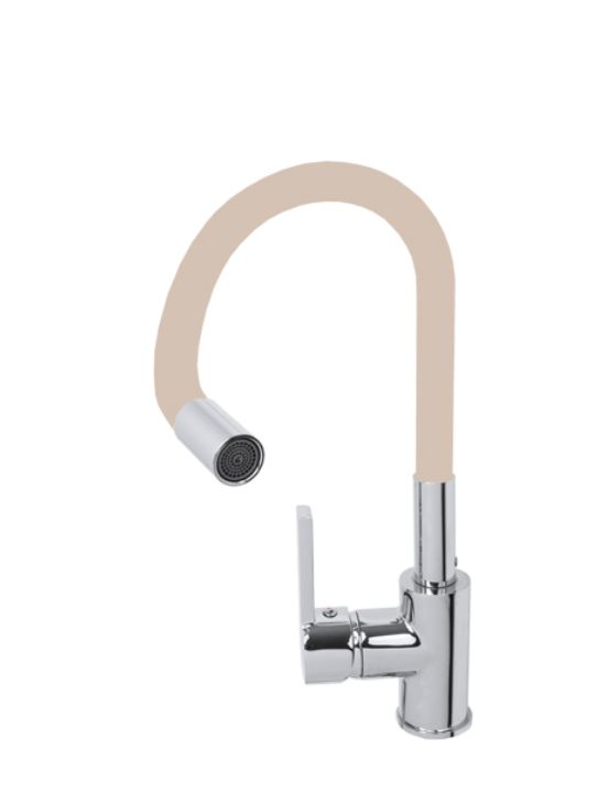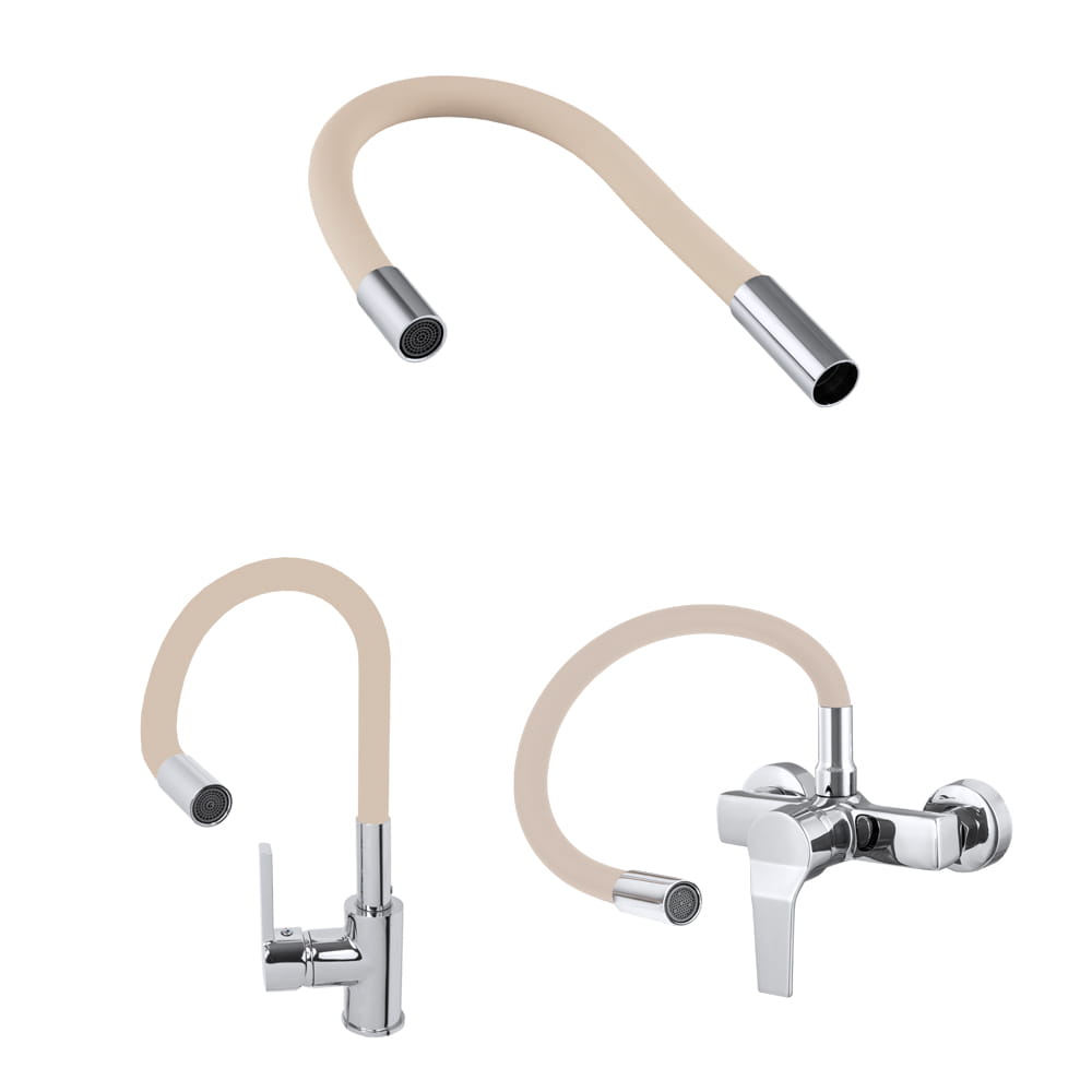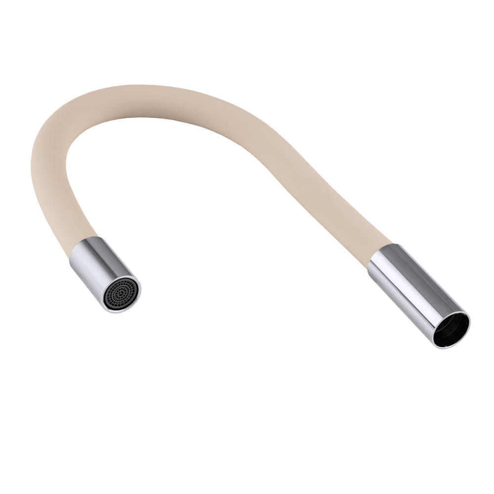 Model w beżowym wykończeniu z elastycznym, gumowym oplotem wyróżnia się nowoczesnym i estetycznym wyglądem, a chromowane końcówki podkreślają trwałość i odporność na korozję. Wylewka została wykonana ze stali nierdzewnej oraz wytrzymałej gumy, co zapewnia długą żywotność i odporność na intensywne użytkowanie. Elastyczna konstrukcja umożliwia wygodne kierowanie strumieniem wody w dowolnym kierunku, ułatwiając mycie naczyń, płukanie komory zlewu oraz napełnianie większych garnków. Długość 51,5 cm zapewnia większy zasięg pracy i komfort użytkowania. Zastosowane przyłącze wciskane 22,5 mm gwarantuje szybki i intuicyjny montaż bez konieczności stosowania dodatkowych gwintów. Model MODER to uniwersalne i funkcjonalne rozwiązanie pasujące do różnych aranżacji kuchennych.
