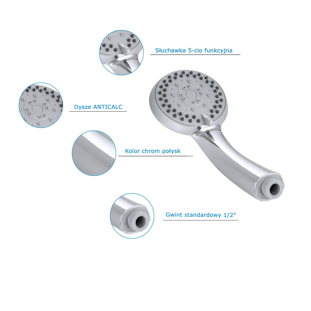 Słuchawka 8003 prysznicowa 5-funkcyjna, o wysokiej jakości, wykonana z tworzywa PCV, w kolorze chrom / połysk. Gwint standardowy 1/2''. Powłokaodporna na przebarwienia i wysoką temperaturę. Dysze z systemem Anticalc. Pasuje do każdego węża. * W asortymencie posiadamy również inne modele słuchawek.