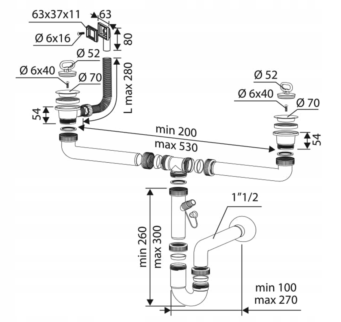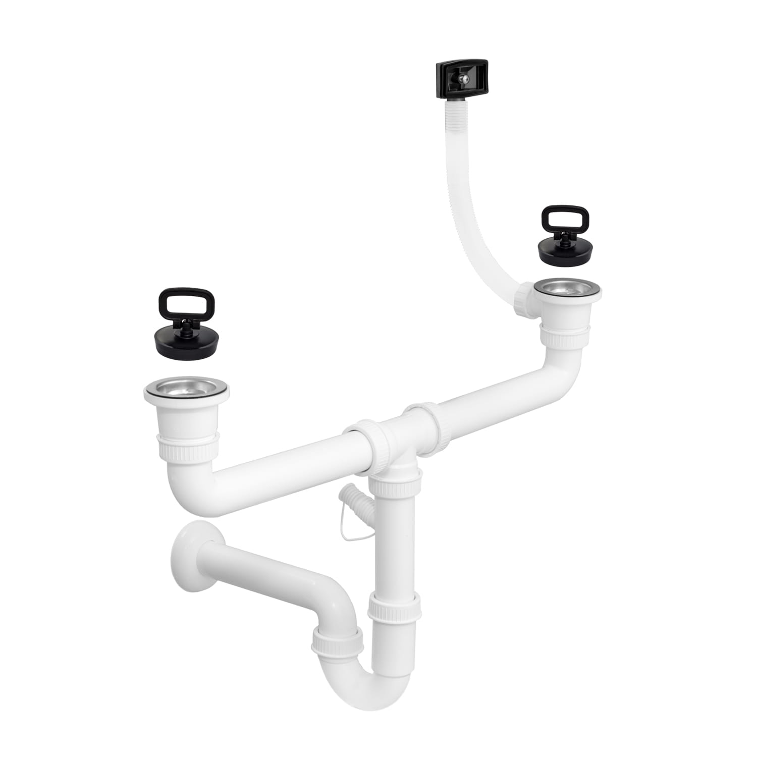 Syfon do zlewu dwukomorowego z przelewem kwadratowym, w kolorze białym, o wysokiej jakości. Wykonany z tworzywa PP. Rozmiar standardowy. Pasuje do zlewozmywaków z otworami fi 70.