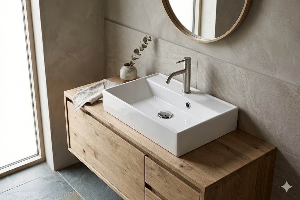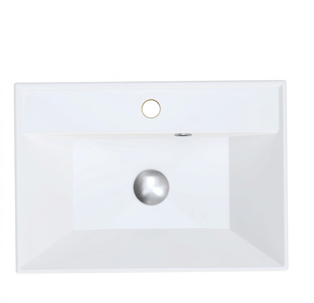 Umywalka biała łazienkowa naszafkowa dolomit prostokątna z baterią HILOX