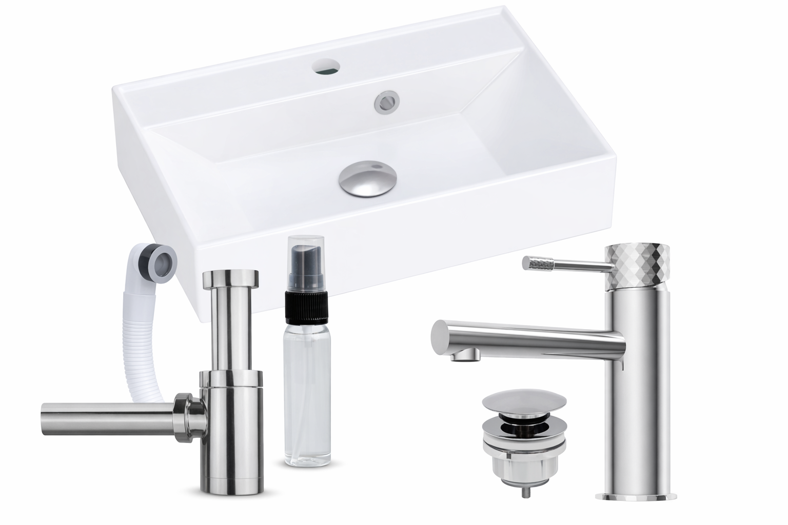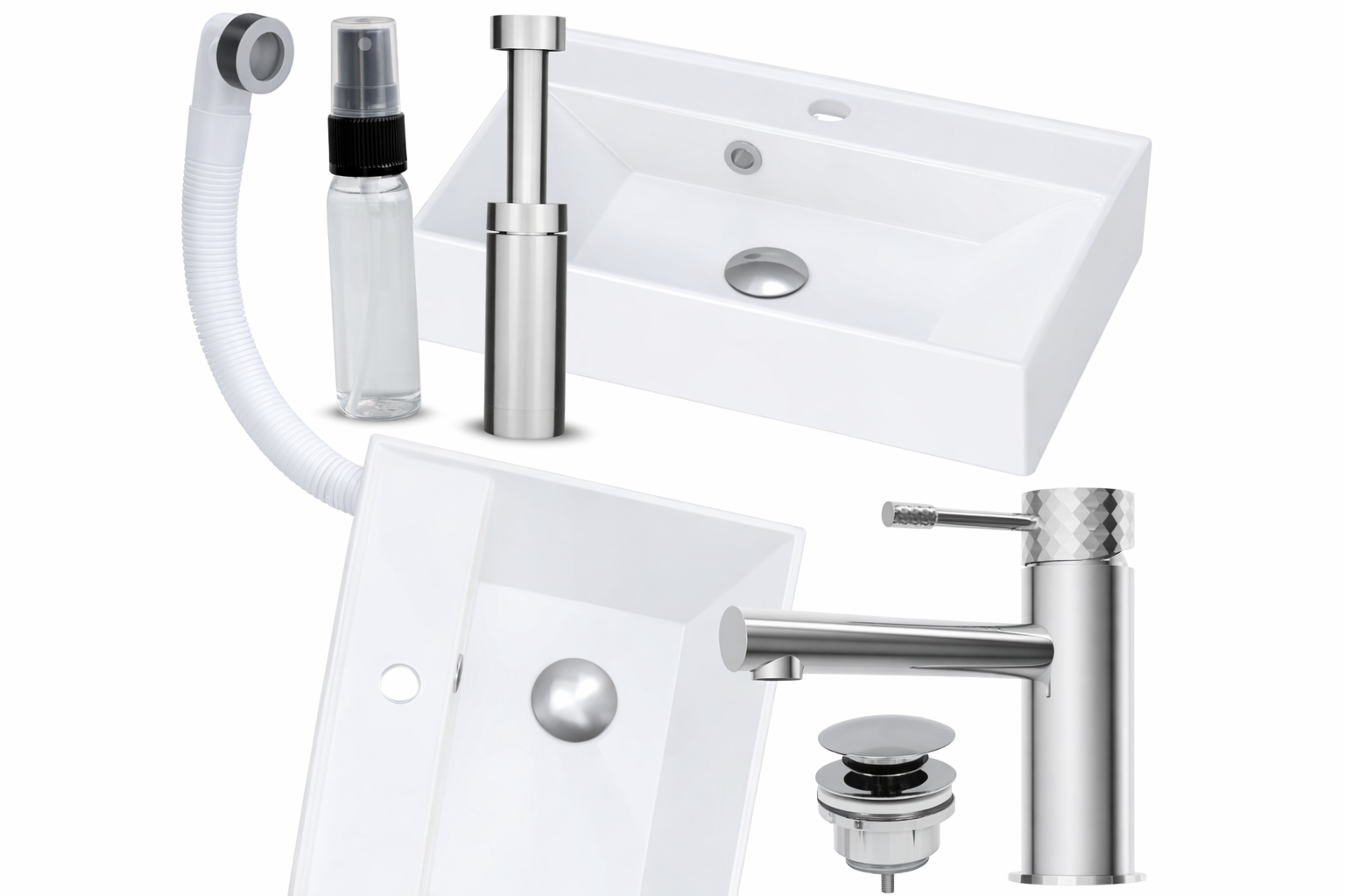 Umywalka HILOX 50 to kompletne i nowoczesne rozwiązanie stworzone dla osób, które cenią wygodę, estetykę i oszczędność czasu, ponieważ w jednym zestawie otrzymujesz umywalkę, chromowaną baterię oraz wszystkie niezbędne akcesoria, tworząc spójny i funkcjonalny zestaw 8w1 gotowy do montażu i użytkowania od pierwszego dnia.